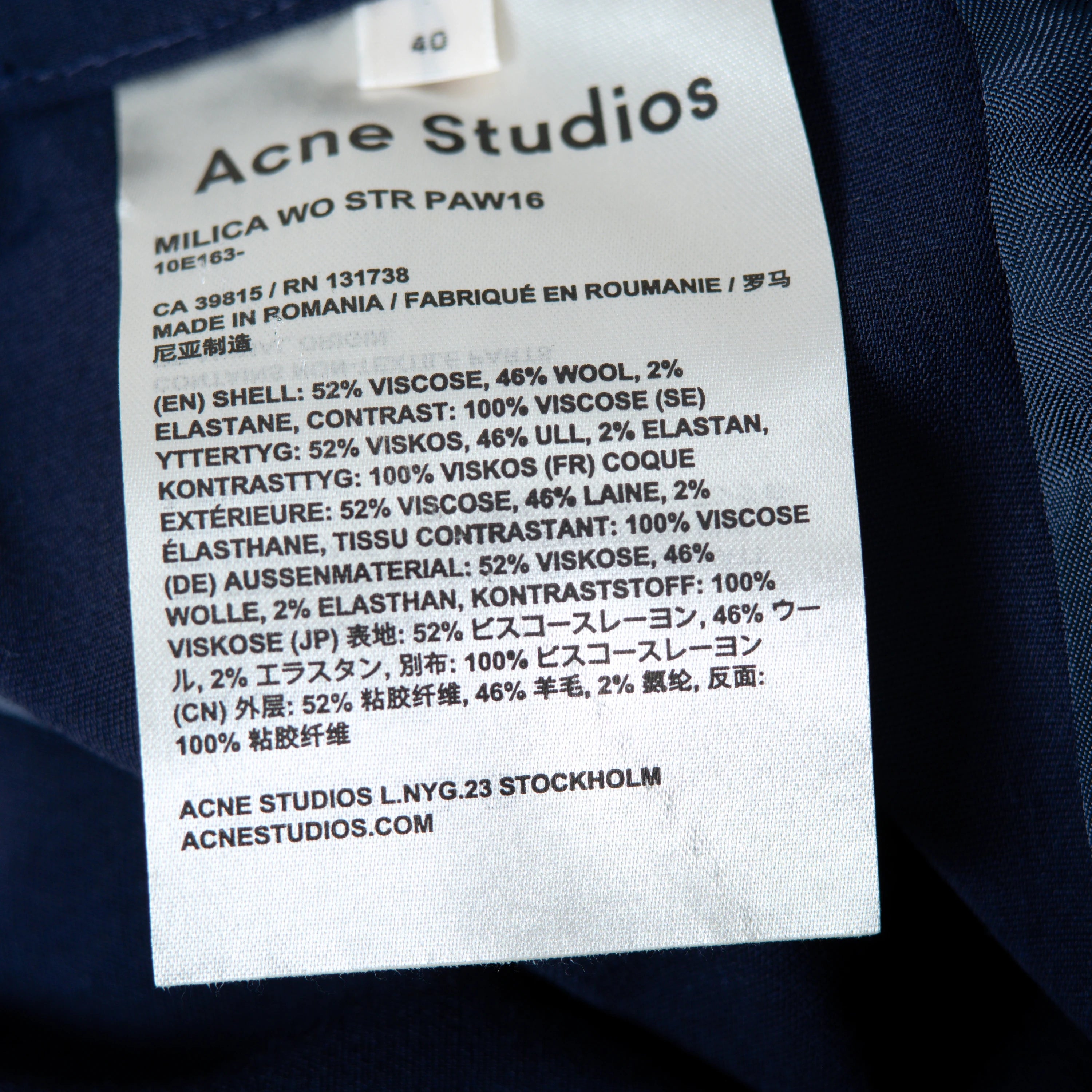 Tailored Acne Studios Milica pants from the Pre-Autumn/Winter 2016 collection, crafted in a navy wool-viscose blend with a tapered fit and elastic satin waistband. Modern design meets everyday sophistication.