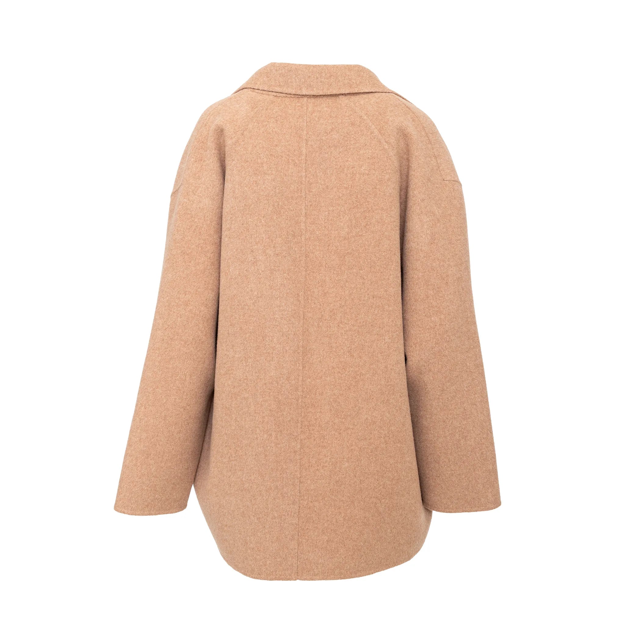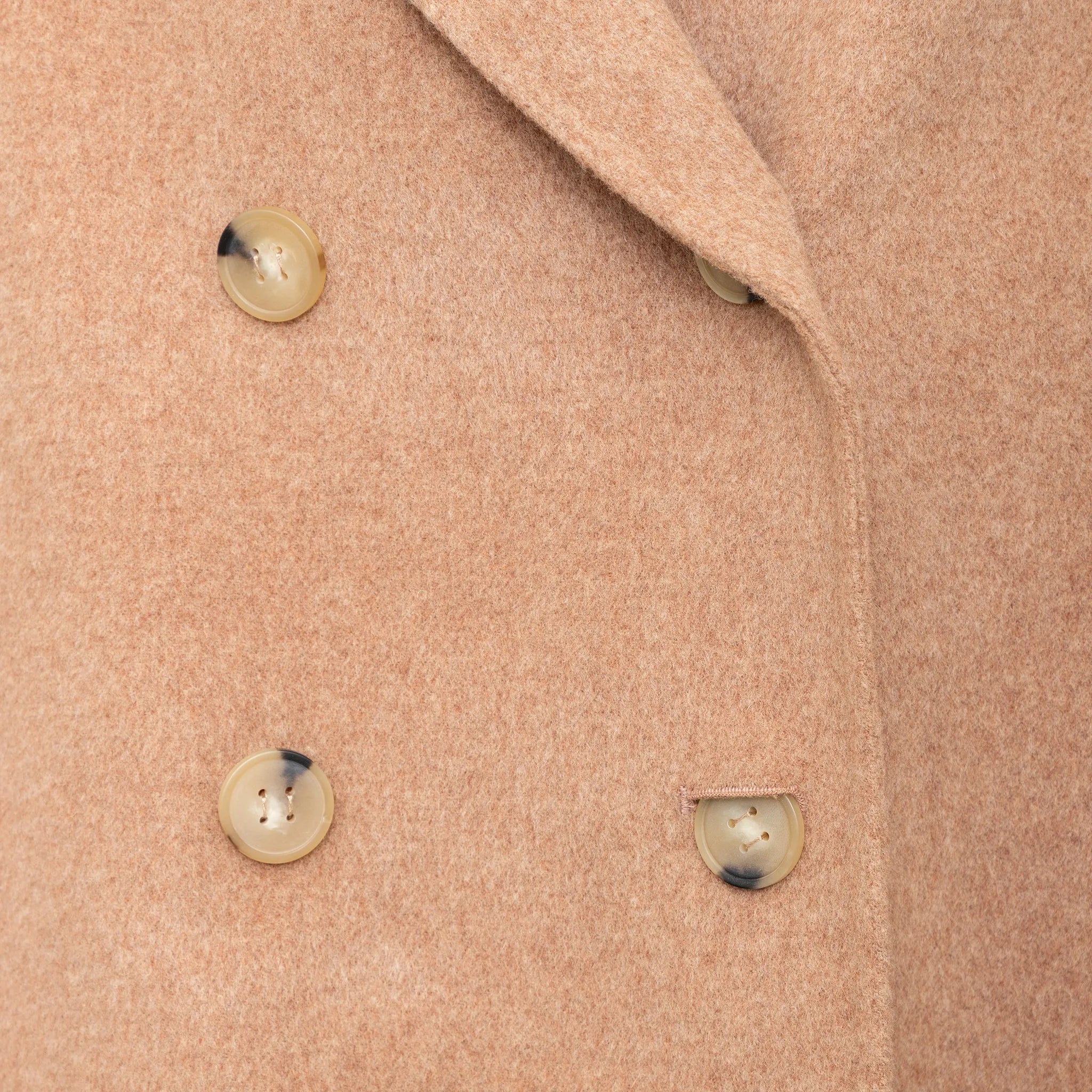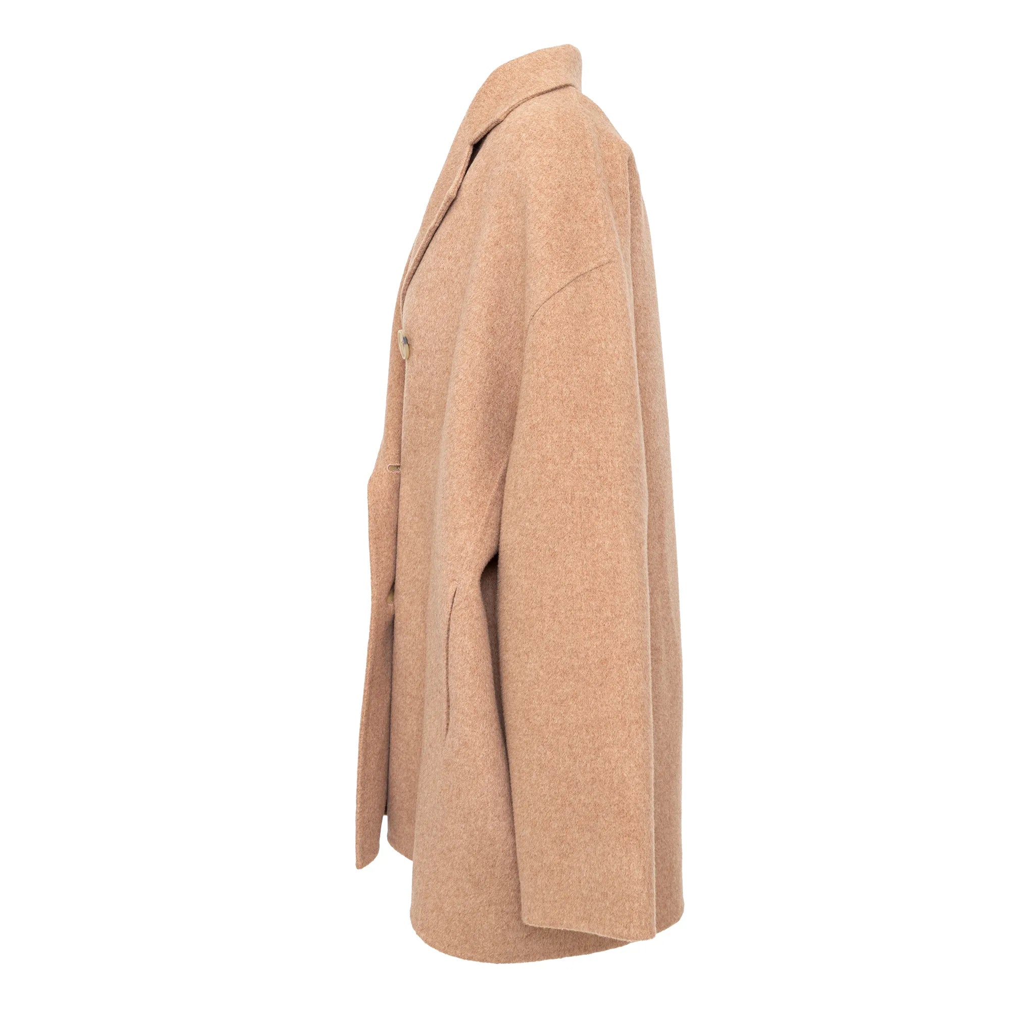 Acne Studios double-breasted wool coat in khaki beige, crafted from soft wool with a smooth feel. Features covered buttons, slanted pockets, and relaxed fit.