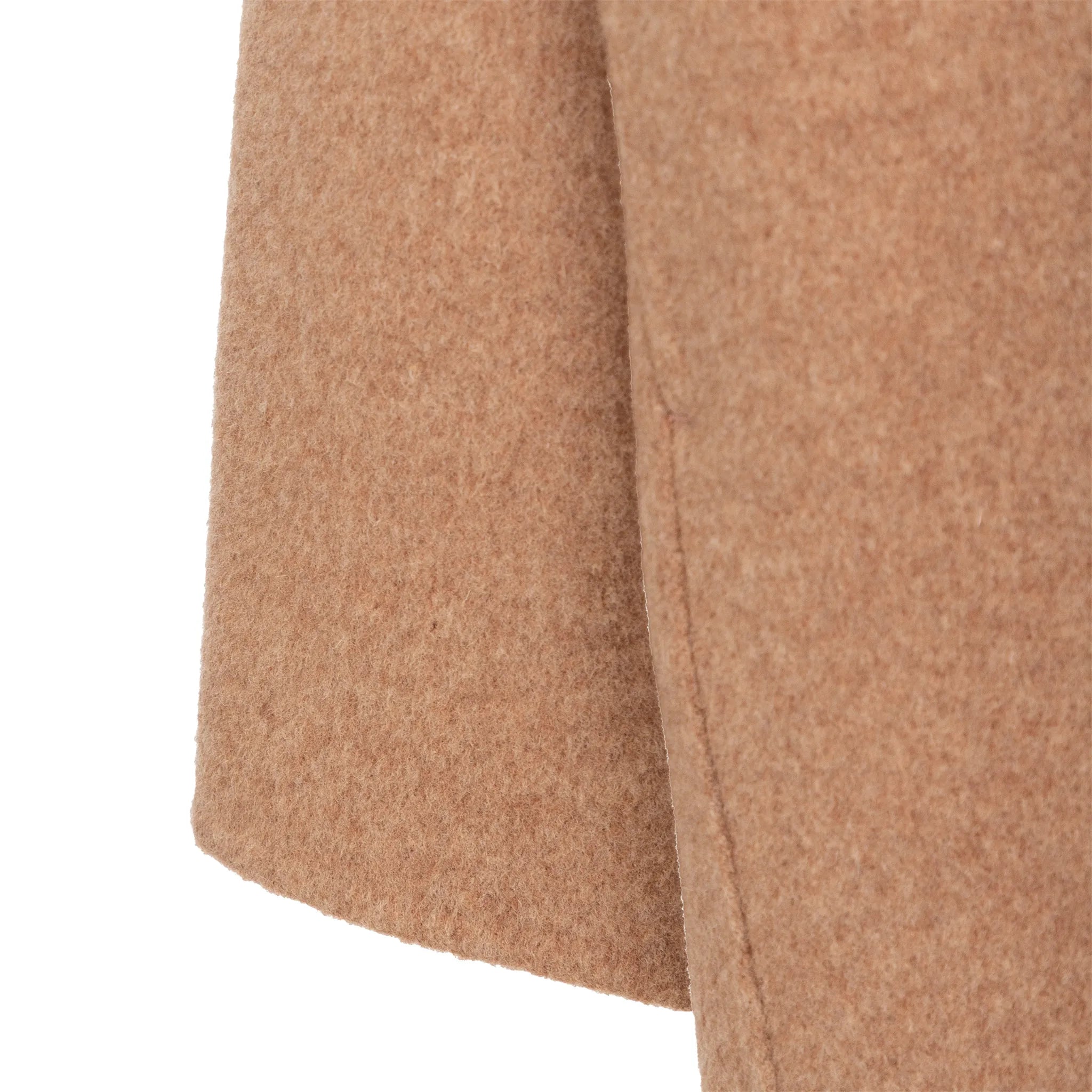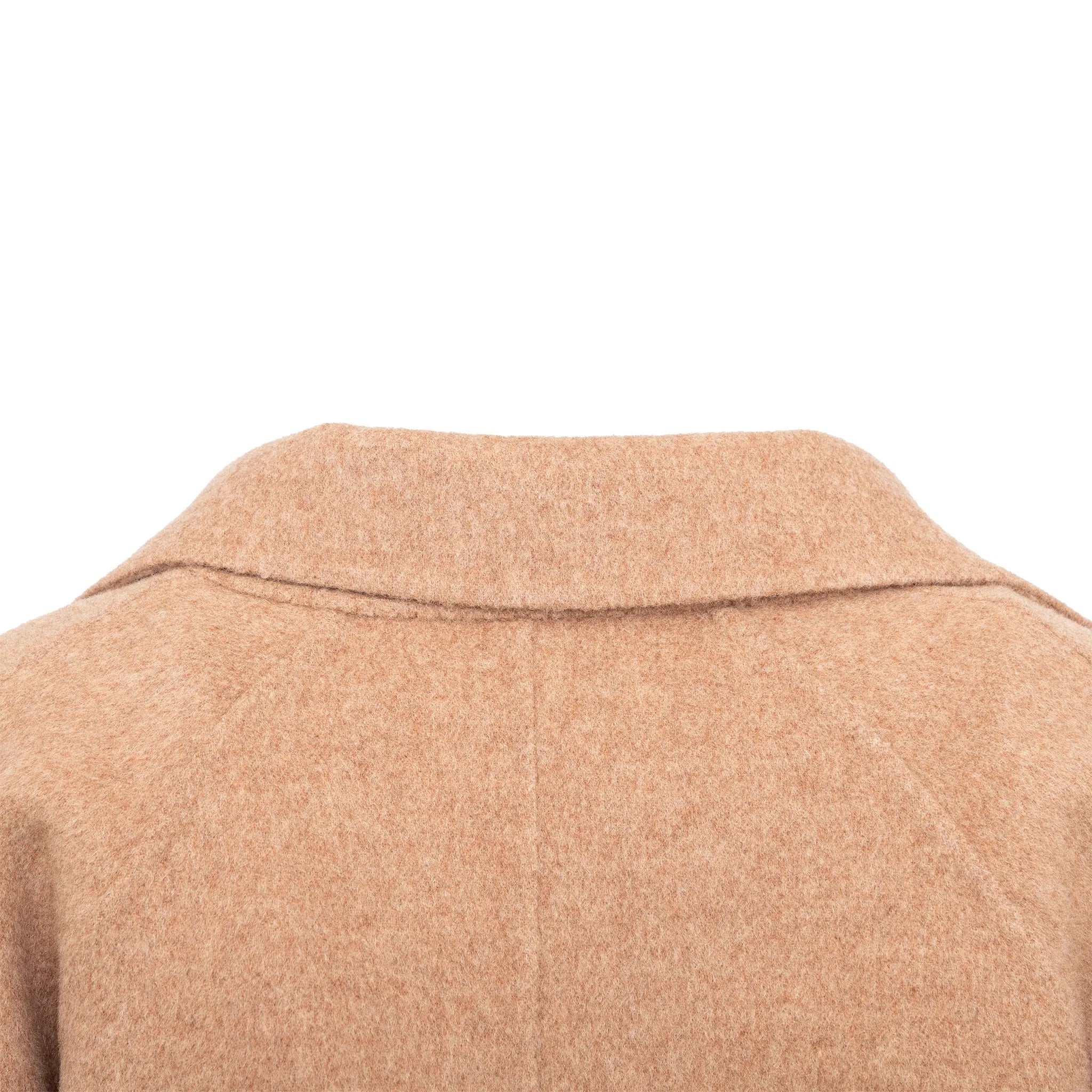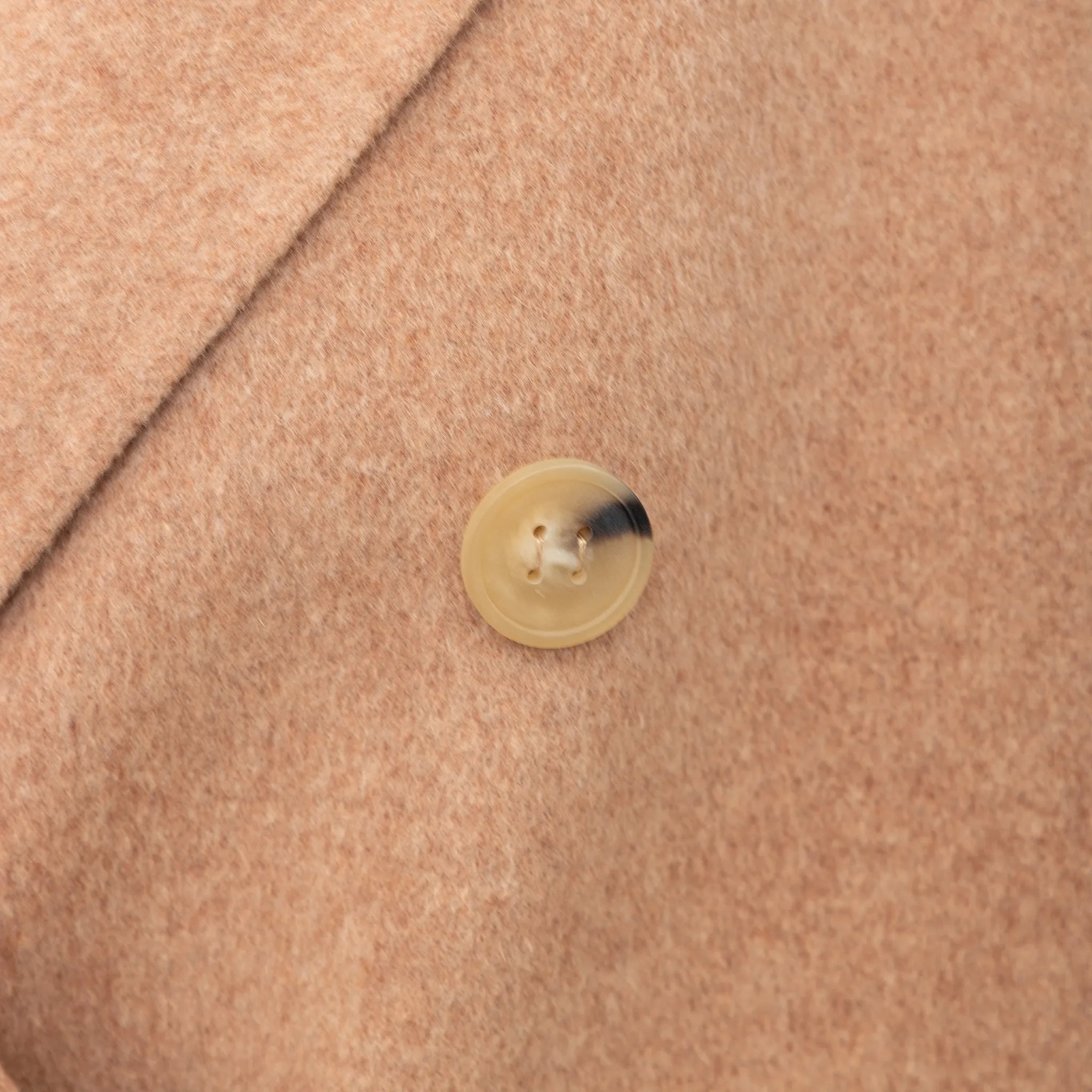 Acne Studios double-breasted wool coat in khaki beige, crafted from soft wool with a smooth feel. Features covered buttons, slanted pockets, and relaxed fit.