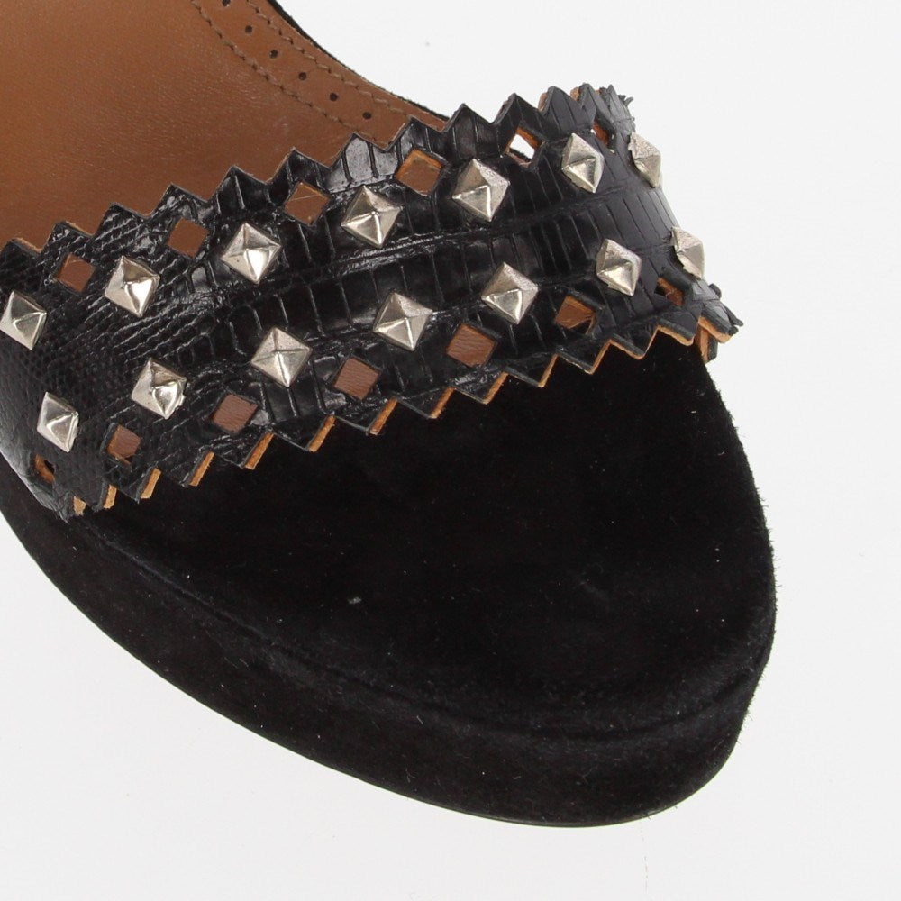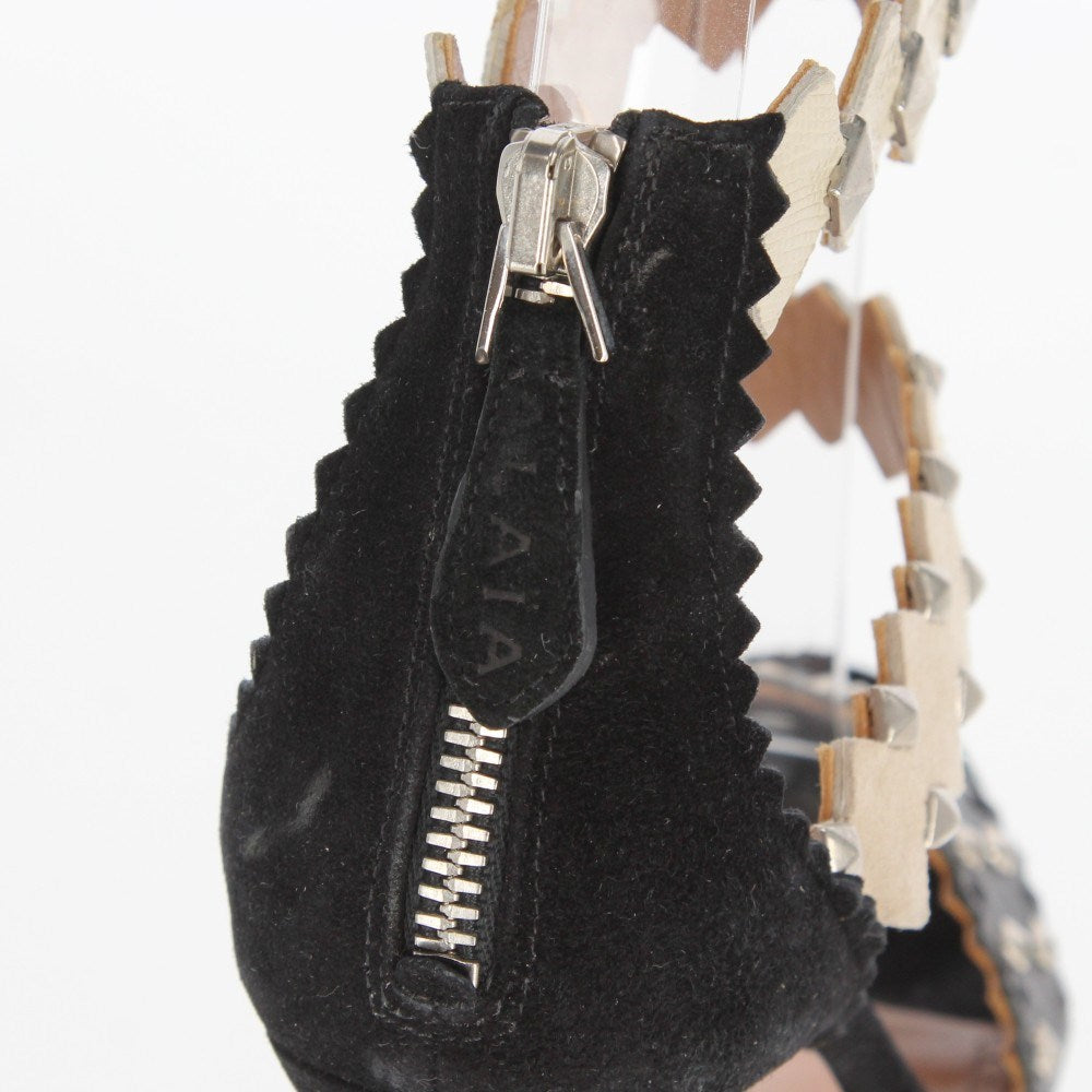 Alaïa 2020s black and beige leather and suede pumps. Open-toe, plateau and stiletto heel. Studded straps and back zip fastening.