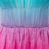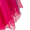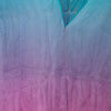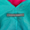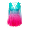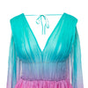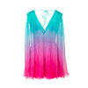 Alberta Ferretti evening dress with a deep V-neck, back knot closure, ombre gradient, pleated design, and a flowing cape panel for an elegant, unique look.