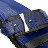 These open sandals in blue leather feature two straps with black trimming and embossed snakeskin accents, blending modern style with unique texture for a bold look.