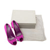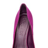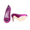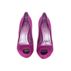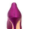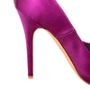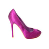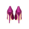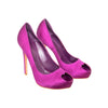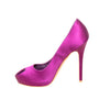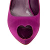Bold fuchsia satin pumps with a flirty front cut-out in a heart shape, open toe, and sleek stiletto heel. A sharp design that blends bold form with feminine detail.