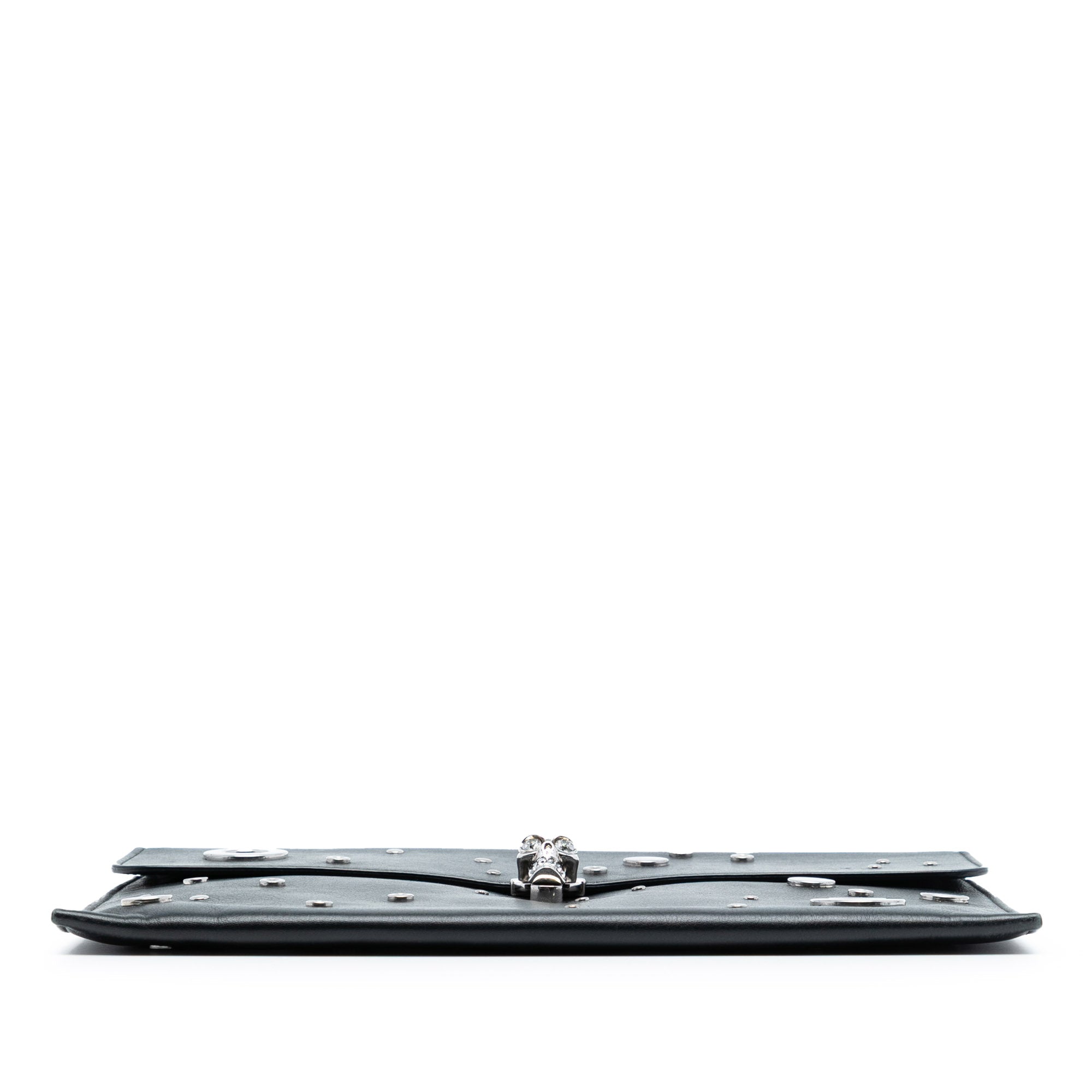 This clutch bag features a studded leather body, a front flap with magnetic snap closure and skull details, an interior zip compartment, and interior slip pockets. Retail Price: 2450.00