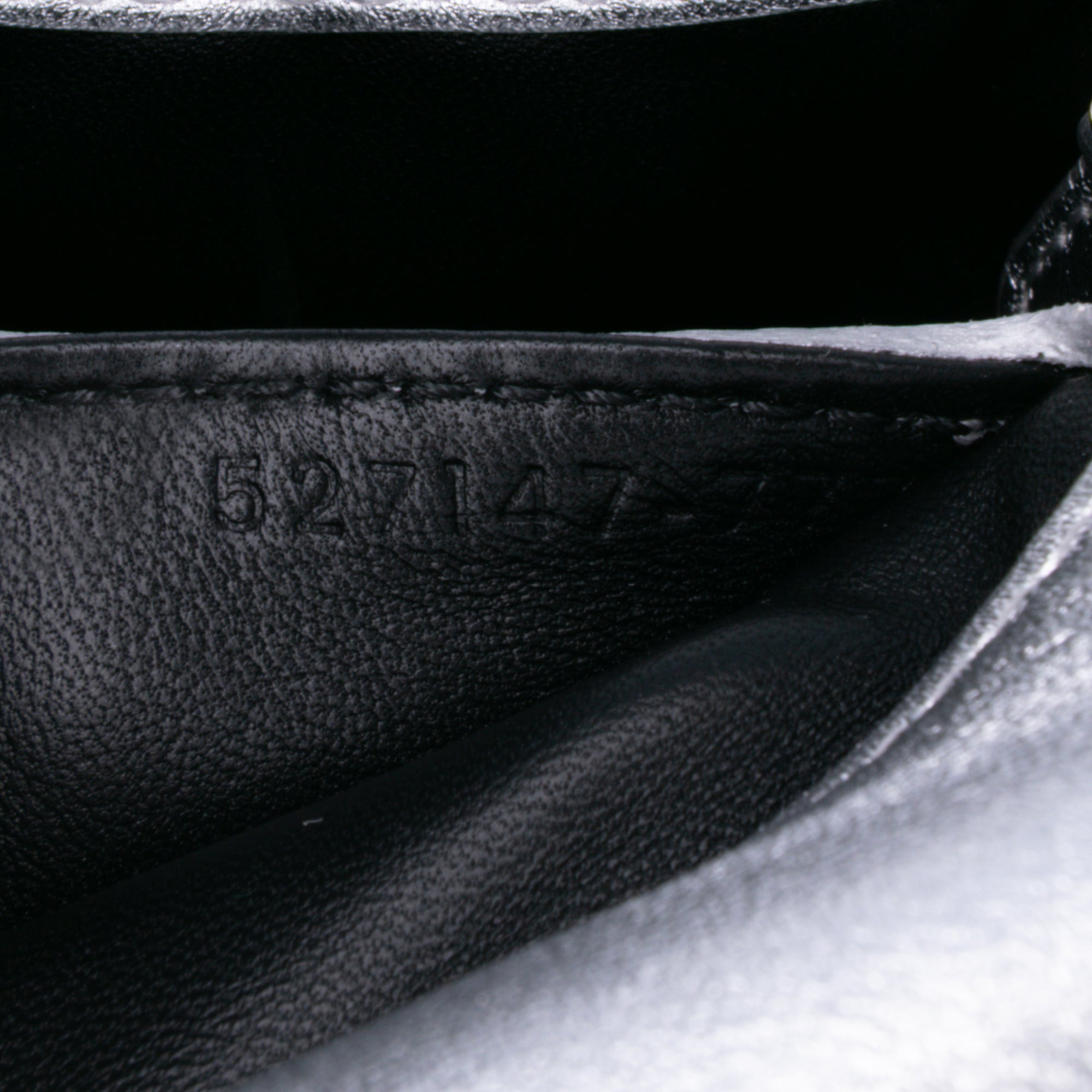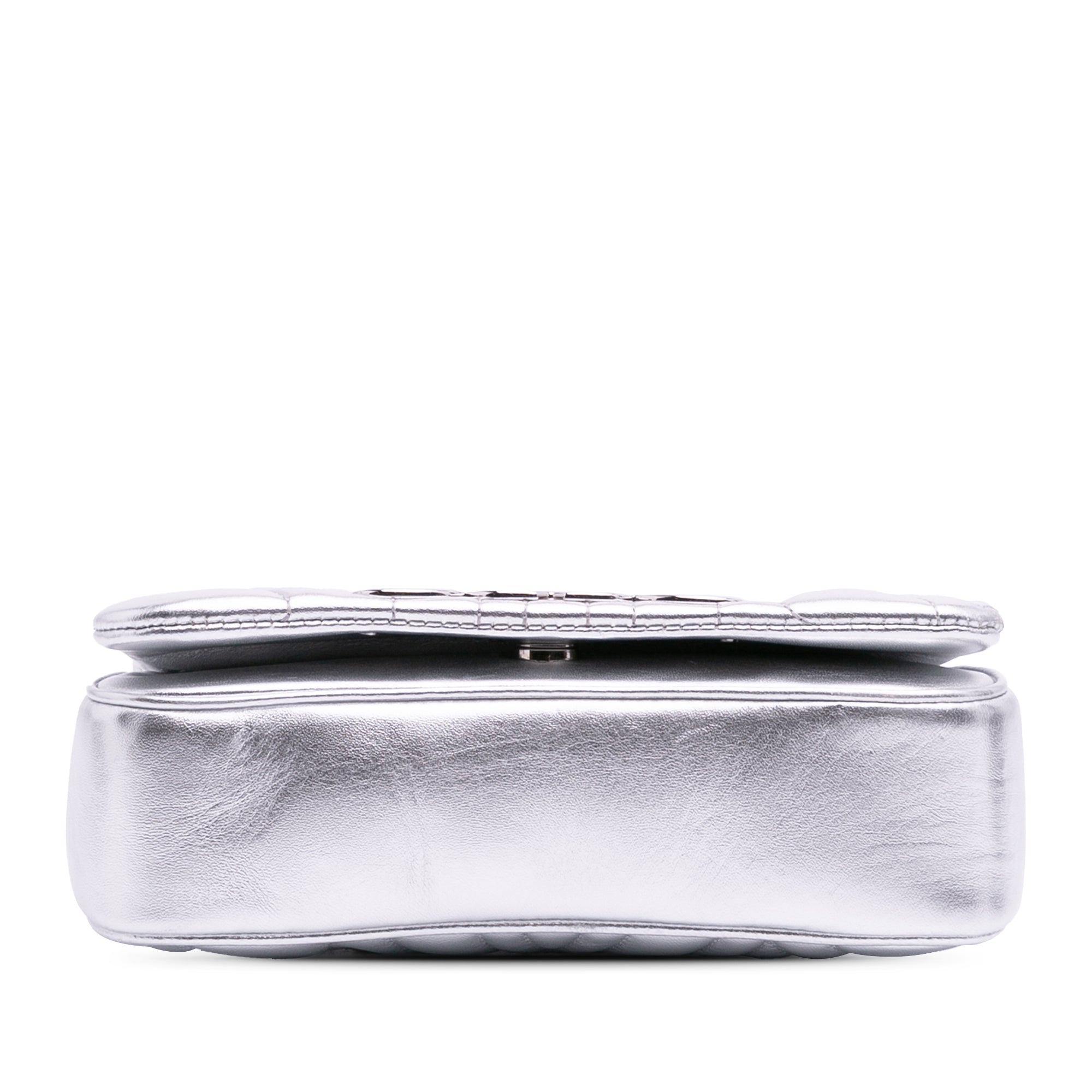 This crossbody features metallic silver leather body, a chain link strap, a front flap with magnetic button closure, and an interior slip pocket. Retail Price: 1559.00