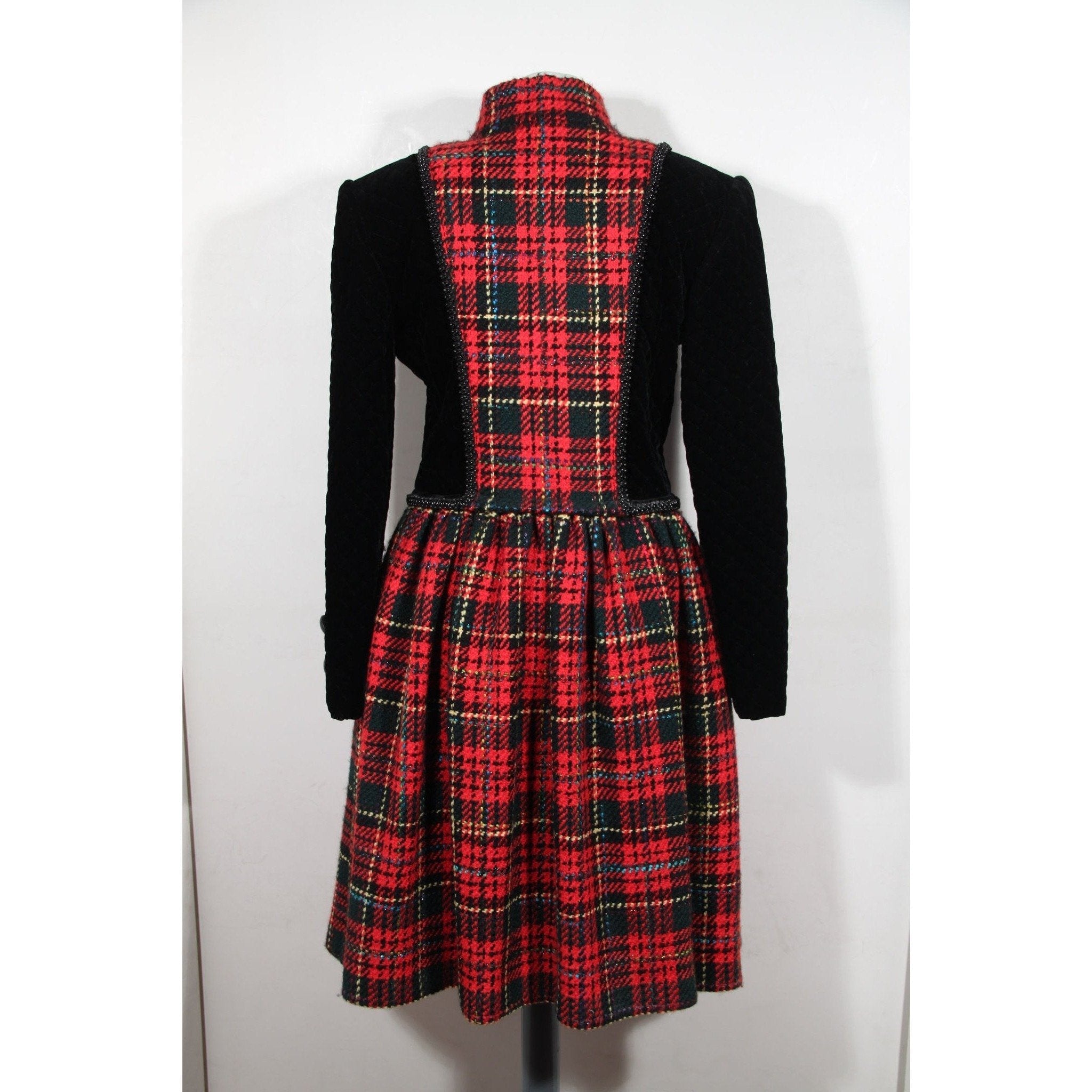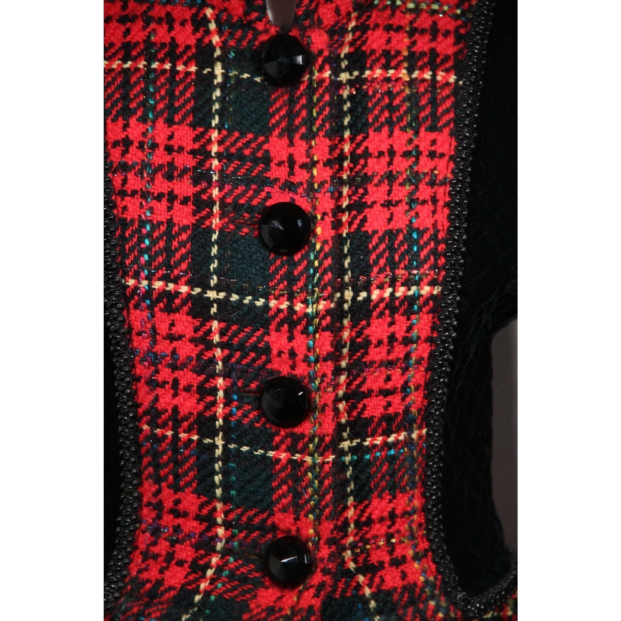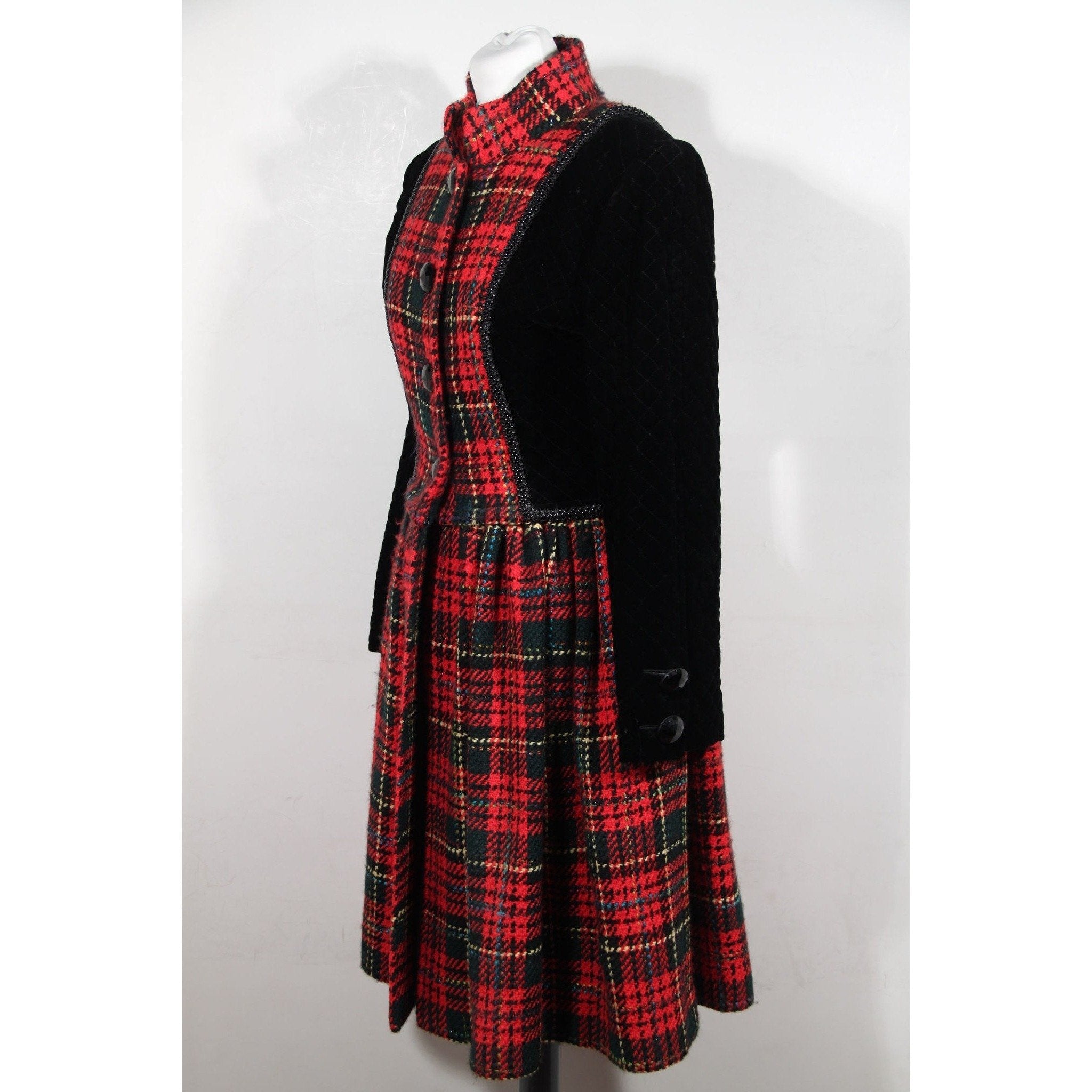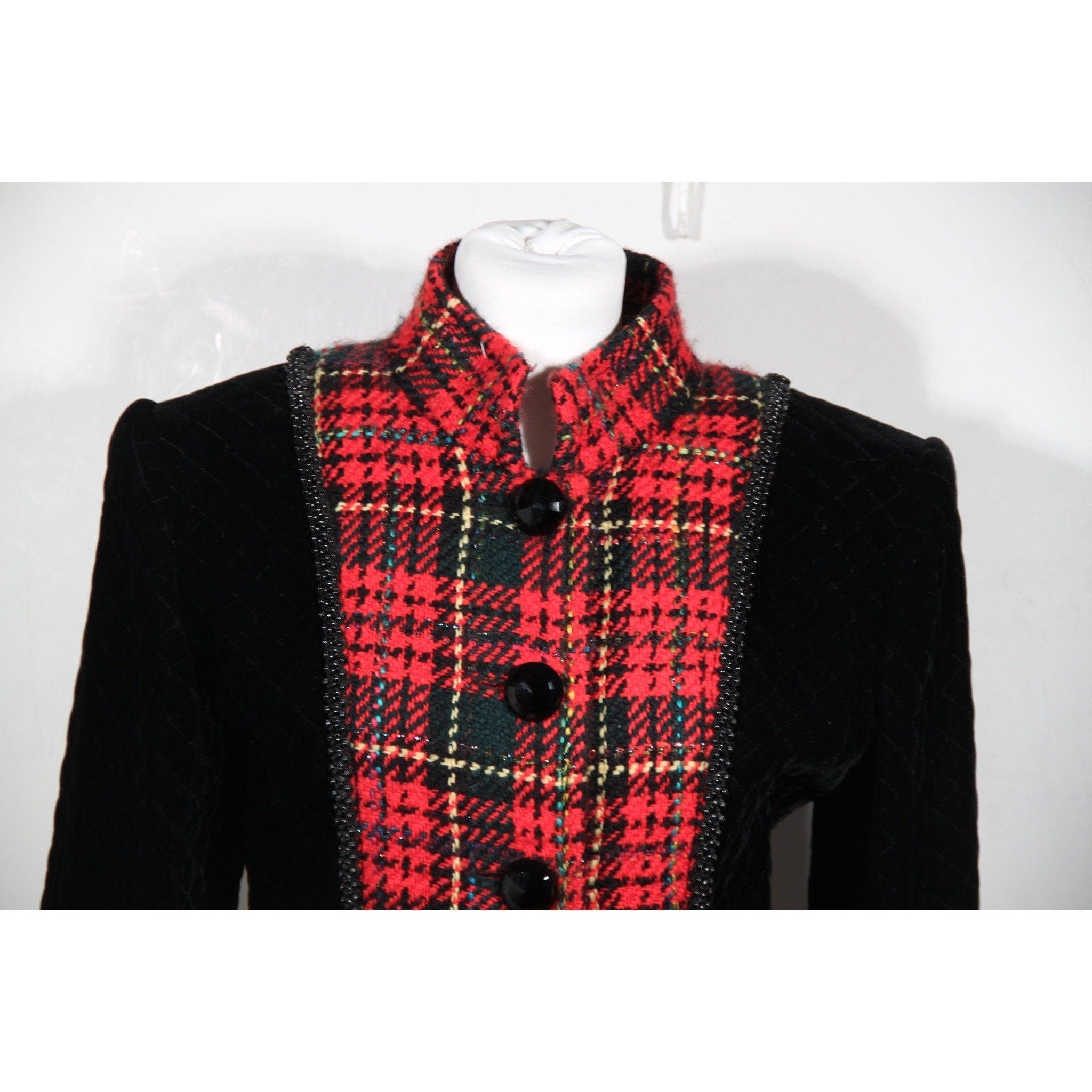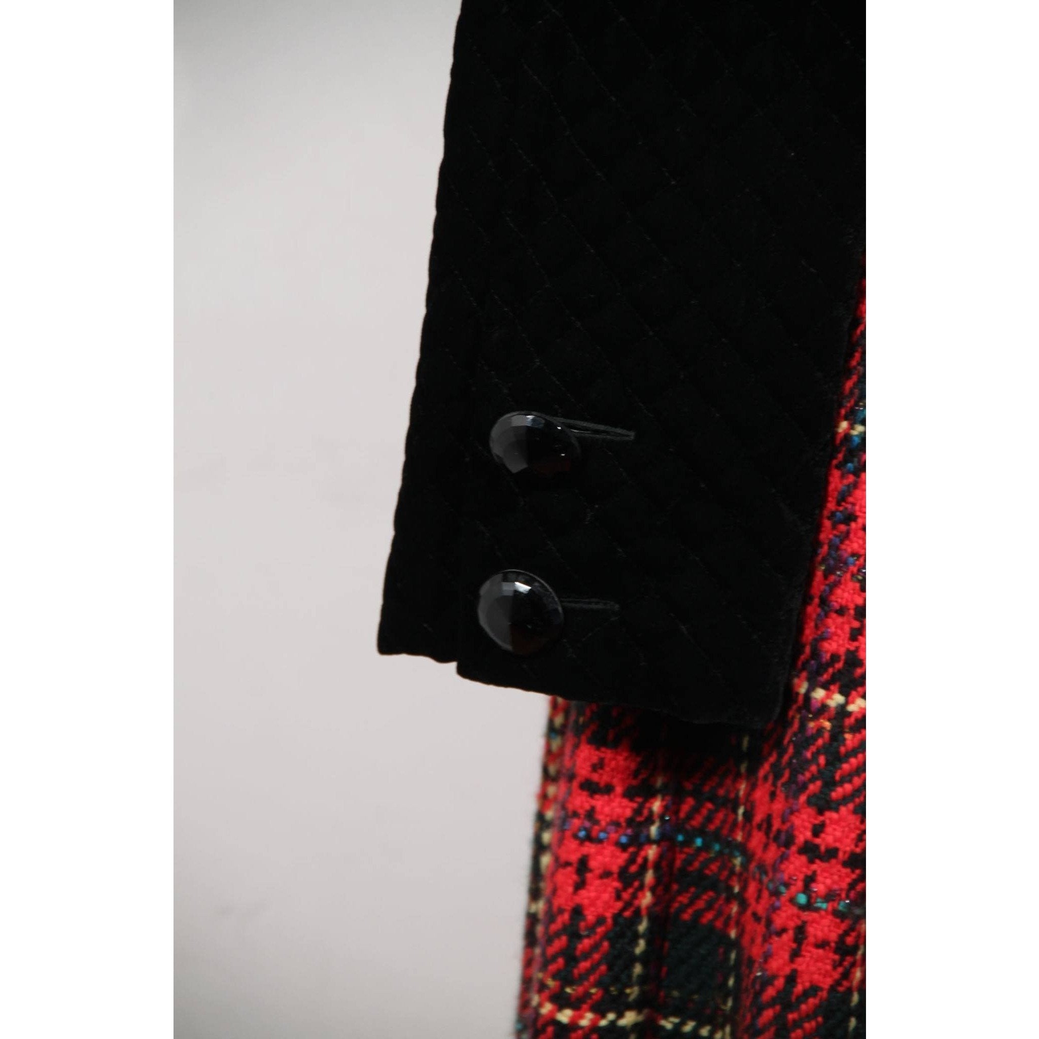 Step Into a World Of Vintage Luxury With This Breathtaking Andrea Odicini Redingote Coat Robe Manteau, a True Masterpiece From The 1970s. A Striking Blend Of Rich Black Velvet And Luxurious Red Tartan , This Coat Exudes Both Elegance And Bold Style. The Combination Of Black Velvet And Vibrant Red Tartan Creates a Stunning Contrast, Showcasing a Perfect Balance Of Texture And Color. The Long Quilted Velvet Sleeves Offer a Sophisticated Touch, Adding Depth And Dimension To The Design. With Button Cuffs At The Sleeve Hems, The