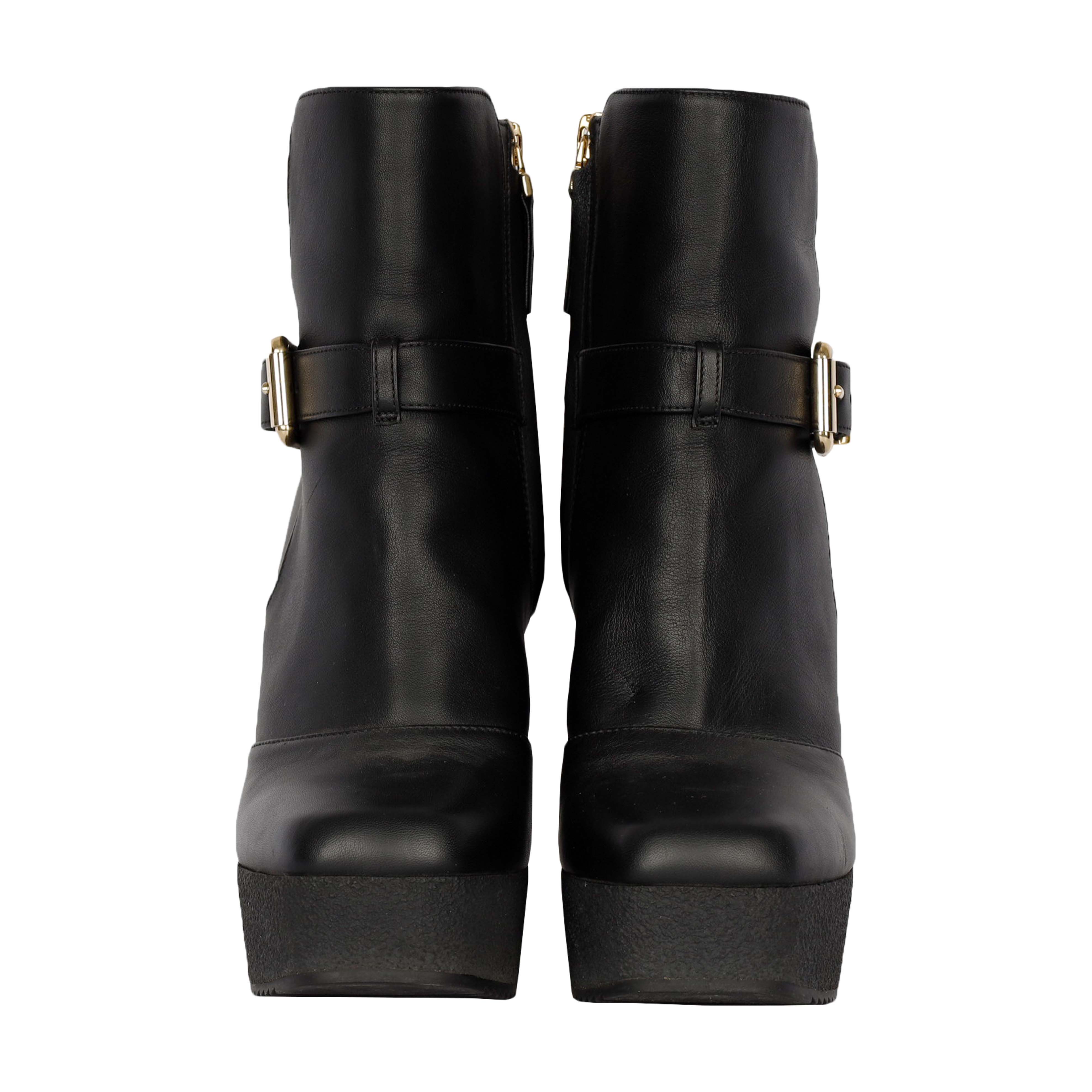 Crafted with black leather, the Fendi Black Leather Ankle Boots with heels feature stitched leather panels and golden attachments etched with the brand logo. The unique shape of the heels along with the distinct overall vibe make it truly one-of-a-kind.