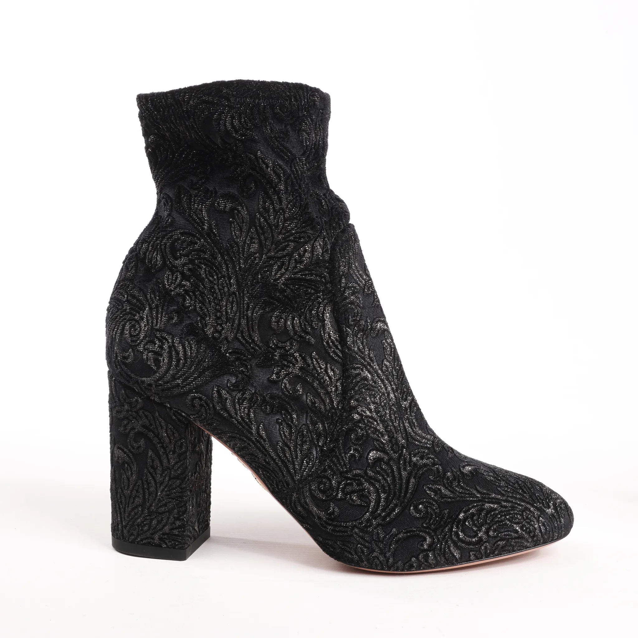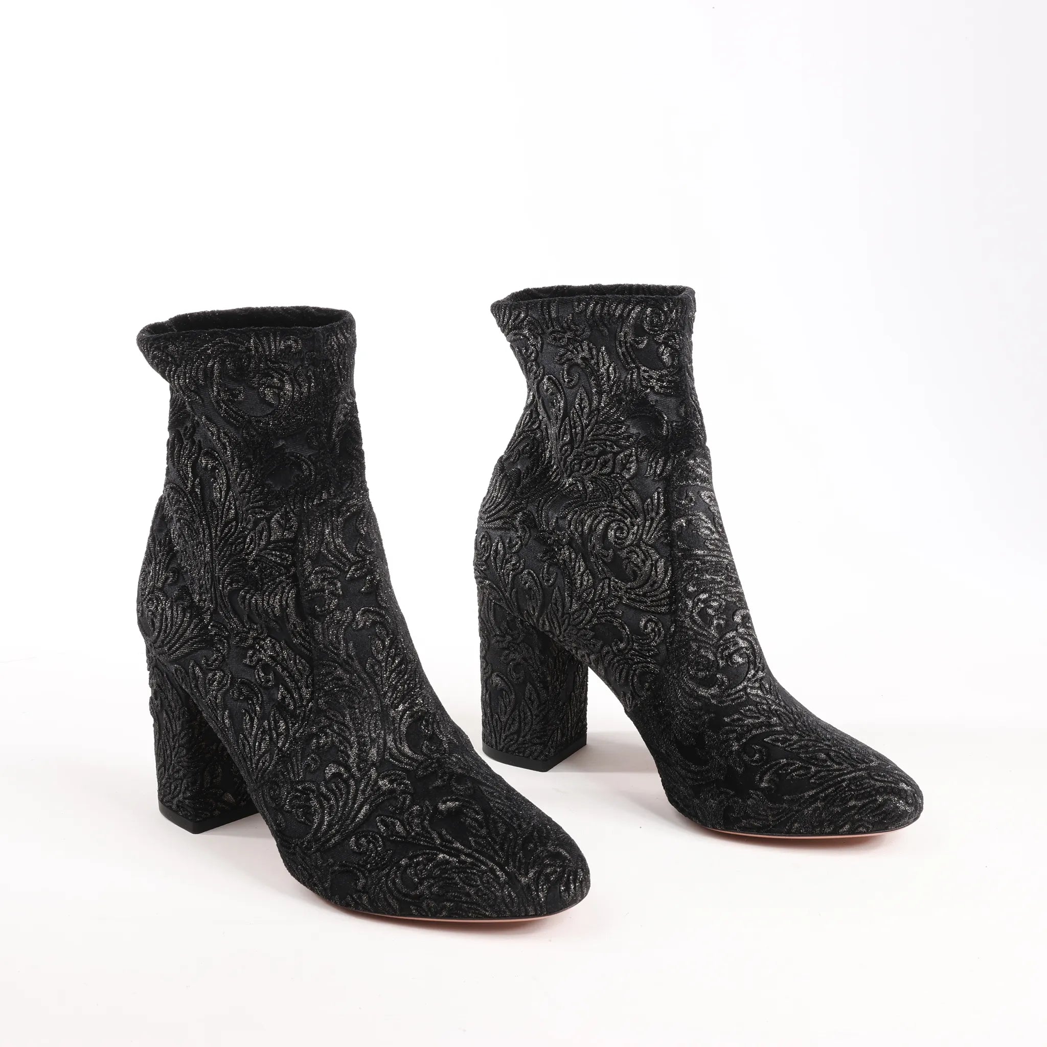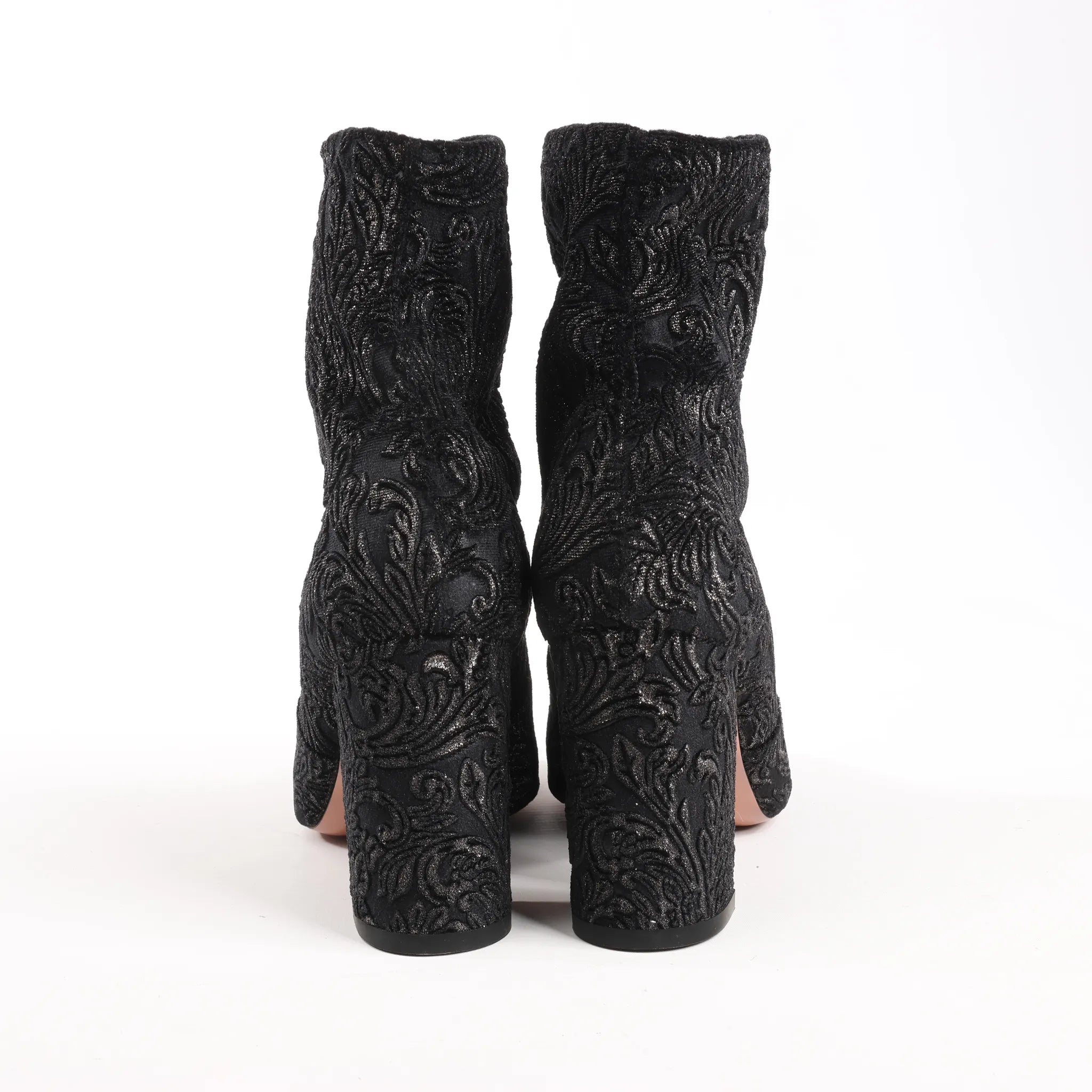 AQUAZZURA Heeled Velvet Ankle Sock Boots Tonal Baroque Tapestry in Black, Size 35.5 EU