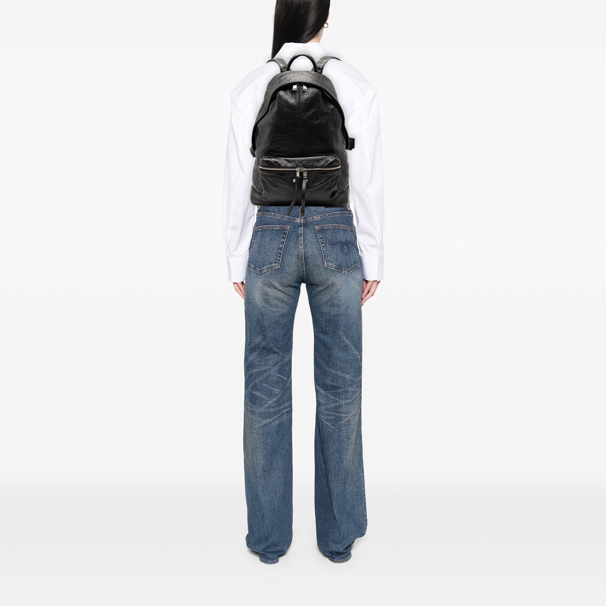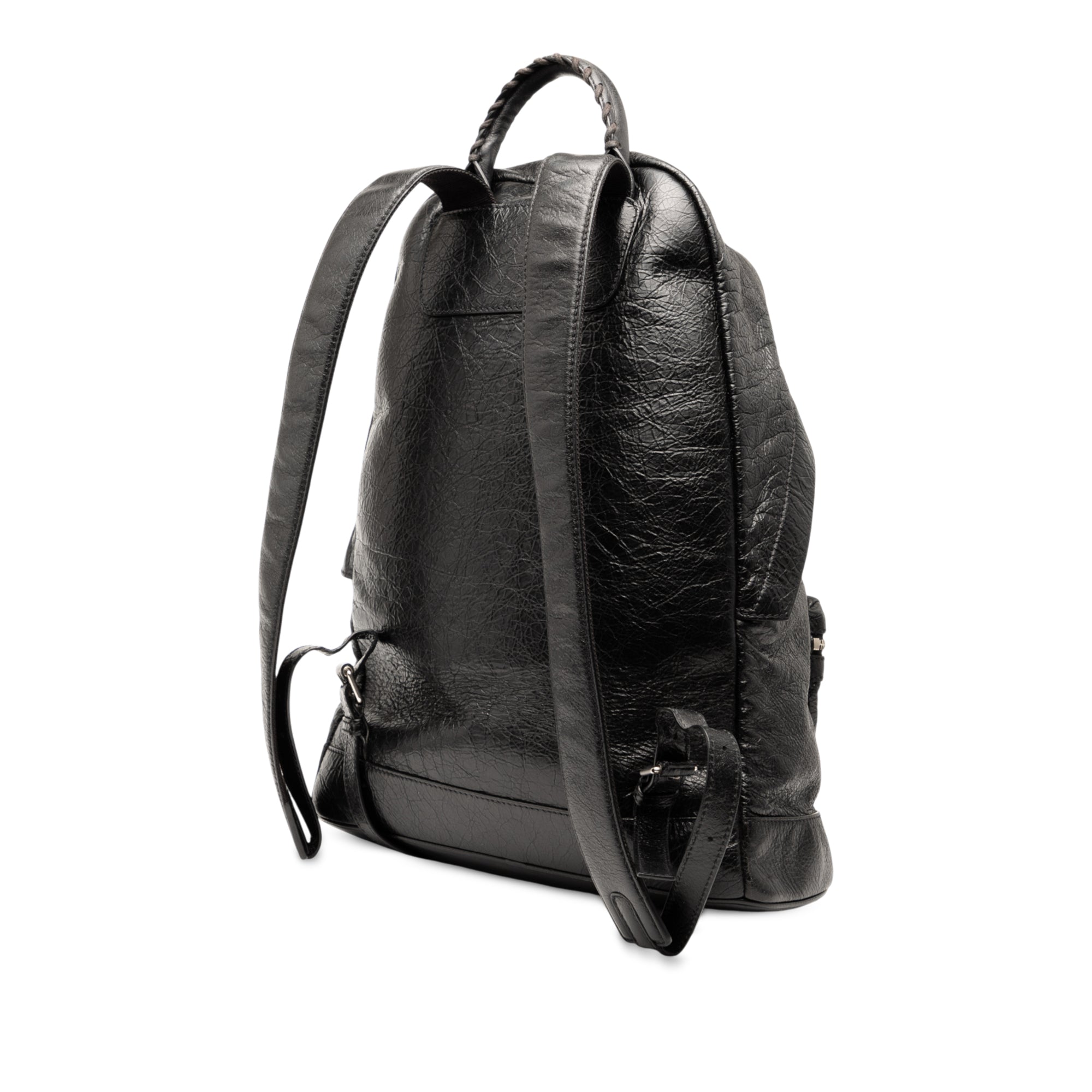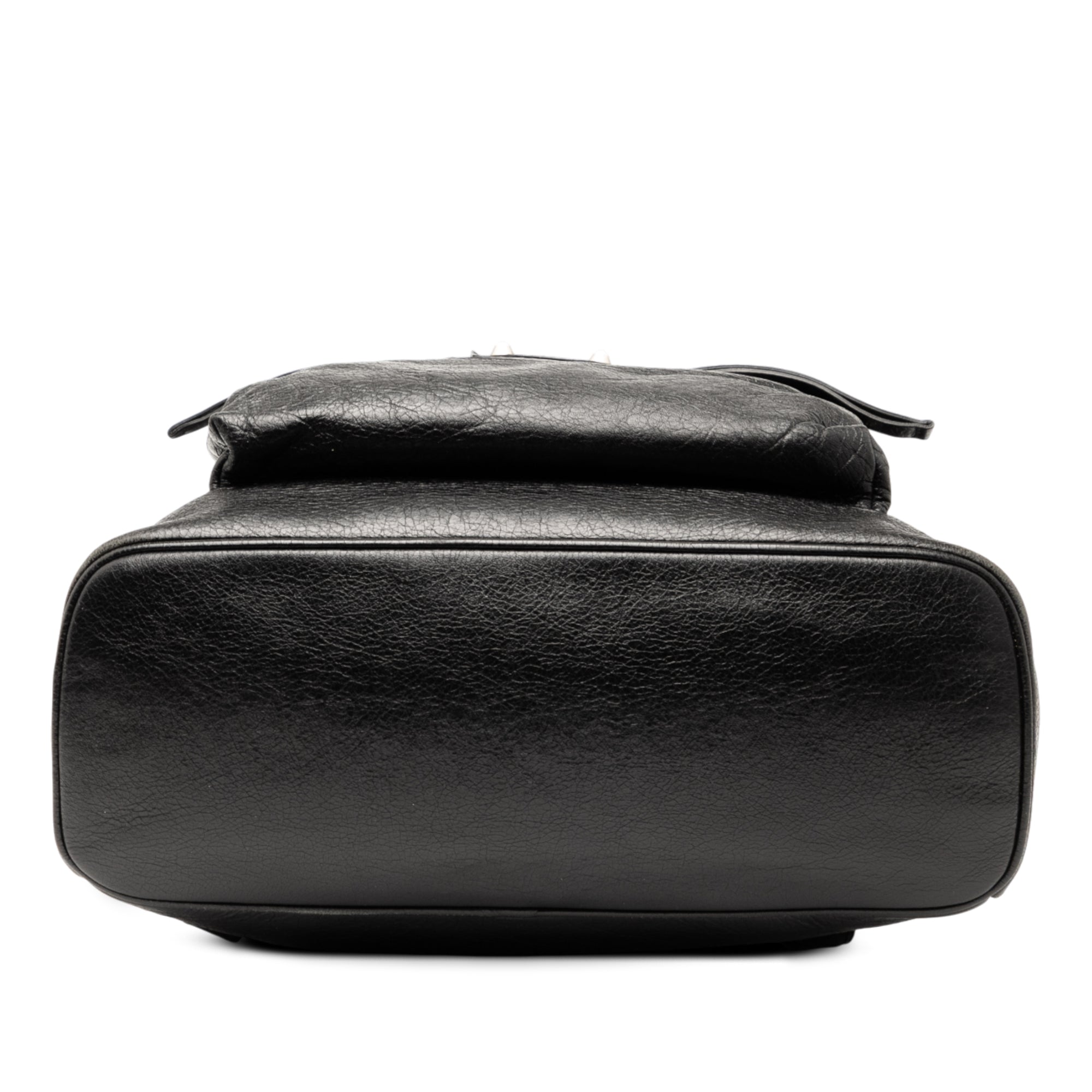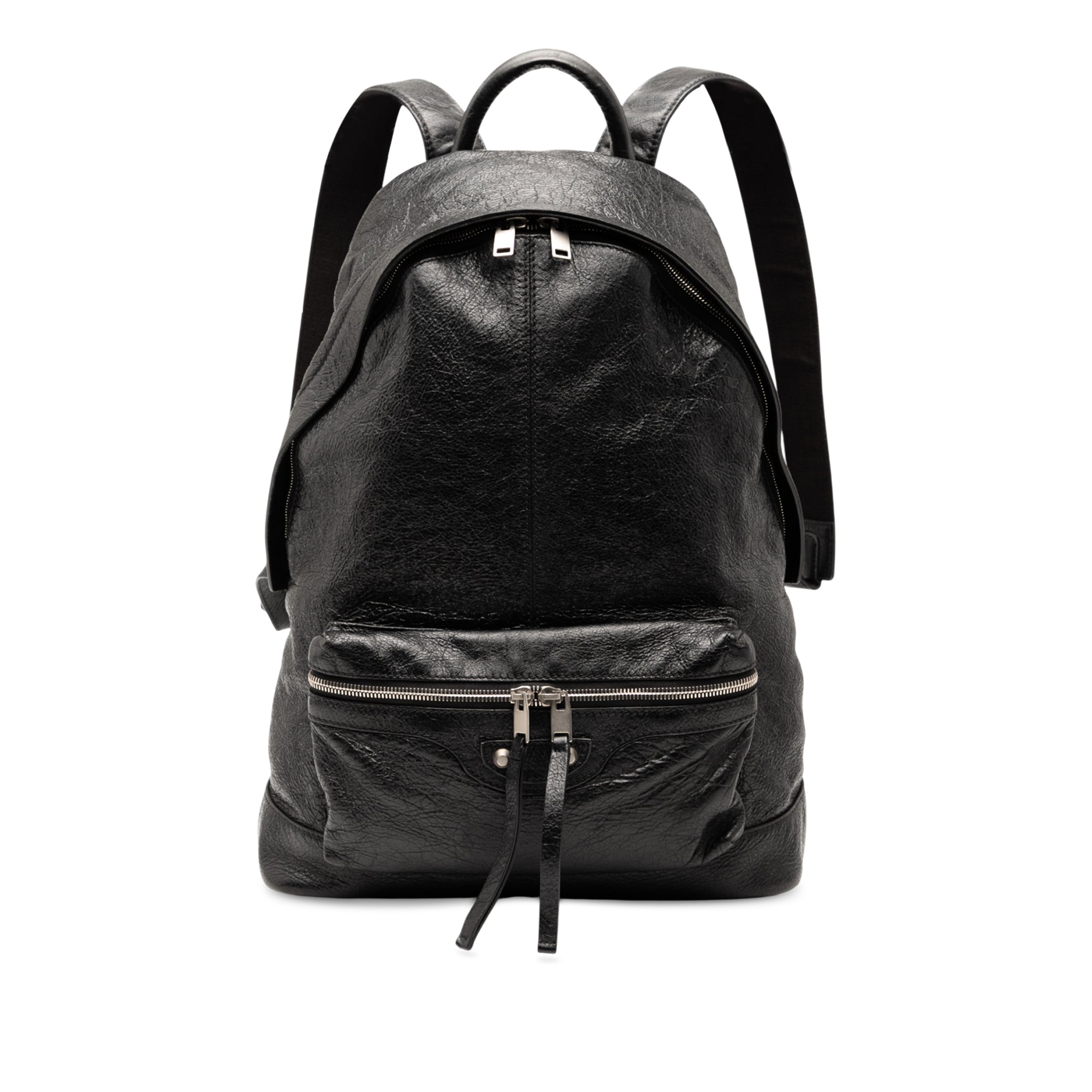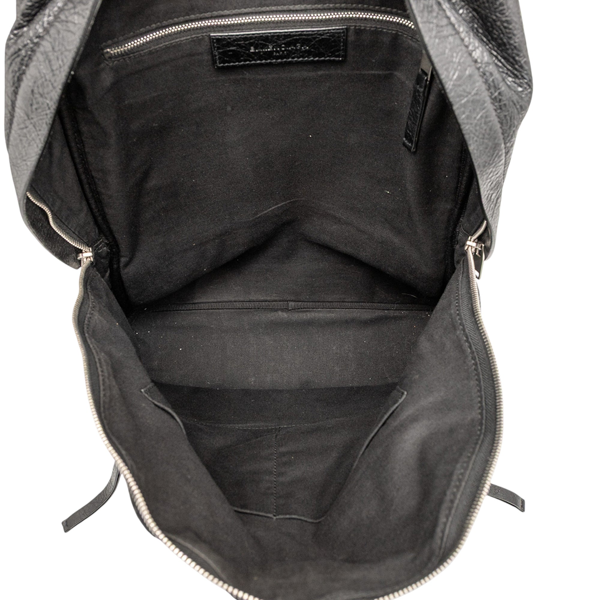 This backpack features a leather body, a rolled leather top handle, adjustable flat leather back shoulder straps, a top zip closure. an exterior front zip pocket, and an interior zip pocket. Retail Price: 1150.00
