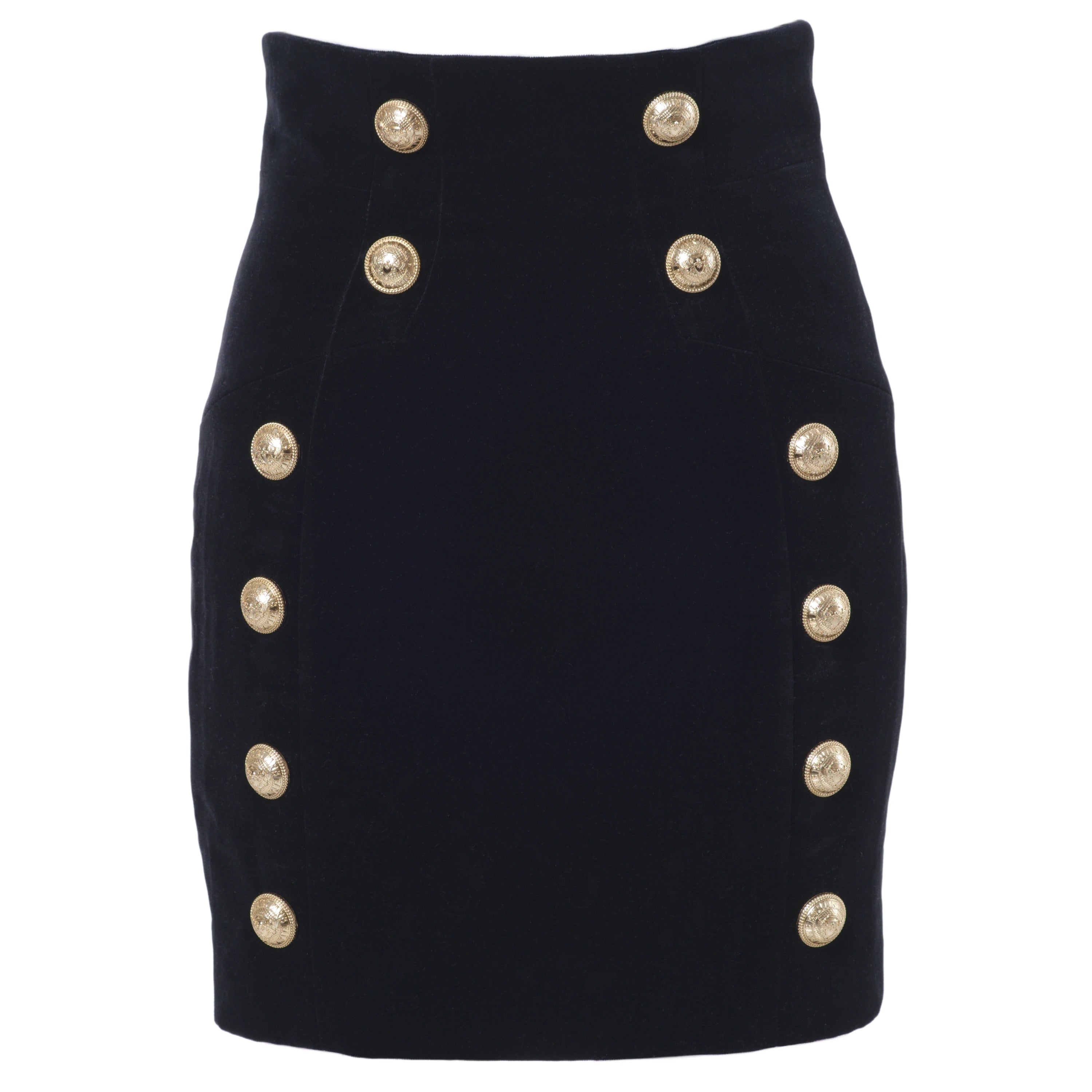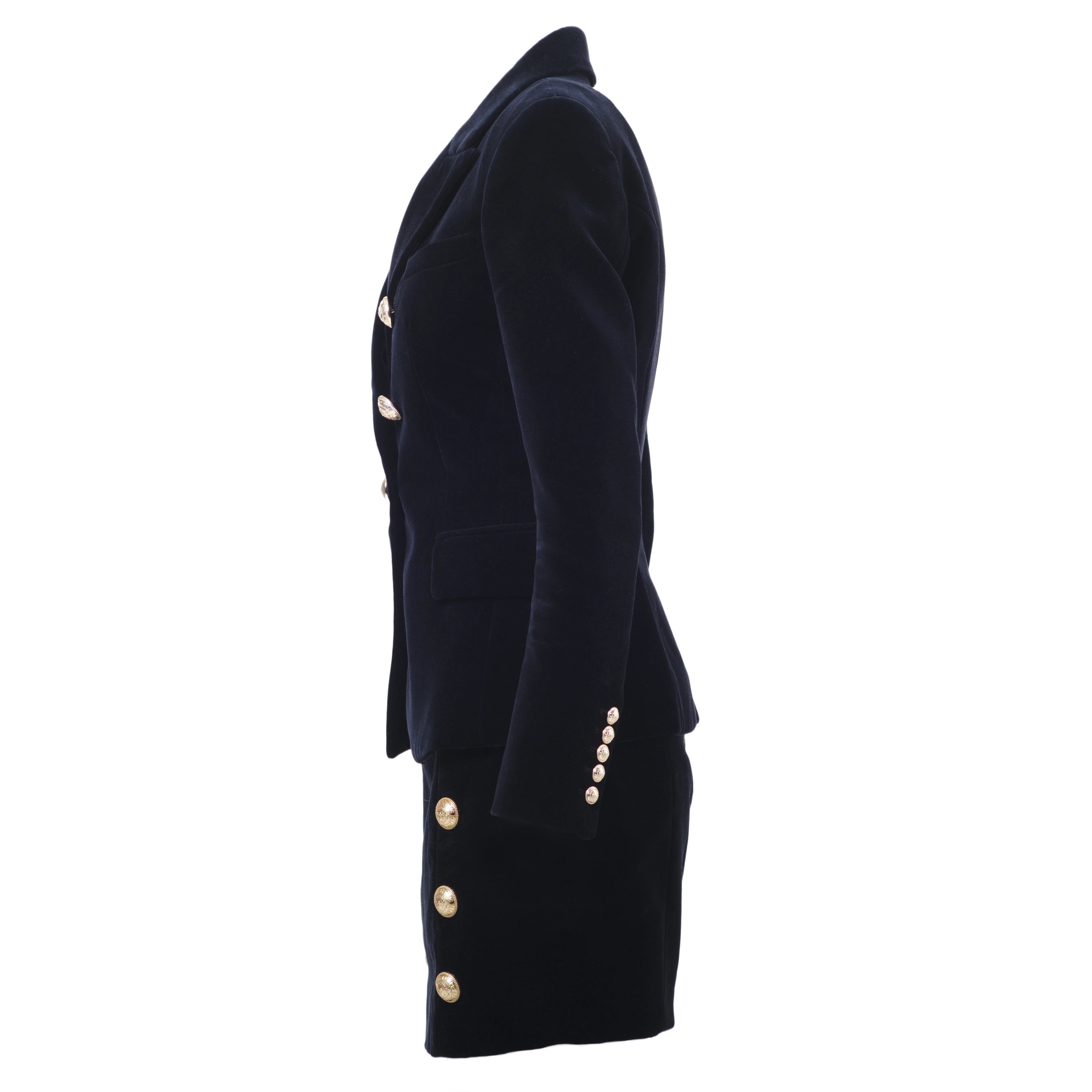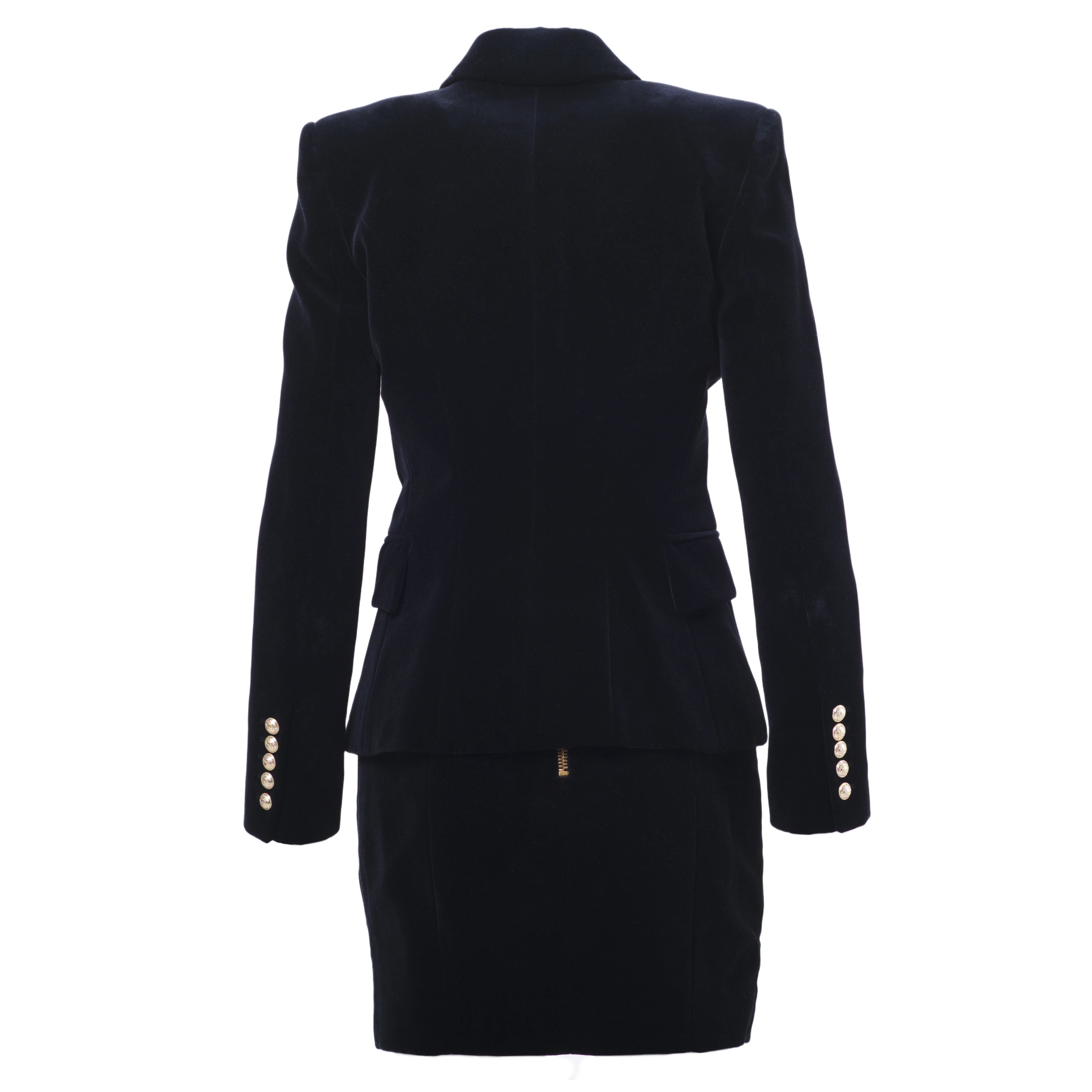 Crafted from high-quality black velvet, this set consists of a structured double-breasted blazer and a coordinated skirt, both embellished with Balmain’s signature gold-tone buttons, a hallmark of the maison.