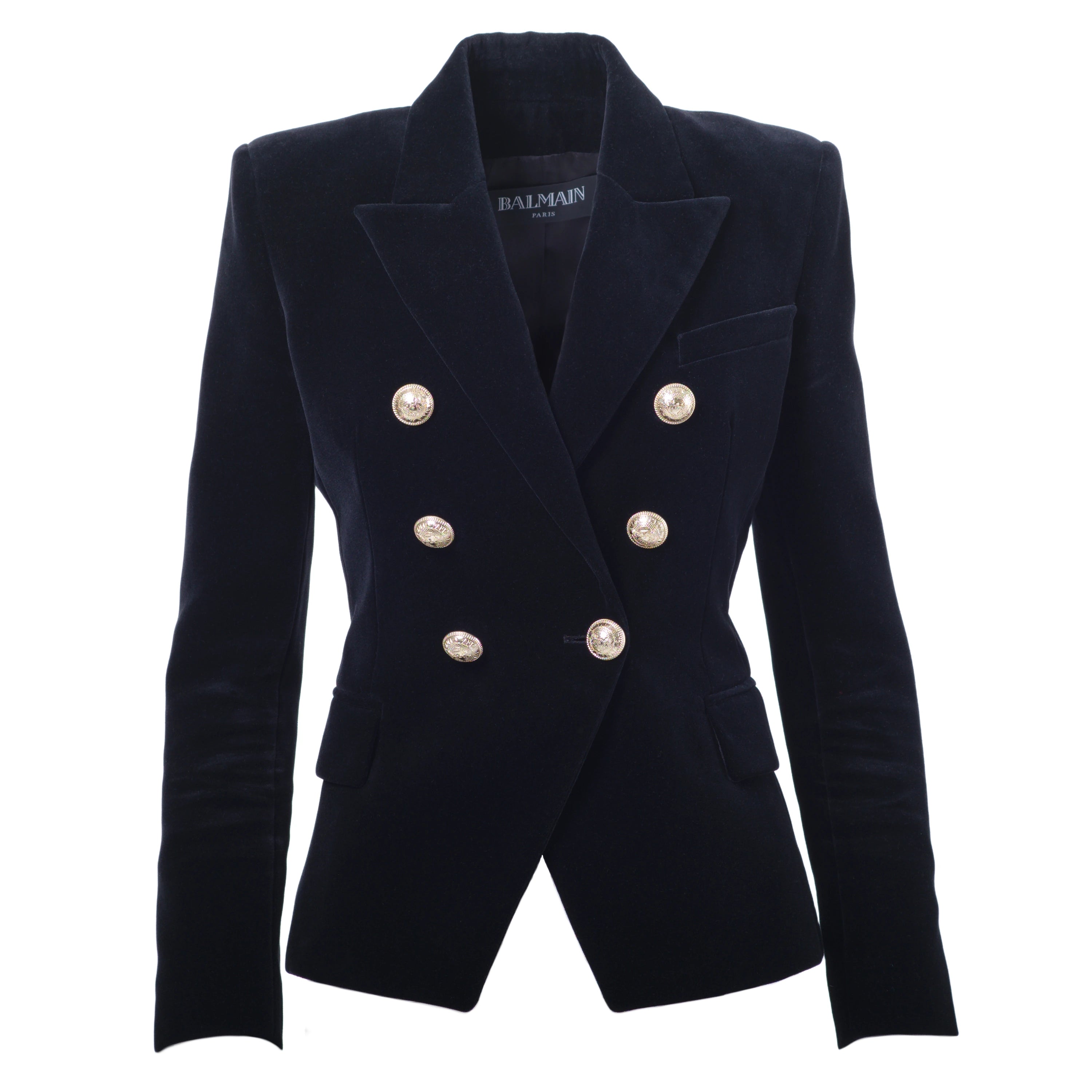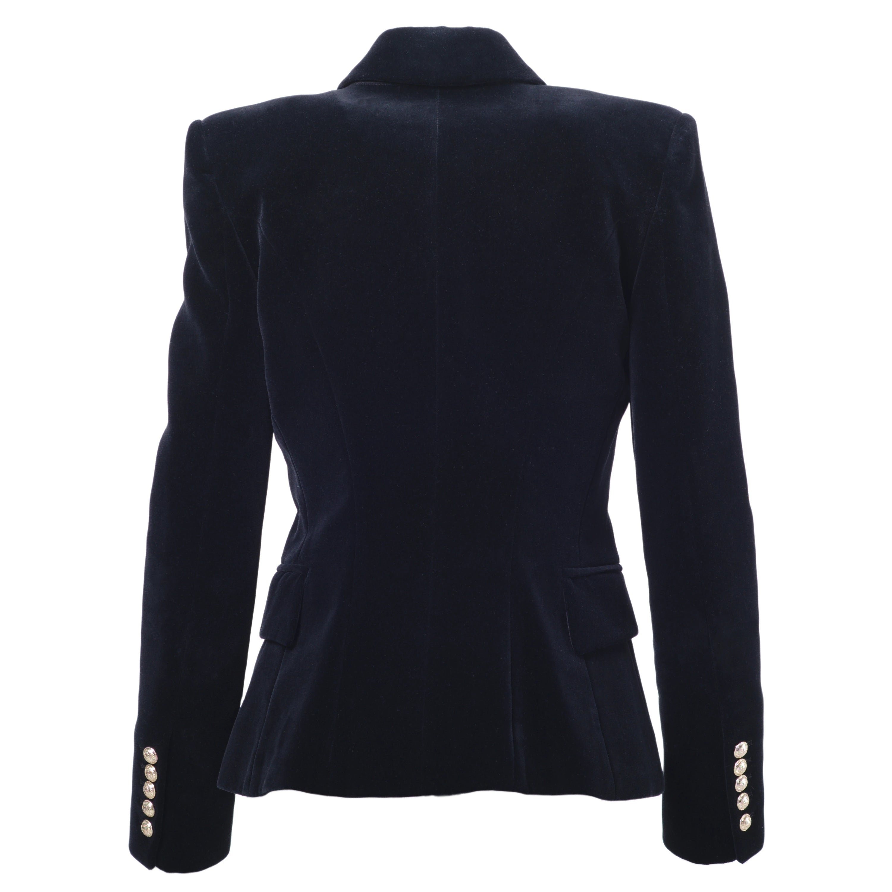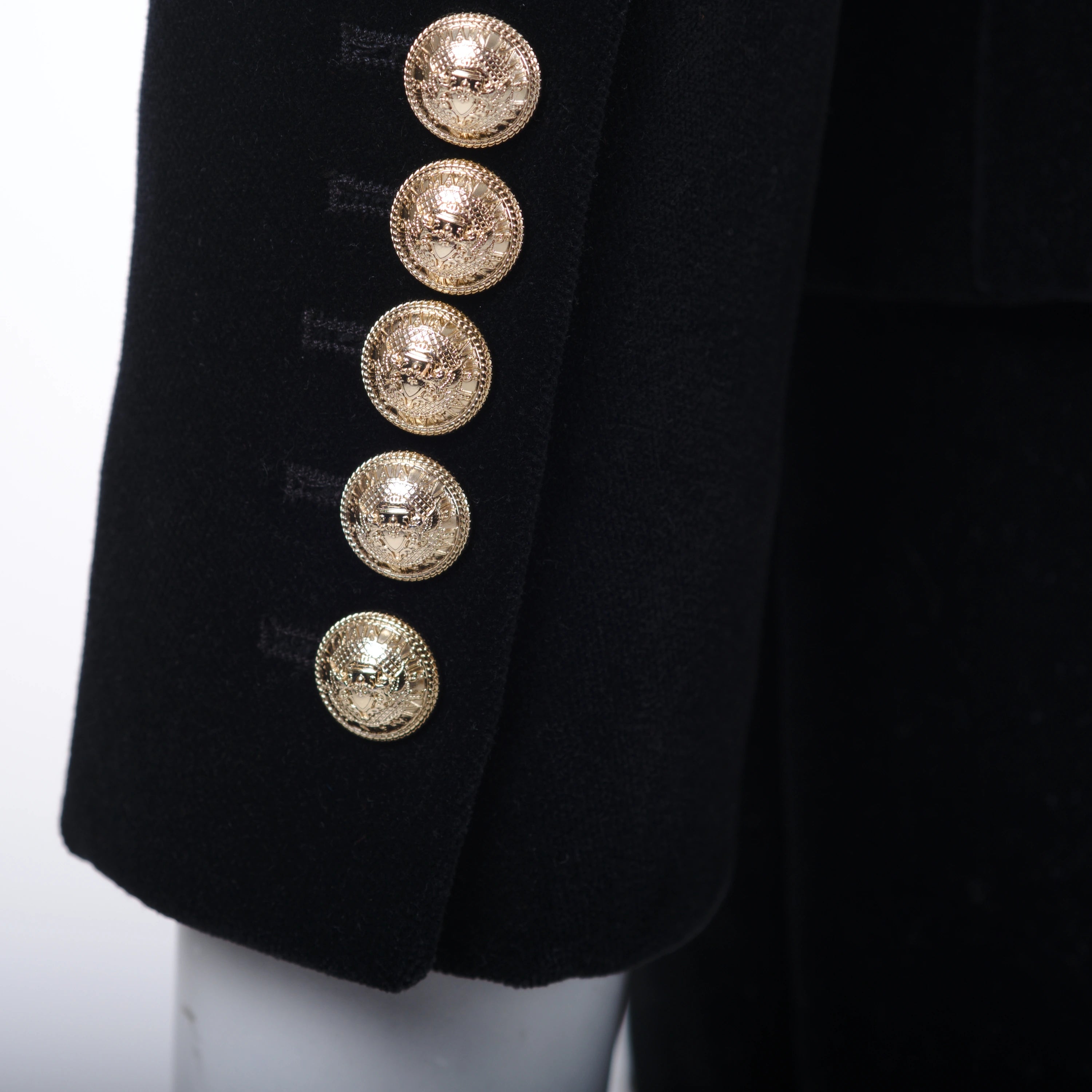 Crafted from high-quality black velvet, this set consists of a structured double-breasted blazer and a coordinated skirt, both embellished with Balmain’s signature gold-tone buttons, a hallmark of the maison.