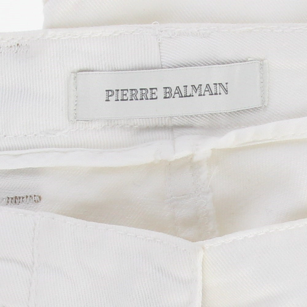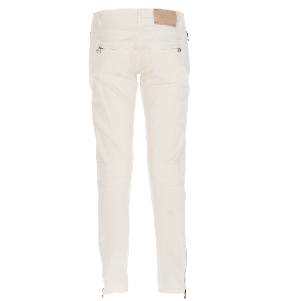 Balmain 2000s white cotton denim trousers. Side ribbed, pockets and hem with zip. Closure with hook and hidden button.