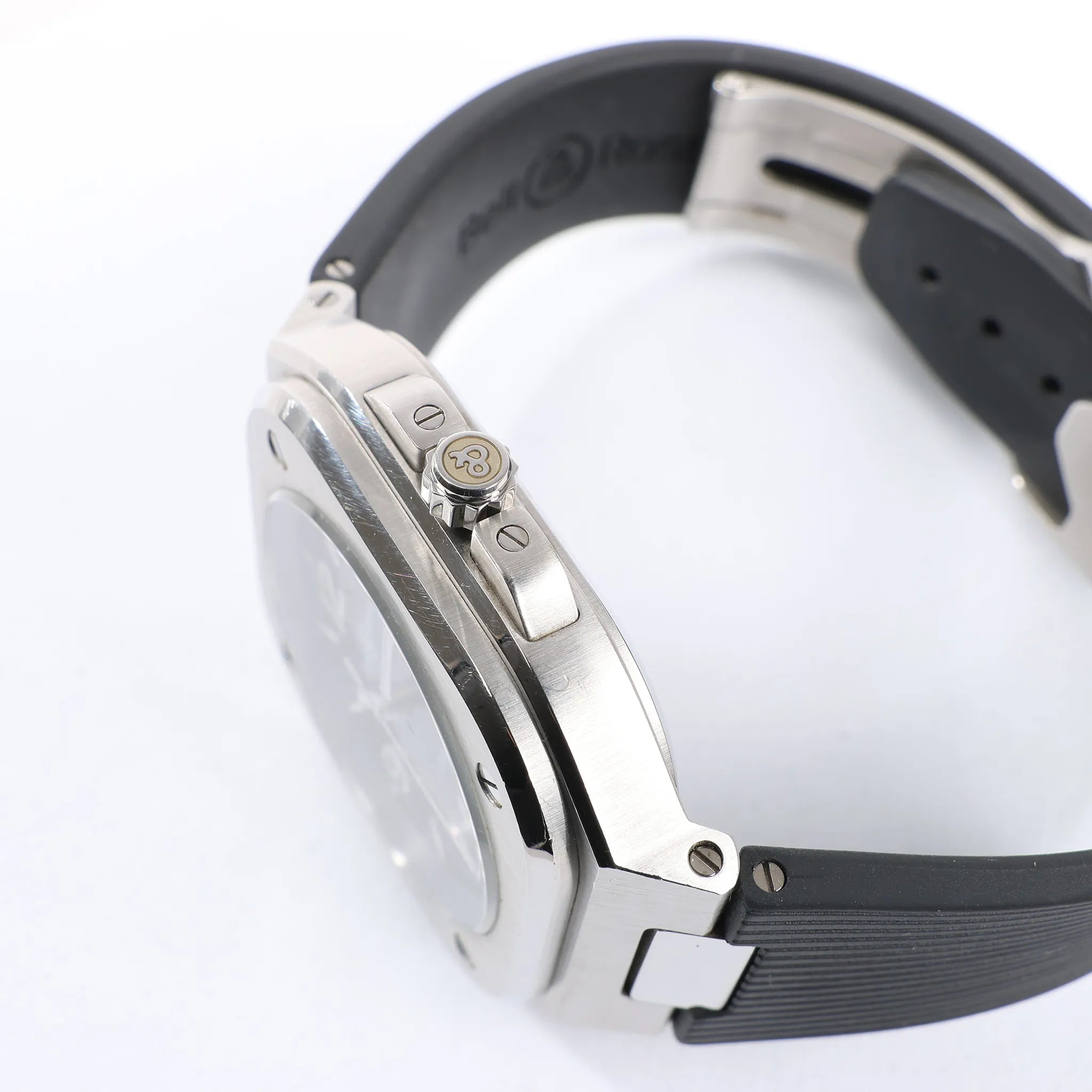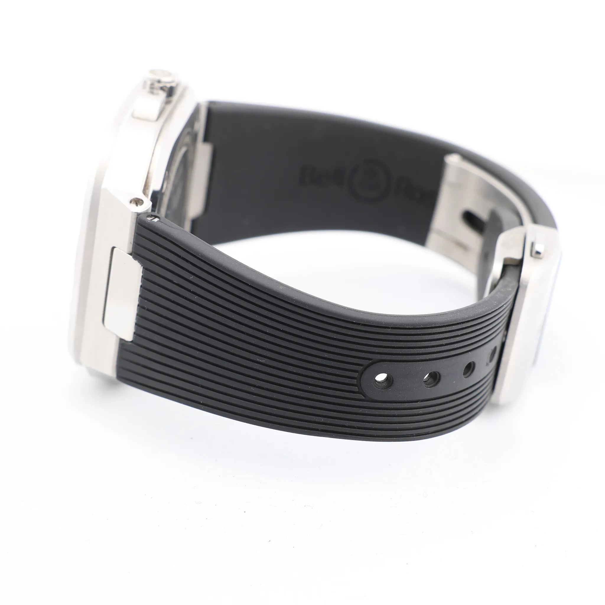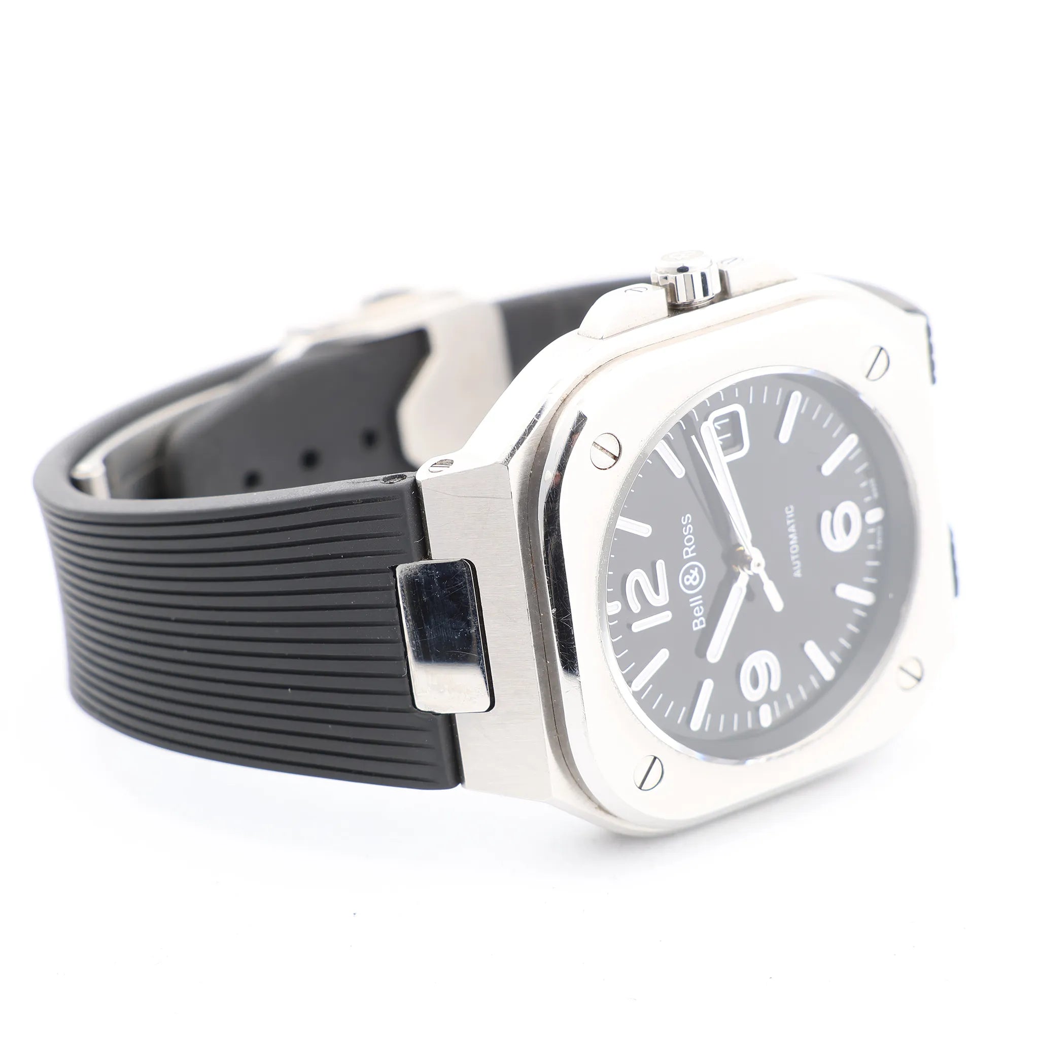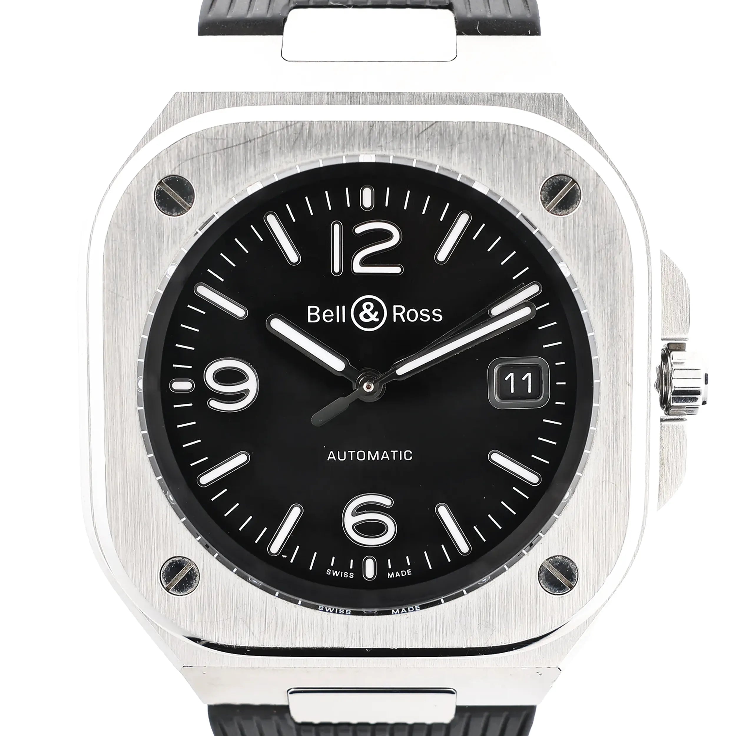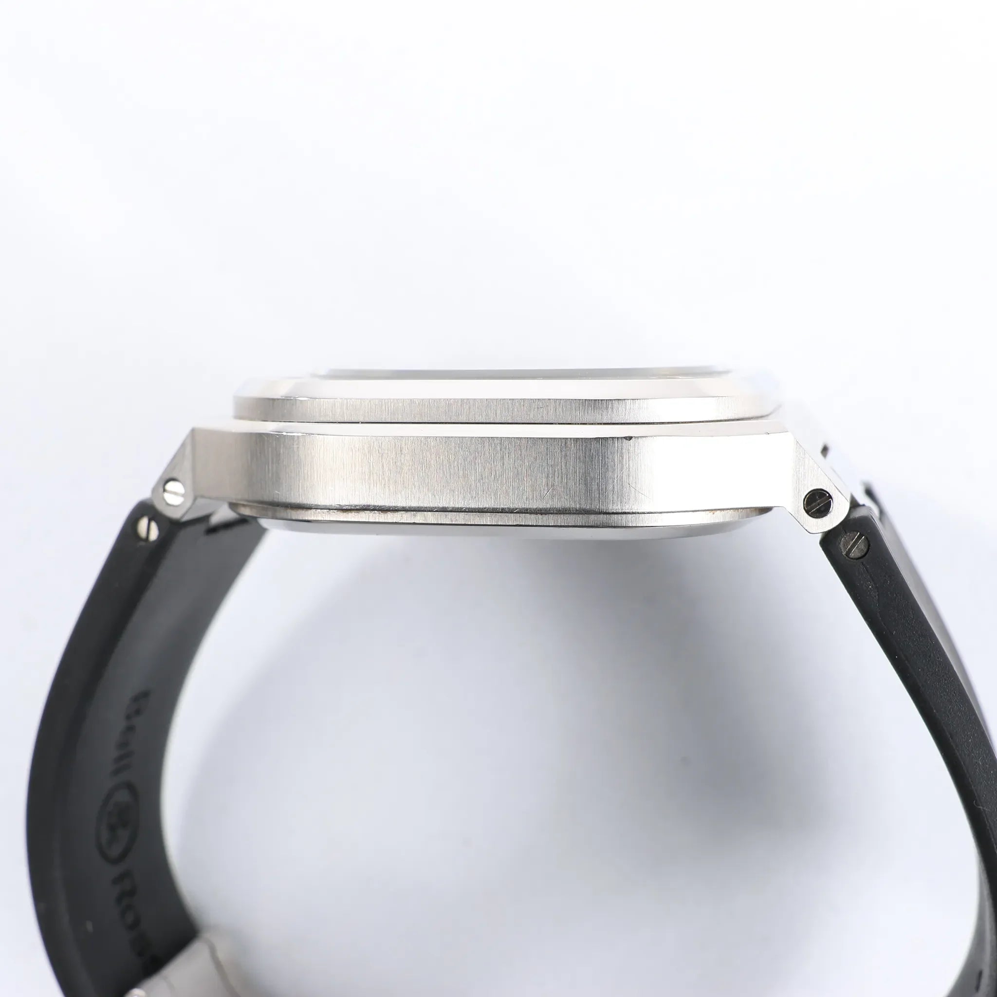 Brand: Bell & RossModel: BR05Reference: BR05ACondition: ExcellentCondition Details: Excellent overall condition with almost no visible signs of use. Barely noticeable hairline marks may be present, but they are not visible to the naked eye. Please see photos for details. Dial Colour: BlackDial Material: Stainless steelsStarp Colour: BlackStrap material: RubberMovement: AutomaticFace Diameter: 40 mm Approx. max circumference: 20 cmComes With: Box (damaged), Papers, Certificate, Service card