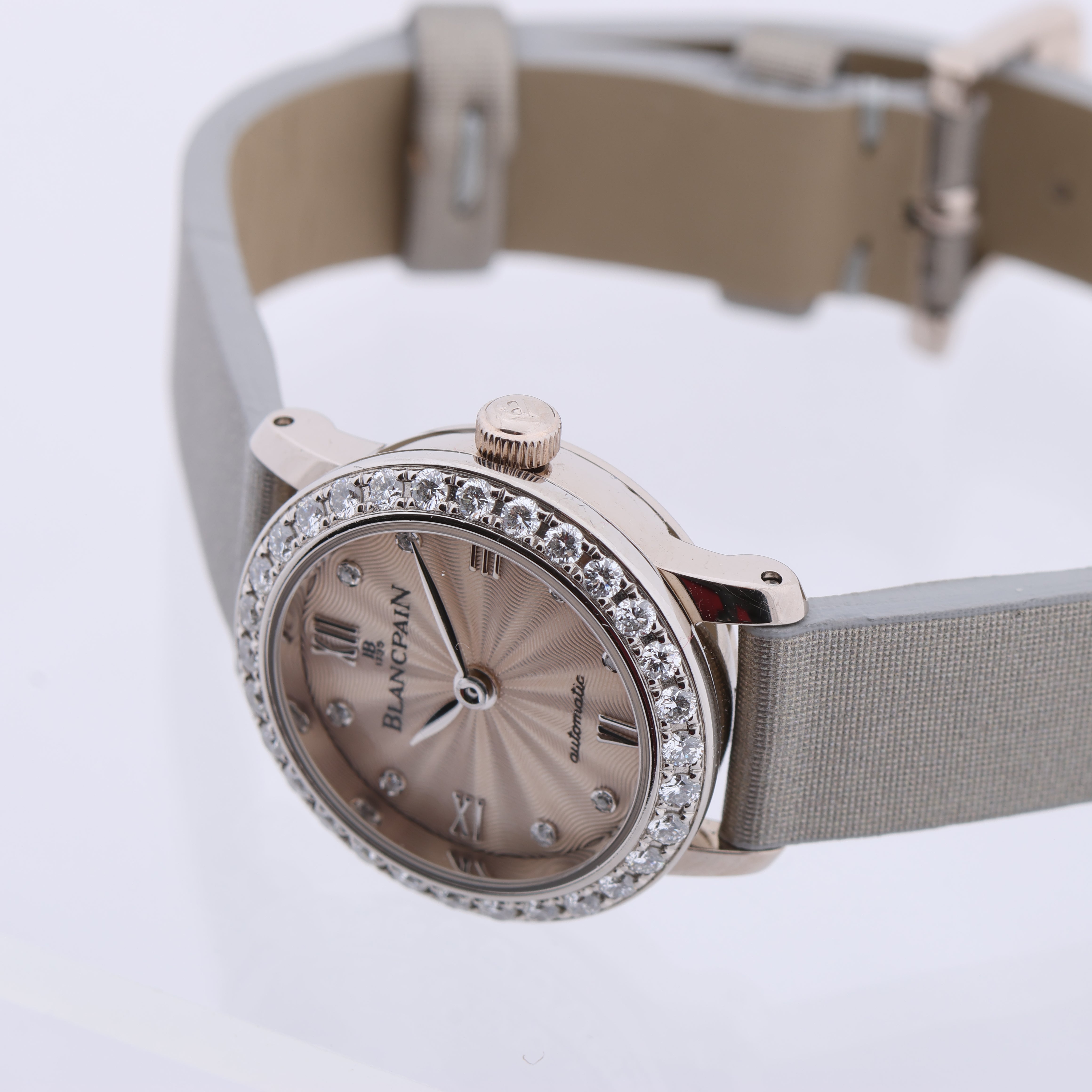 The Blancpain Lady Bird 814 WG & Leather Watch (N00062001 92R0A052A) features an elegant silver face with diamond accents and a refined white gold bezel. Its slim profile and luxurious leather strap make this automatic timepiece a perfect blend of sophistication and style.