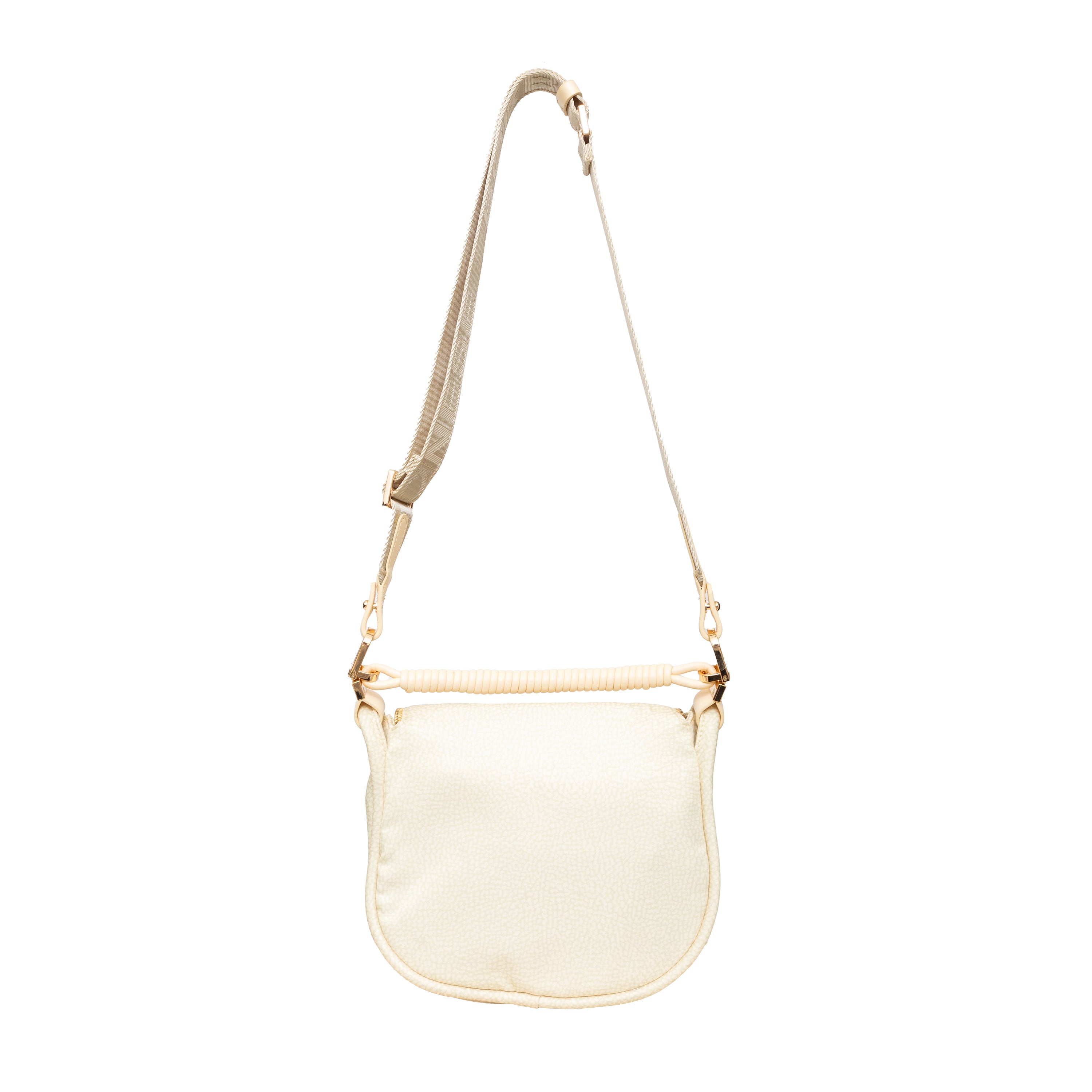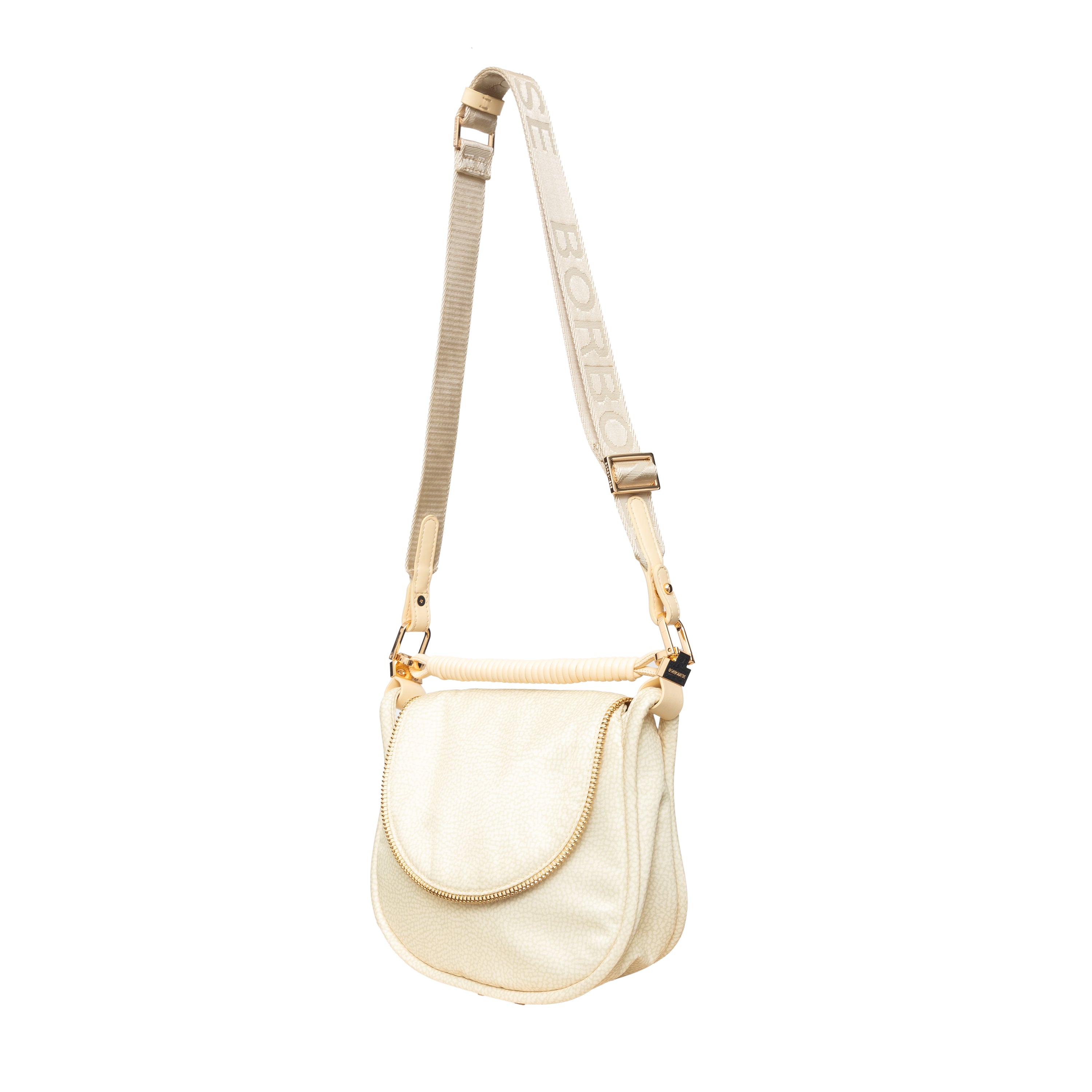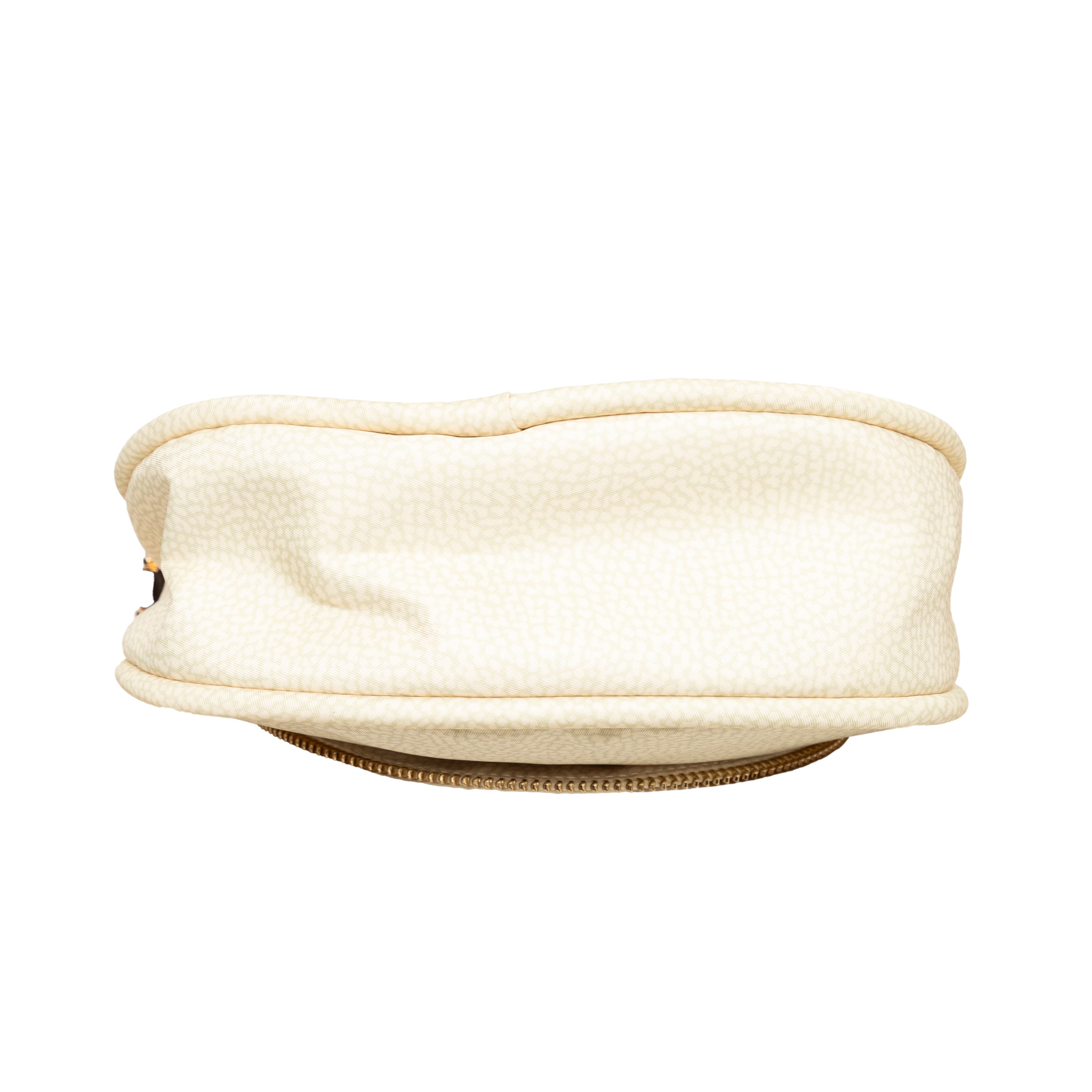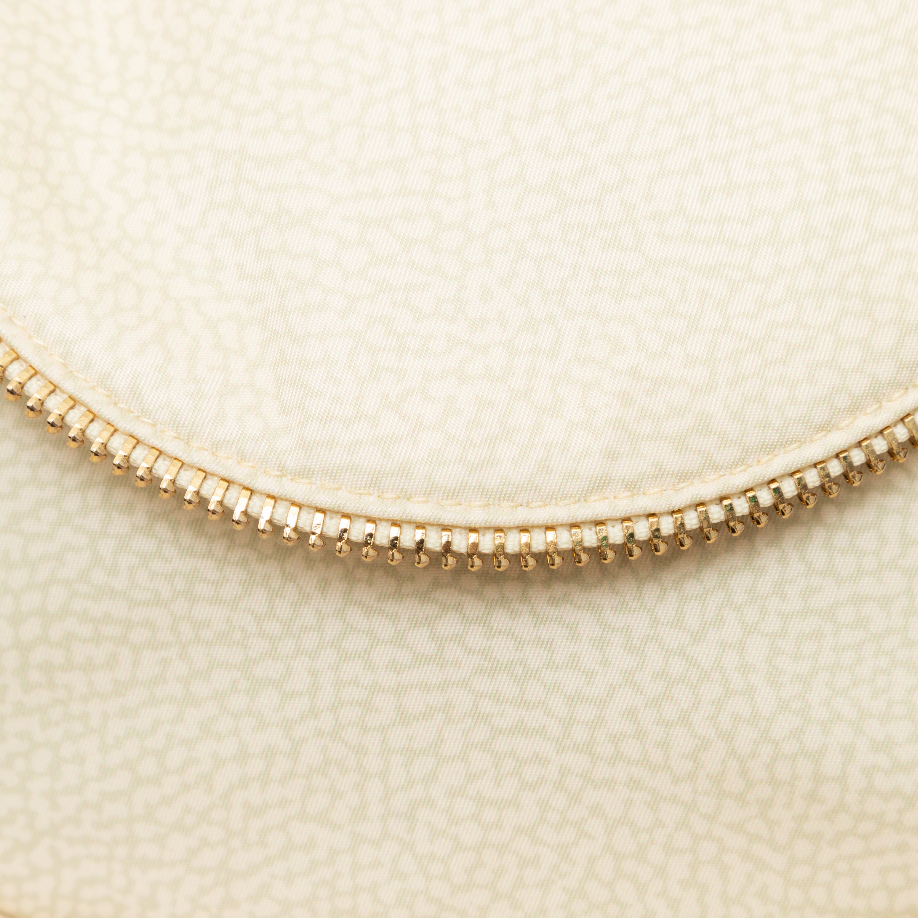 This off-white recycled nylon crossbody bag features a logo-embossed canvas adjustable strap, golden hardware, offering an eco-friendly chic design.