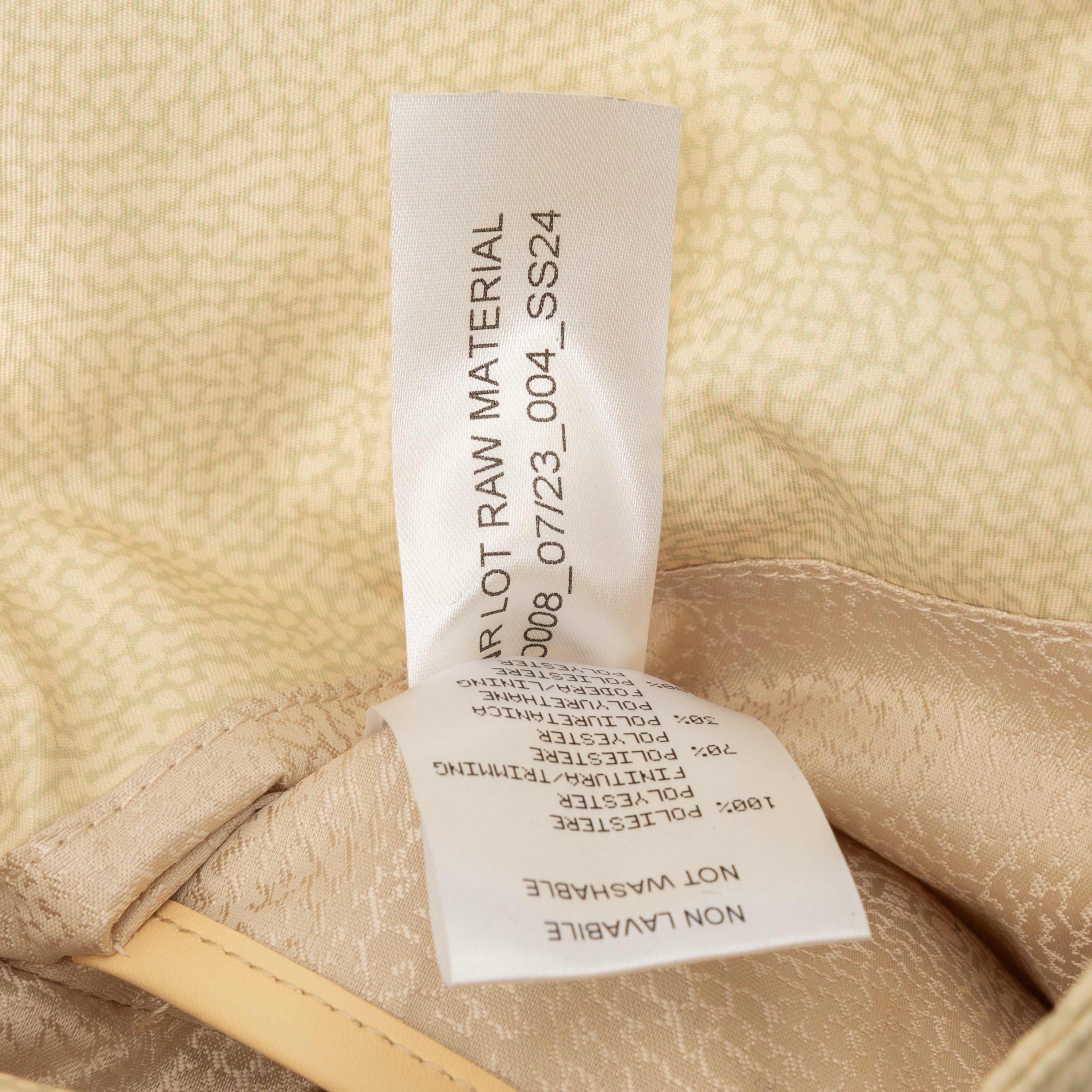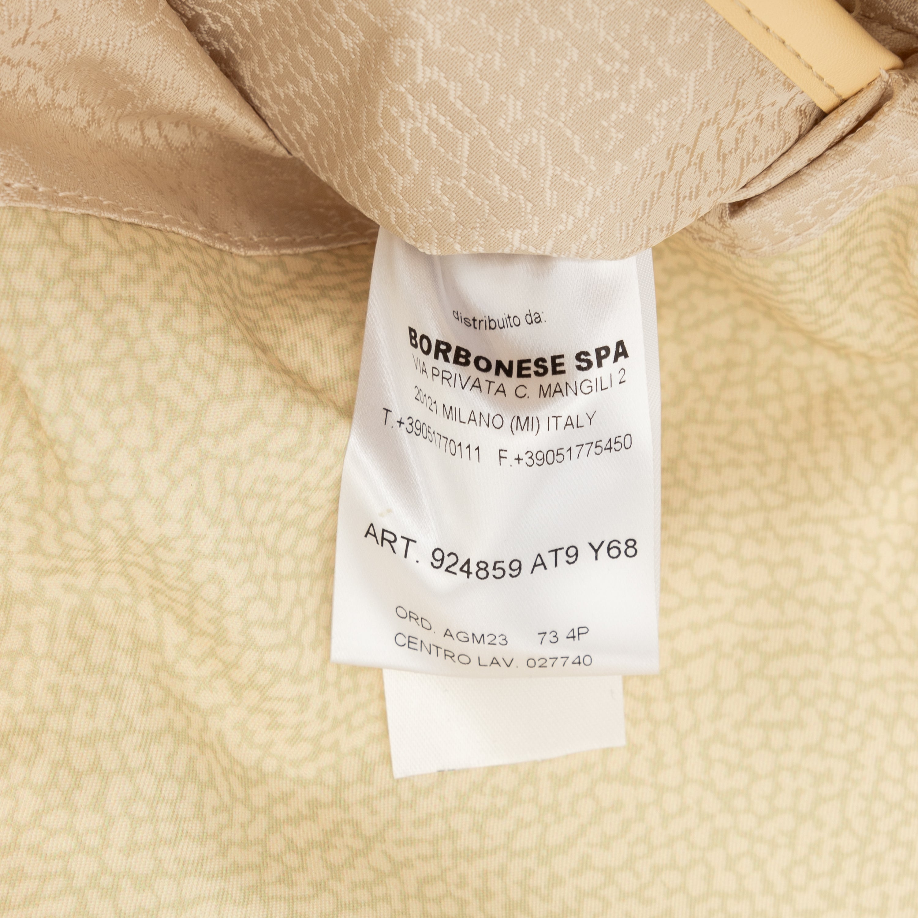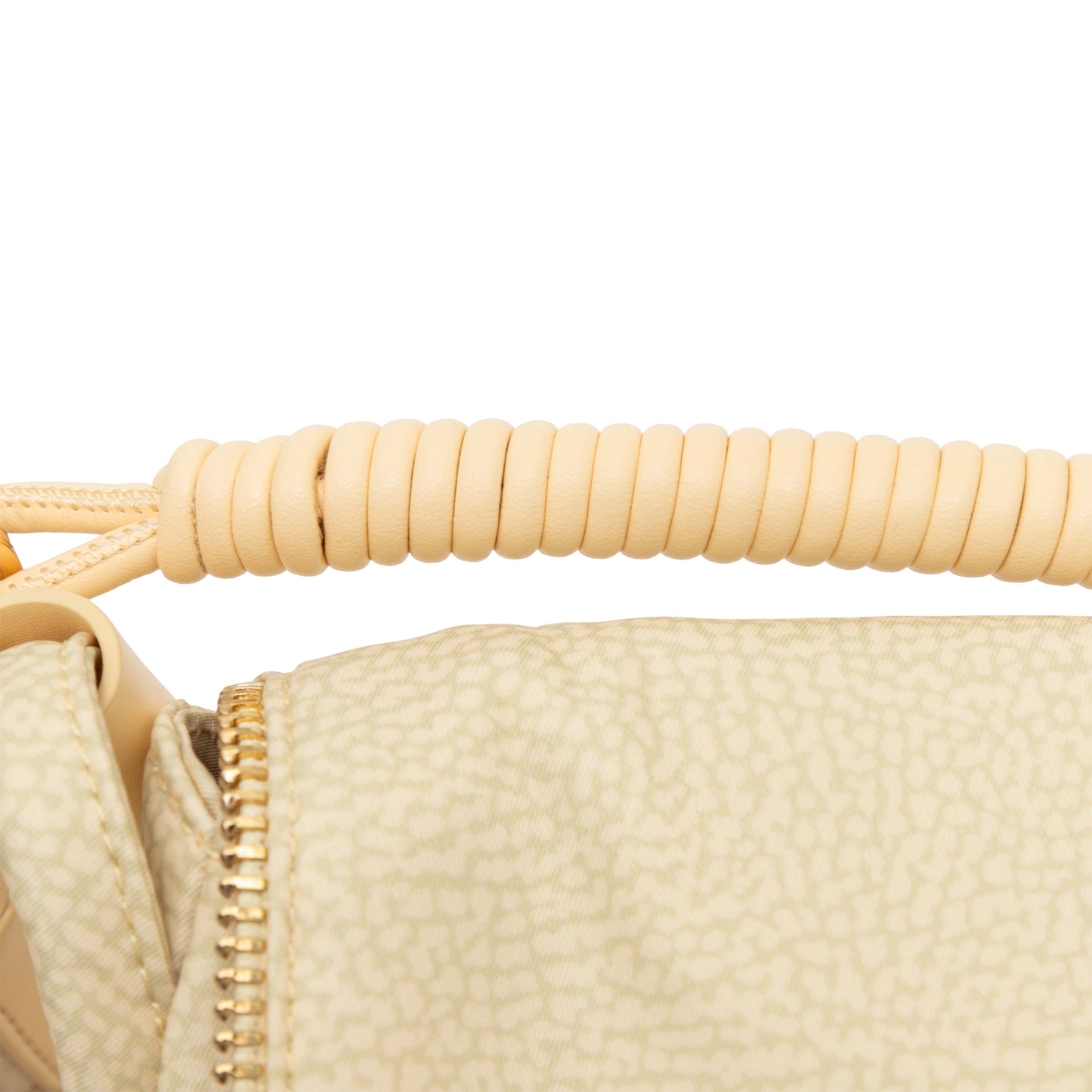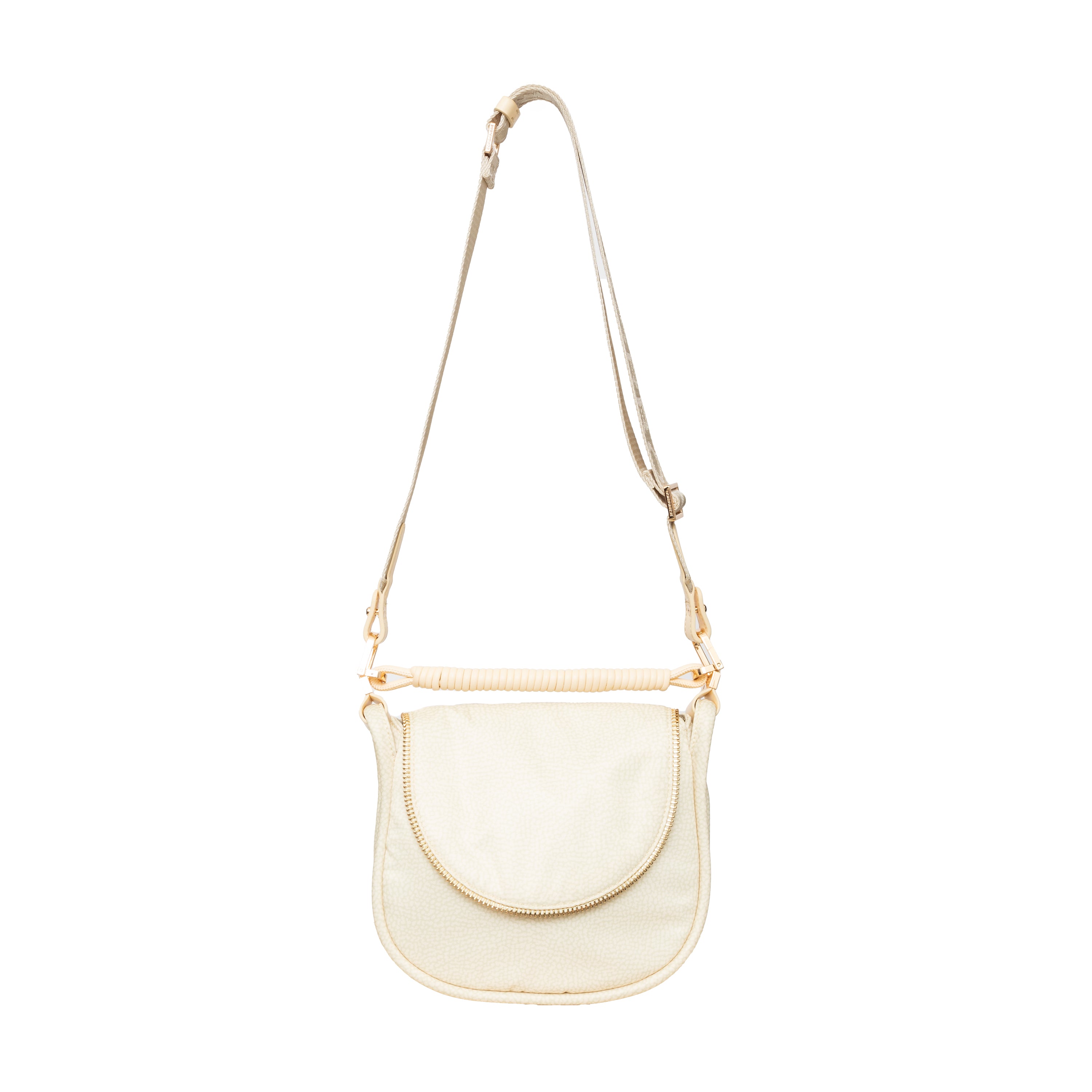 This off-white recycled nylon crossbody bag features a logo-embossed canvas adjustable strap, golden hardware, offering an eco-friendly chic design.