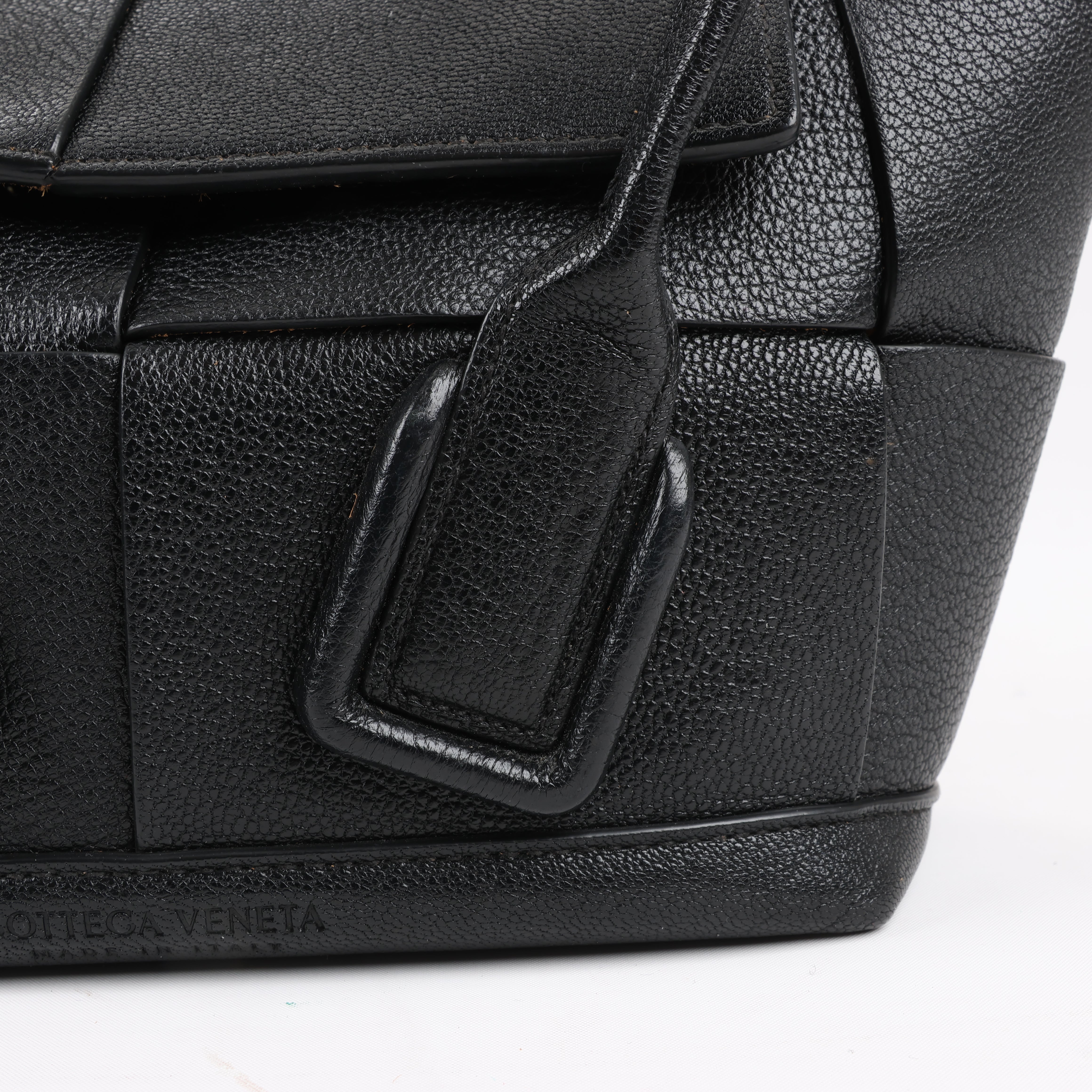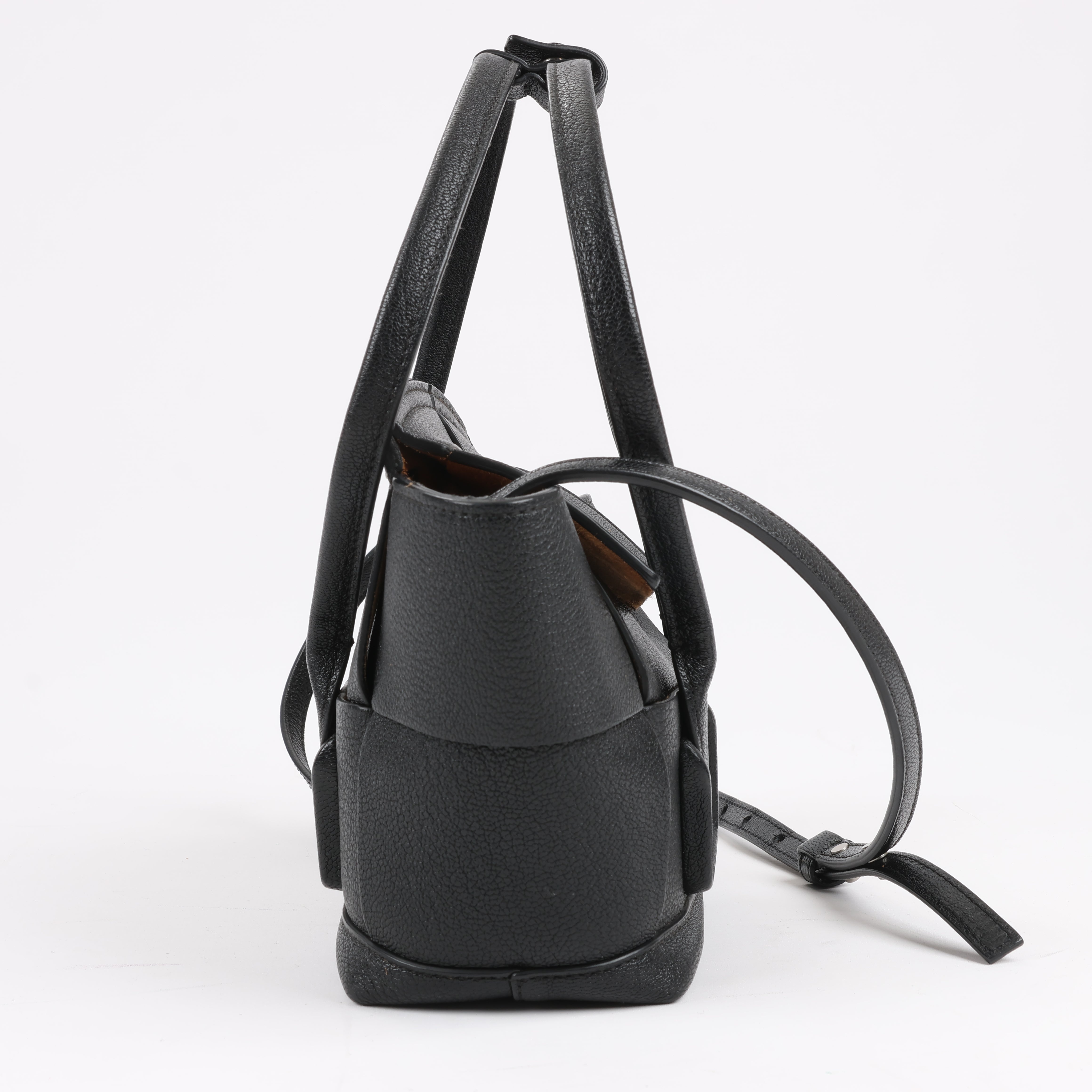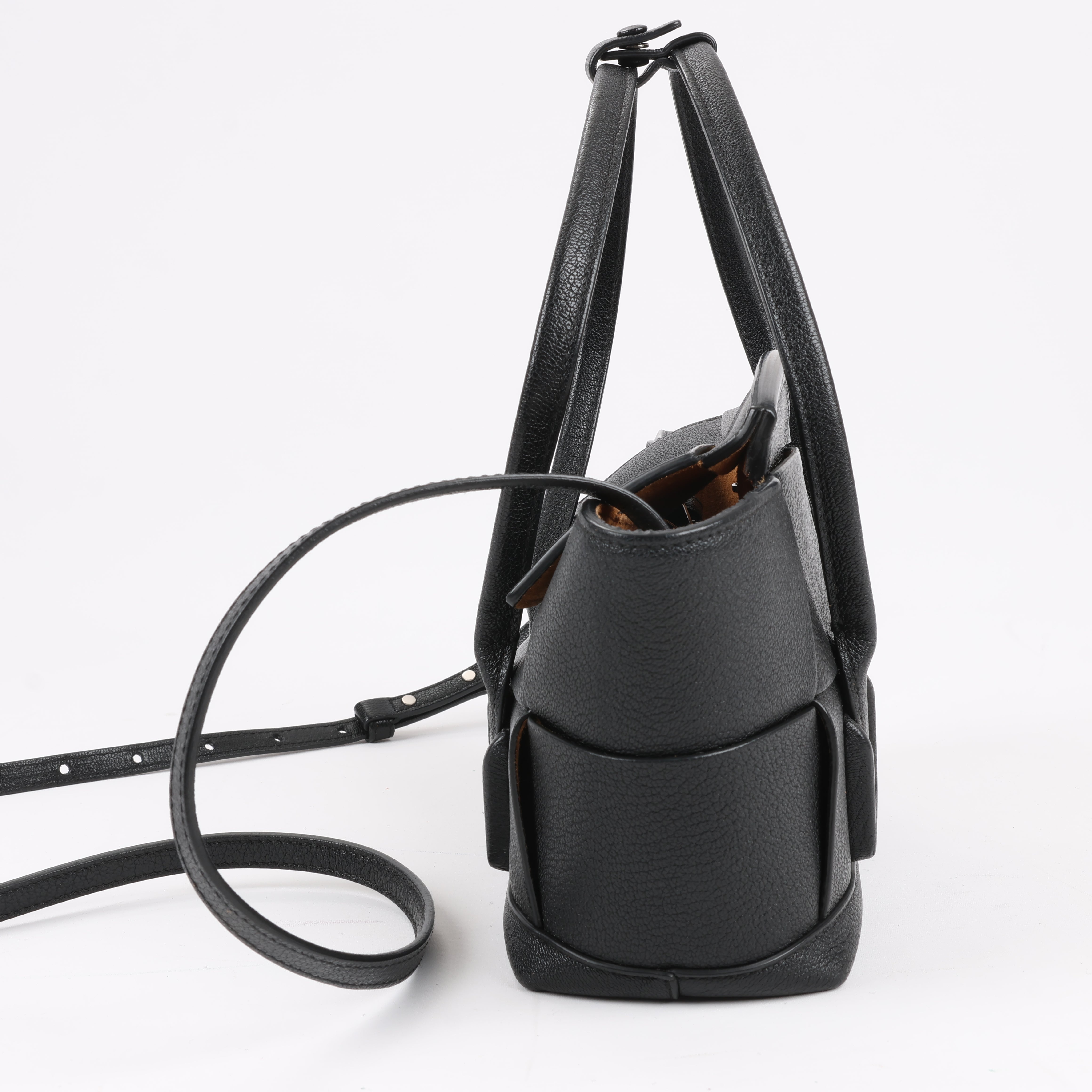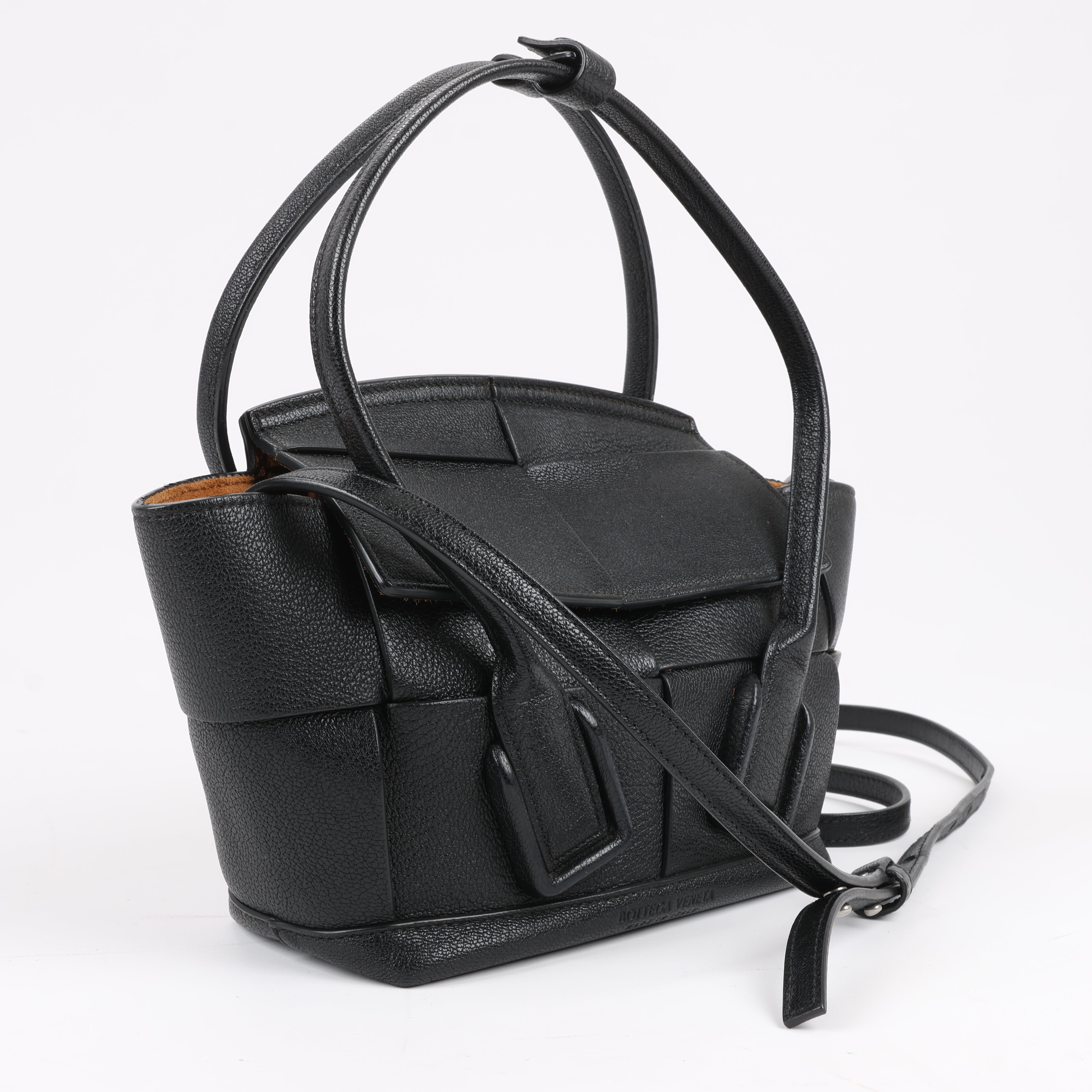 Brand: Bottega Veneta Model: ArcoSize: MiniWidth: 21 cm Height: 19 cmExterior Condition: ExcellentInterior Condition: Very goodCondition Details: The exterior leather is clean and beautiful in excellent condition. The handles and strap are clean and firm in good condition. The interior leather is in good condition except minor rubbings and stains. Top width is 29 cm.Colour: BlackInterior Colour: BrownHardware Colour: SilverMaterial: LeatherComes With: Sholder strap