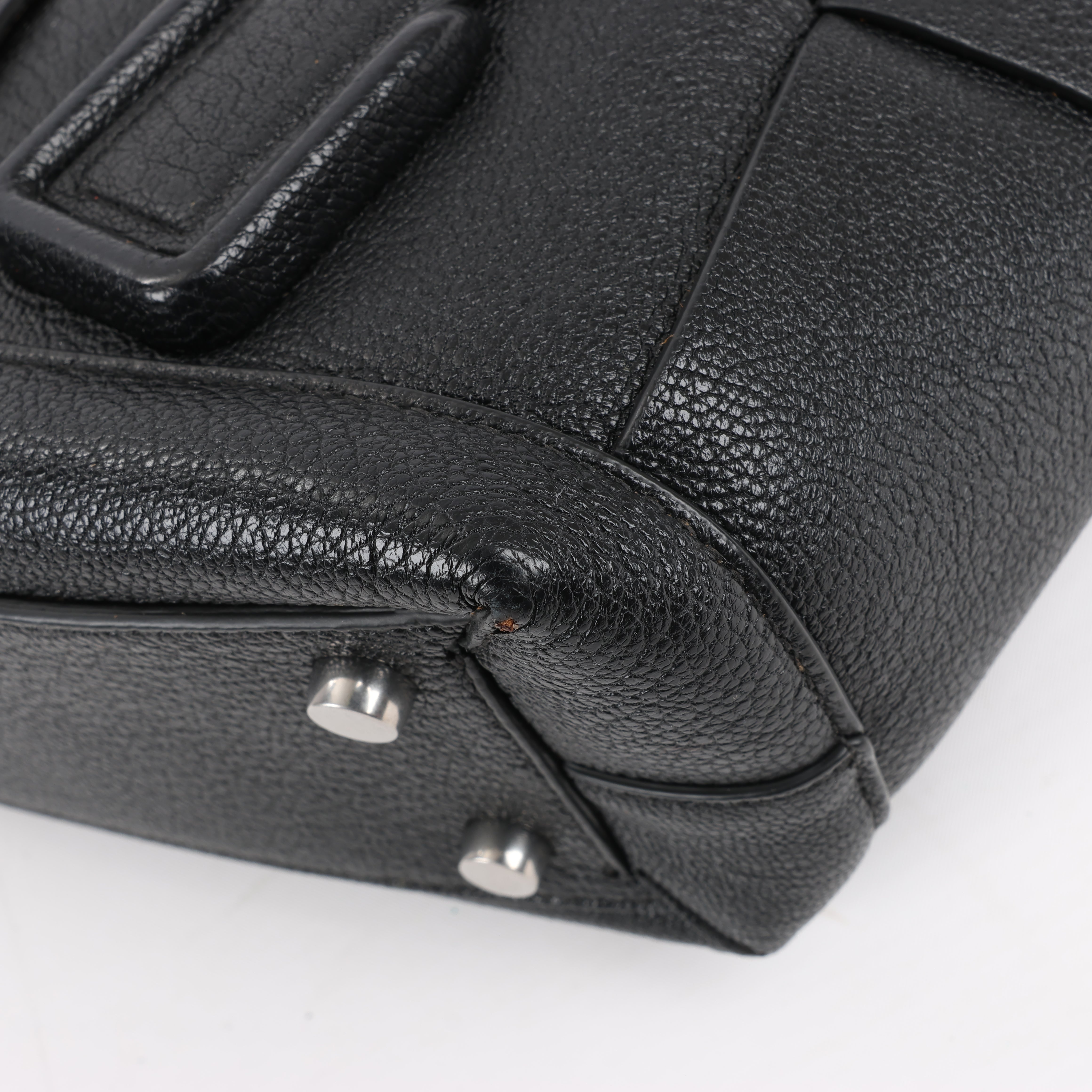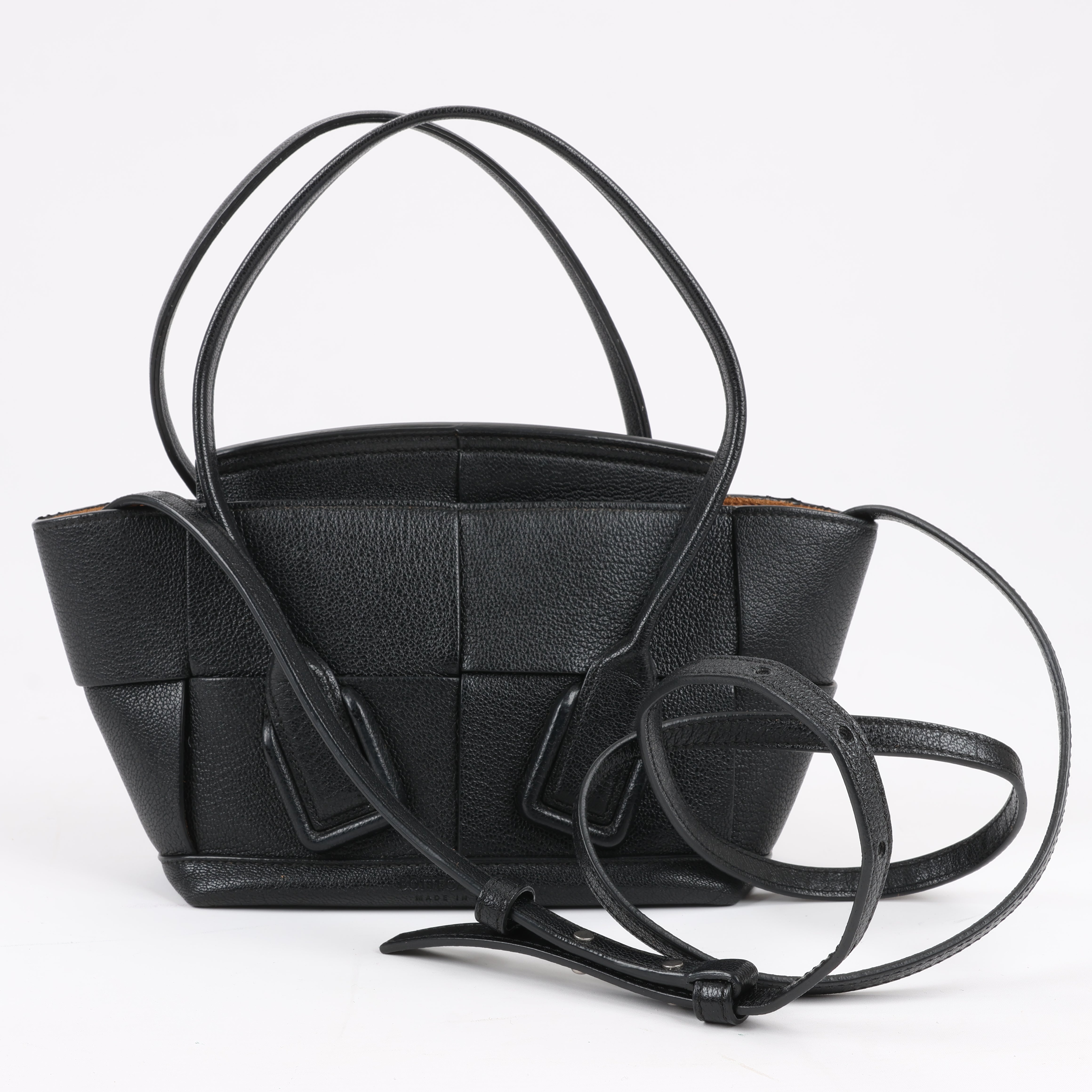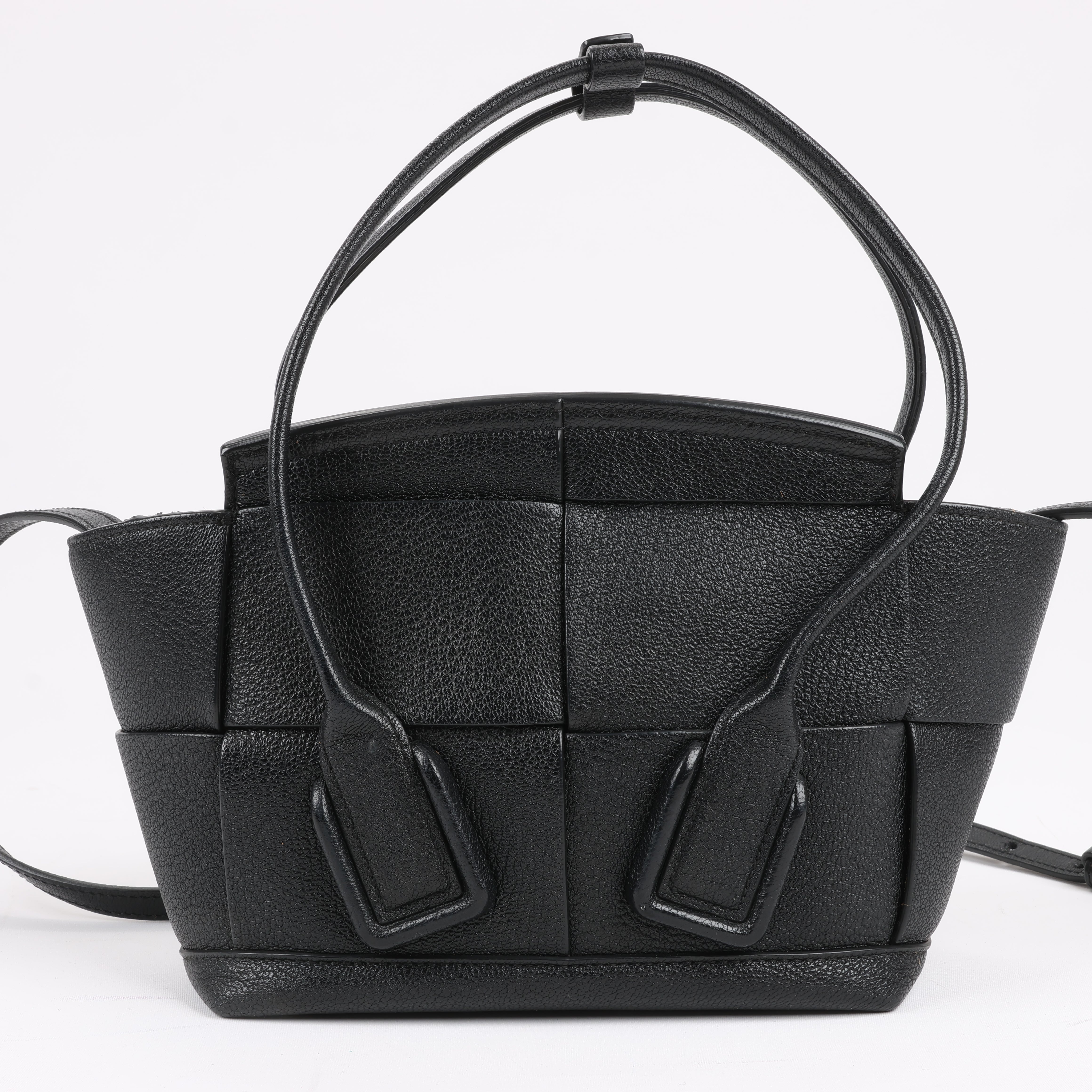 Brand: Bottega Veneta Model: ArcoSize: MiniWidth: 21 cm Height: 19 cmExterior Condition: ExcellentInterior Condition: Very goodCondition Details: The exterior leather is clean and beautiful in excellent condition. The handles and strap are clean and firm in good condition. The interior leather is in good condition except minor rubbings and stains. Top width is 29 cm.Colour: BlackInterior Colour: BrownHardware Colour: SilverMaterial: LeatherComes With: Sholder strap
