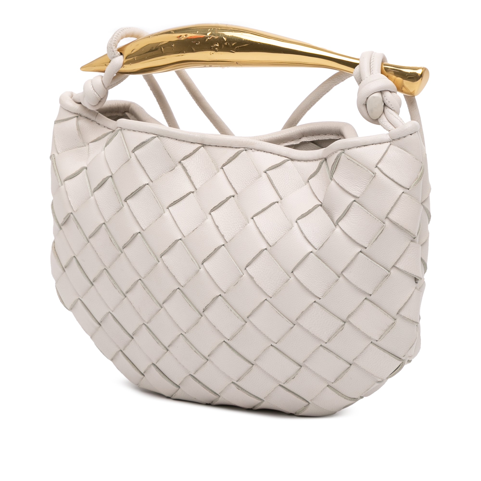 The Sardine satchel features a woven lambskin leather body, a gold-tone metal handle, rolled leather straps, and an open top with magnetic closure. Retail Price: 3400.00
