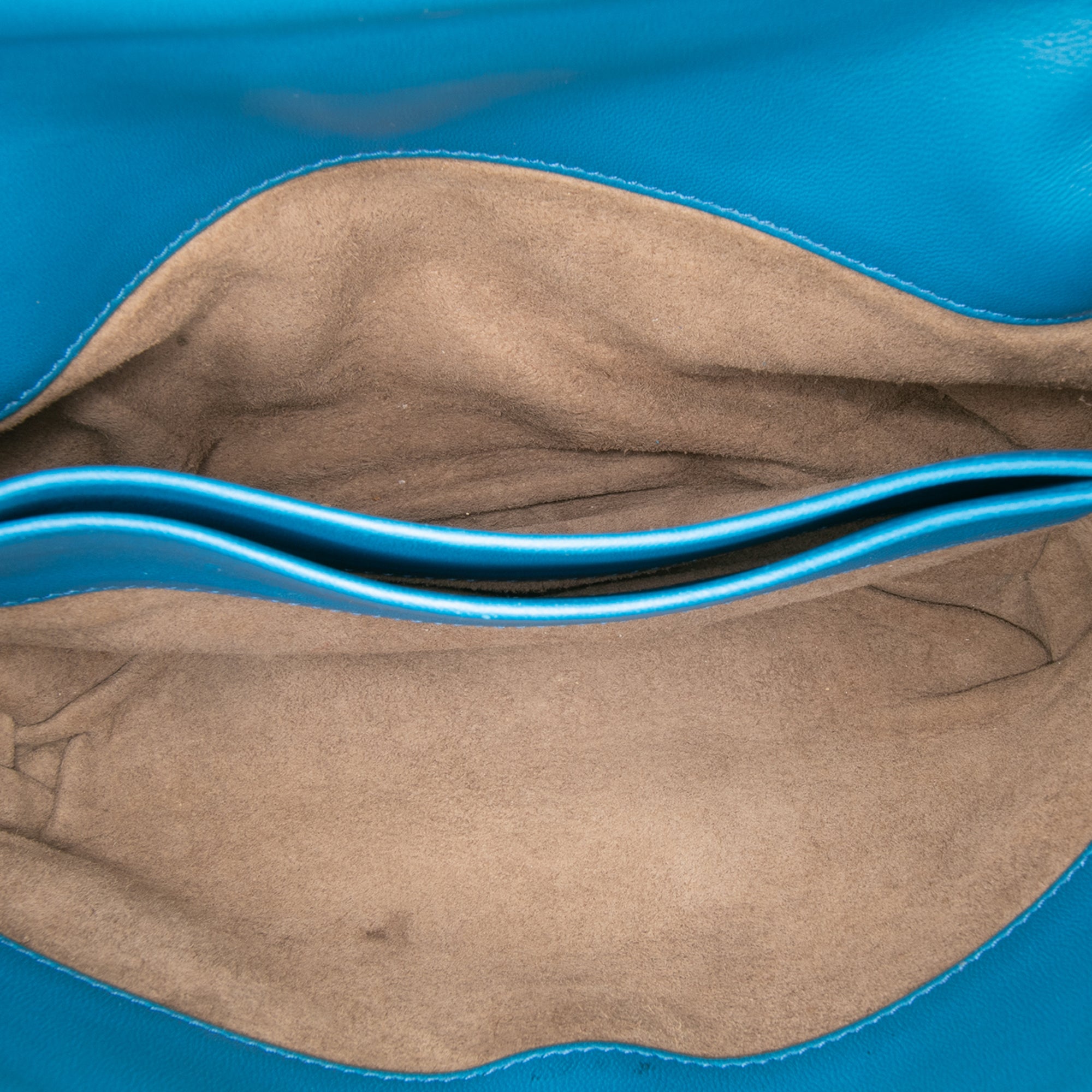 The Olimpia features a woven leather body, a chain link shoulder strap with leather guard, a flap with magnetic snap closure, and an interior slip pocket. Retail Price: 3300.00