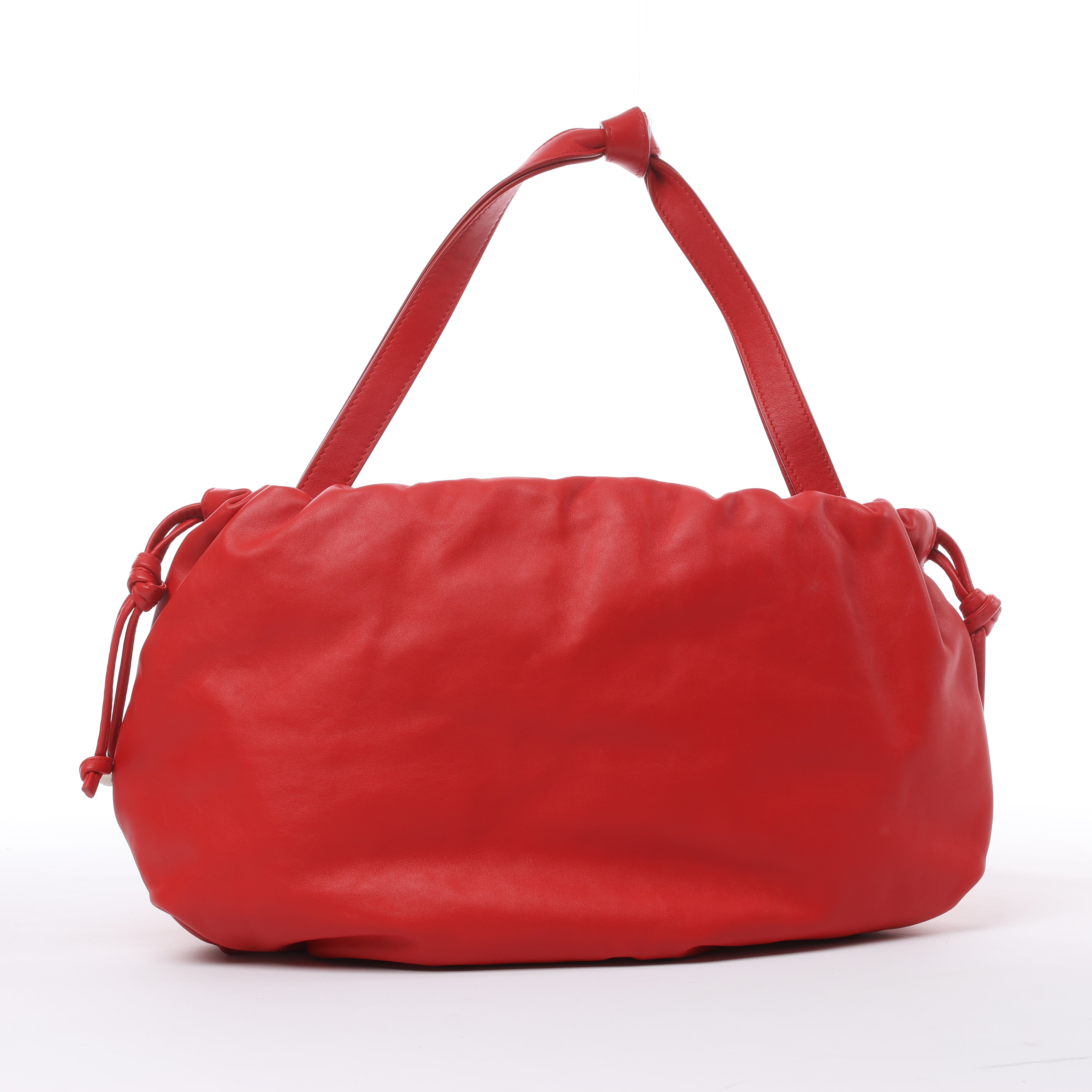 The Bottega Veneta Bulb bag in vibrant red smooth leather offers a sculptural silhouette with drawstring sides and a knotted handle. A statement in modern minimalism, it's a bold yet refined piece from Daniel Lee’s era of elevated essentials.
