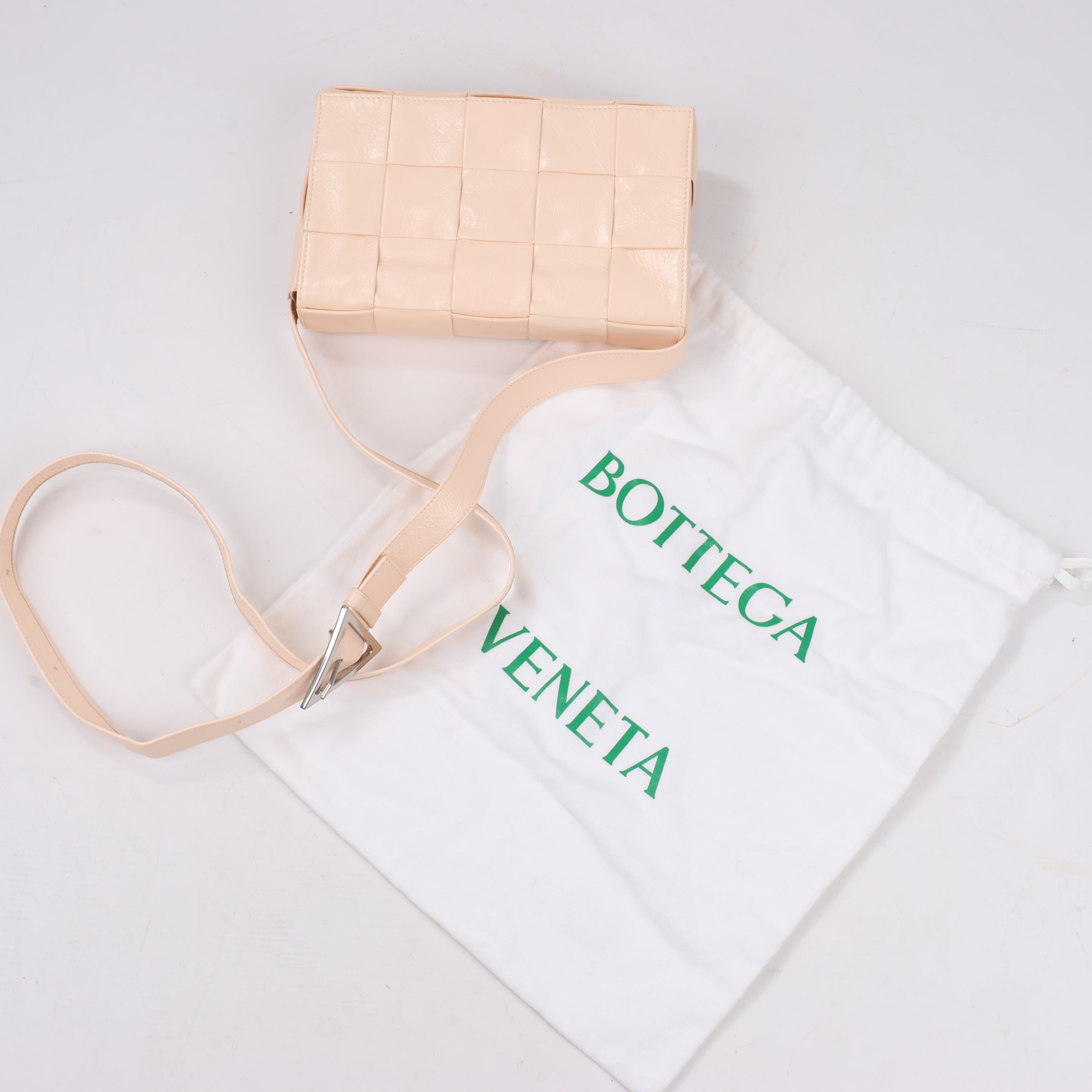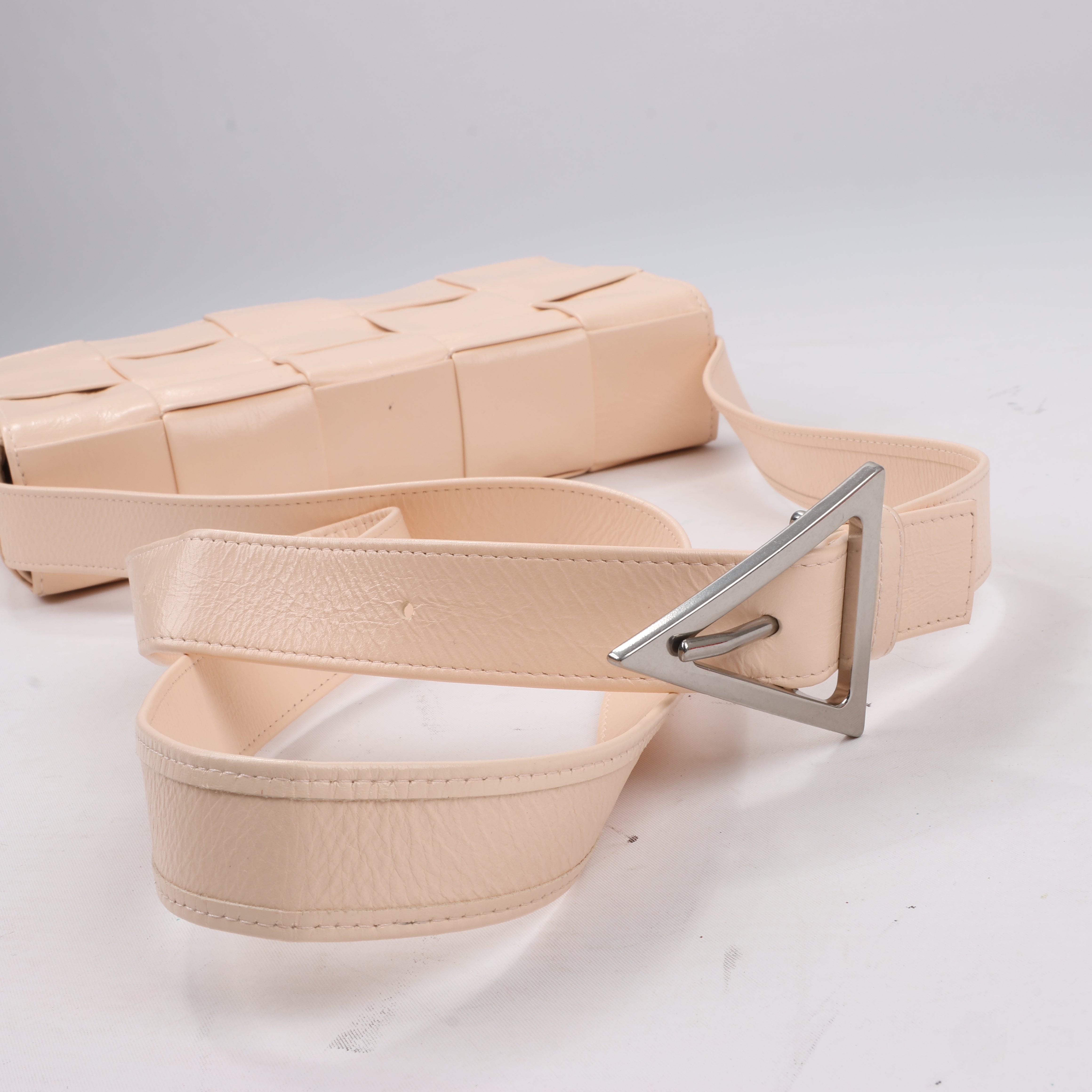 The Bottega Veneta Maxi Intrecciato Cassette Leather Shoulder Bag in Powder Beige with pink and beige tone features the iconic oversized woven leather design, bold color, and an adjustable strap. A striking and contemporary piece, it offers a fresh take on the brand's signature craftsmanship.