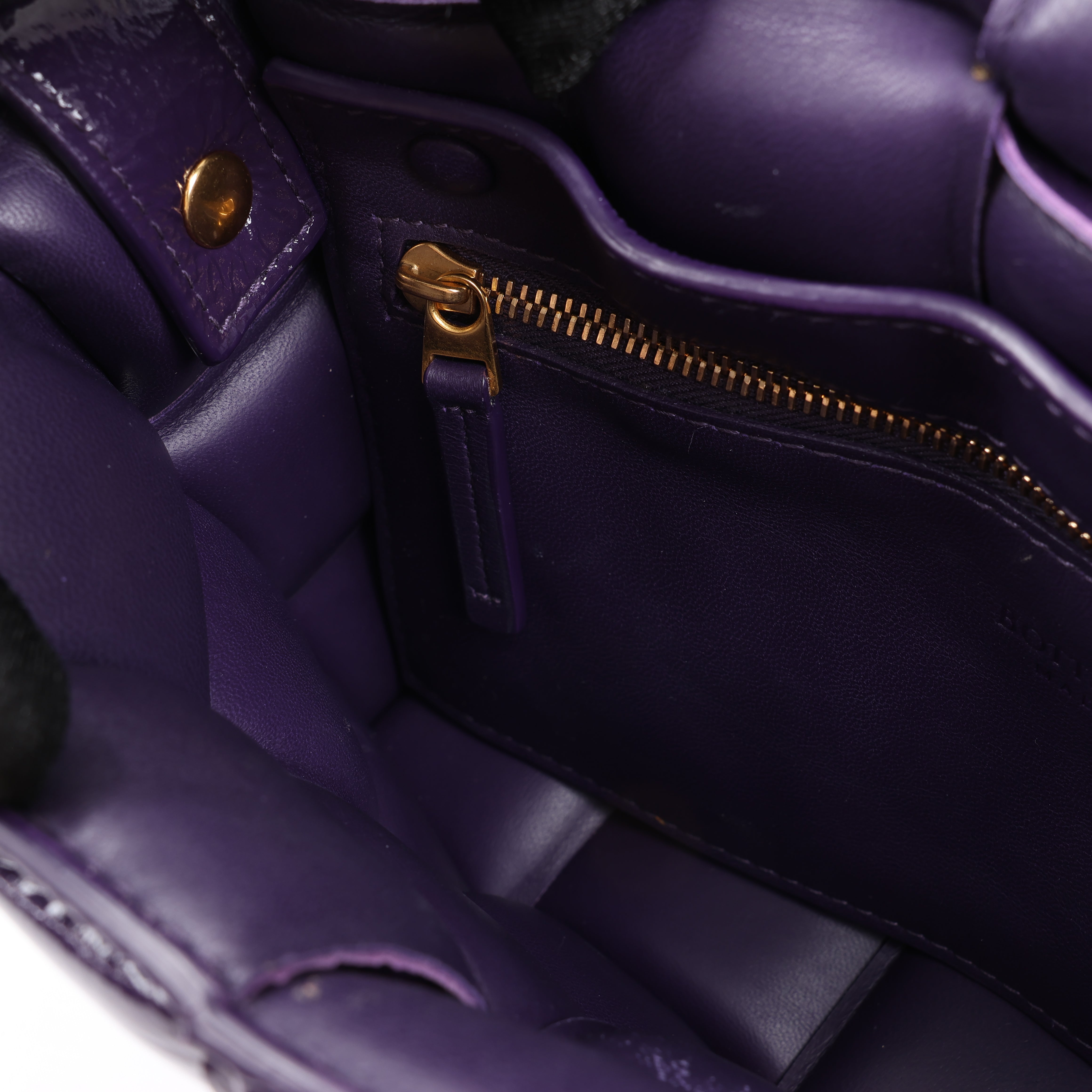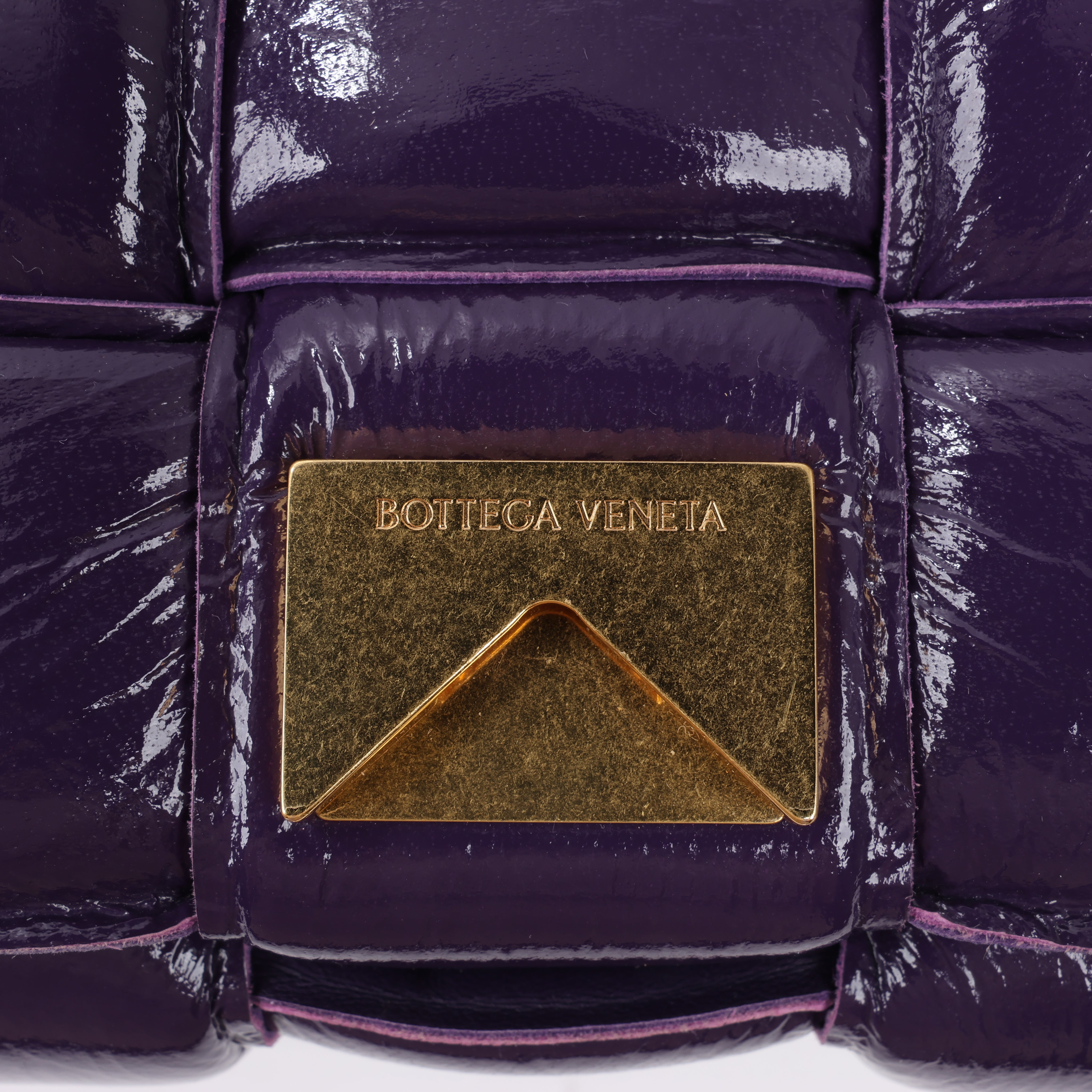 Brand: Bottega Veneta Model: Padded Cassette Size: -Width: 24.5 cmHeight: 18 cmExterior Condition: ExcellentInterior Condition: Excellent Condition Details: The exterior leather is clean and beautiful. The strap is in good condition, except some creases. The interior is clean and in great condition.Colour: PurpleInterior Colour: PurpleHardware Colour: GoldMaterial: Patnent LeatherComes With: Dustbag