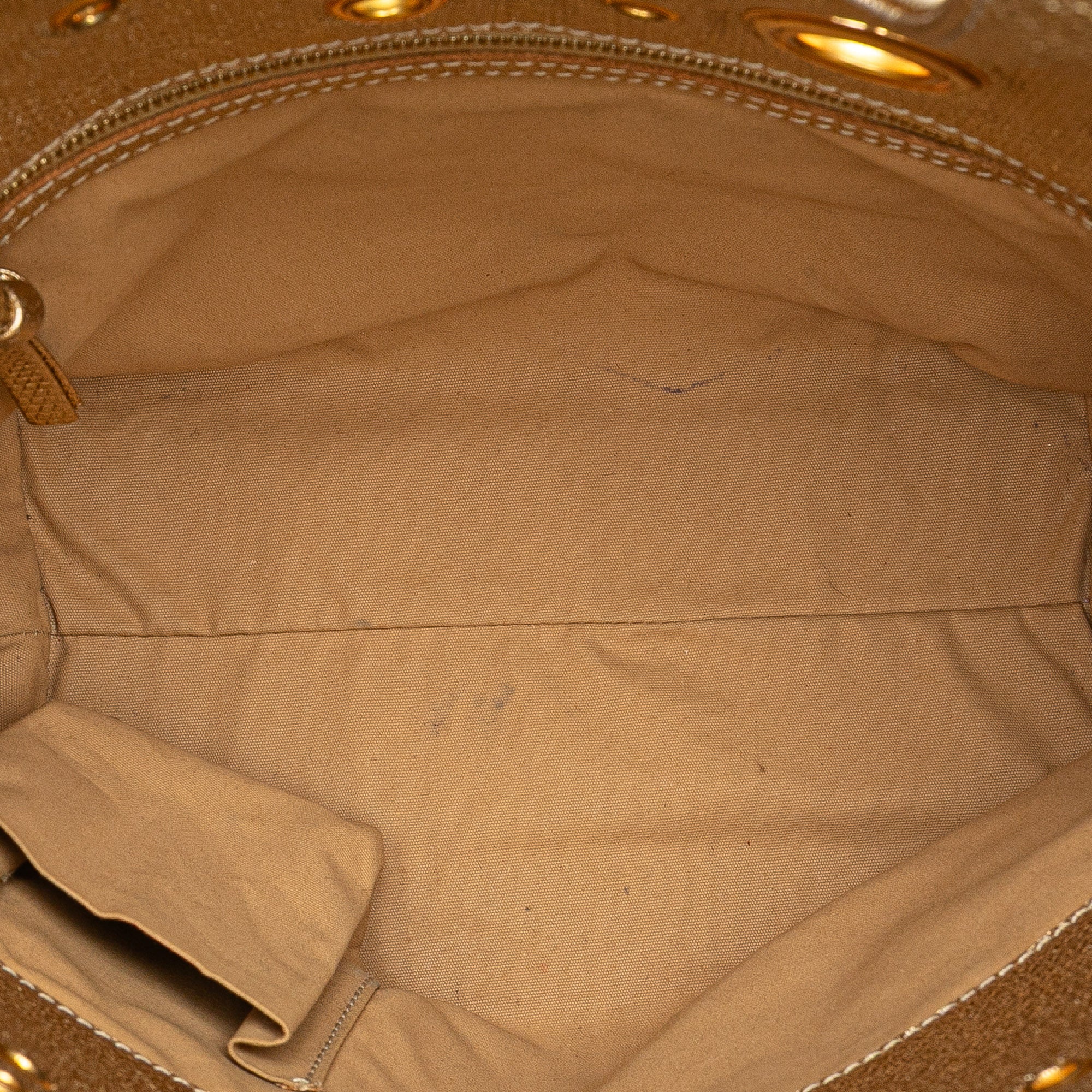 This handbag features a leather body with grommet details, flat leather handles, an open top, and interior zip and slip pockets. Retail Price: 980.00