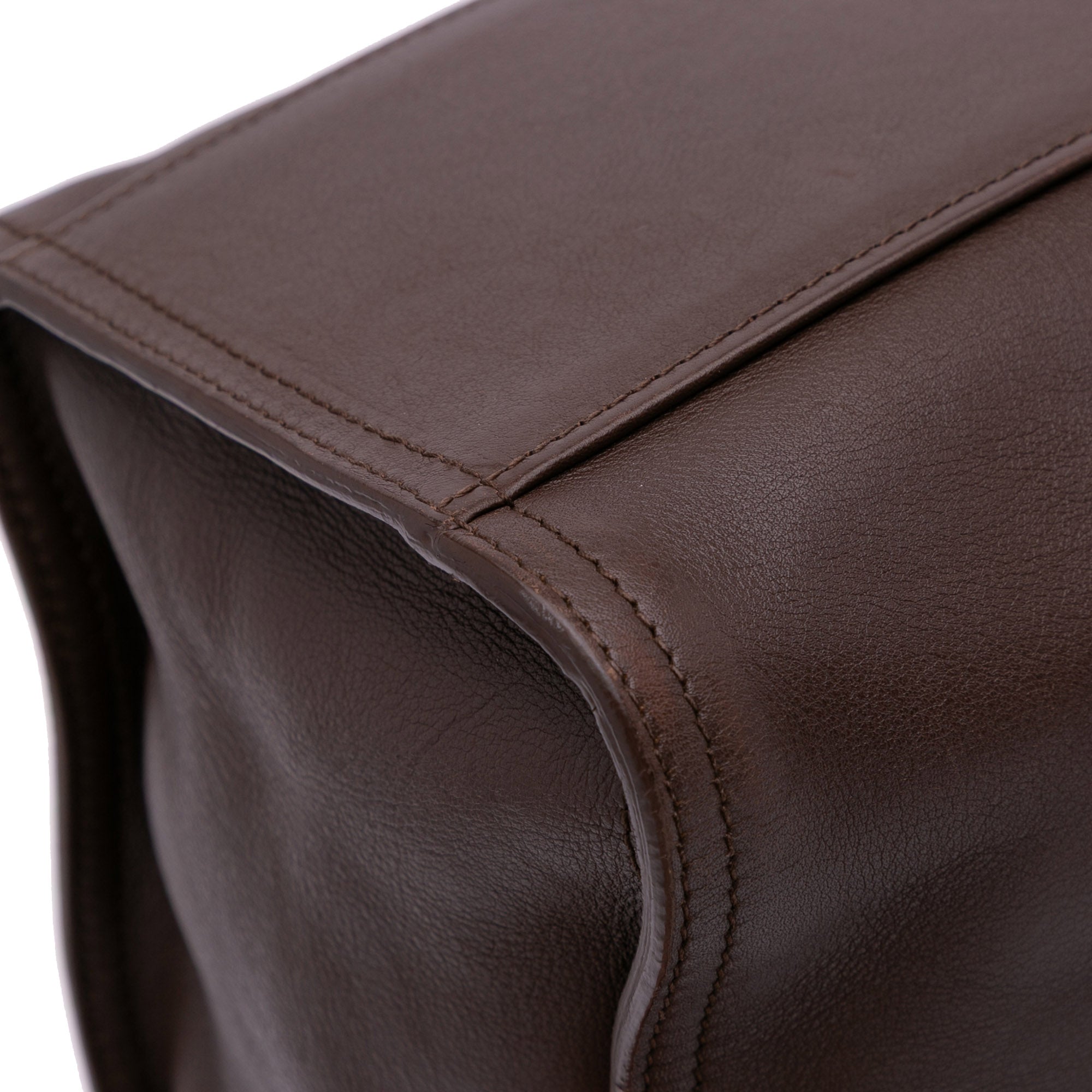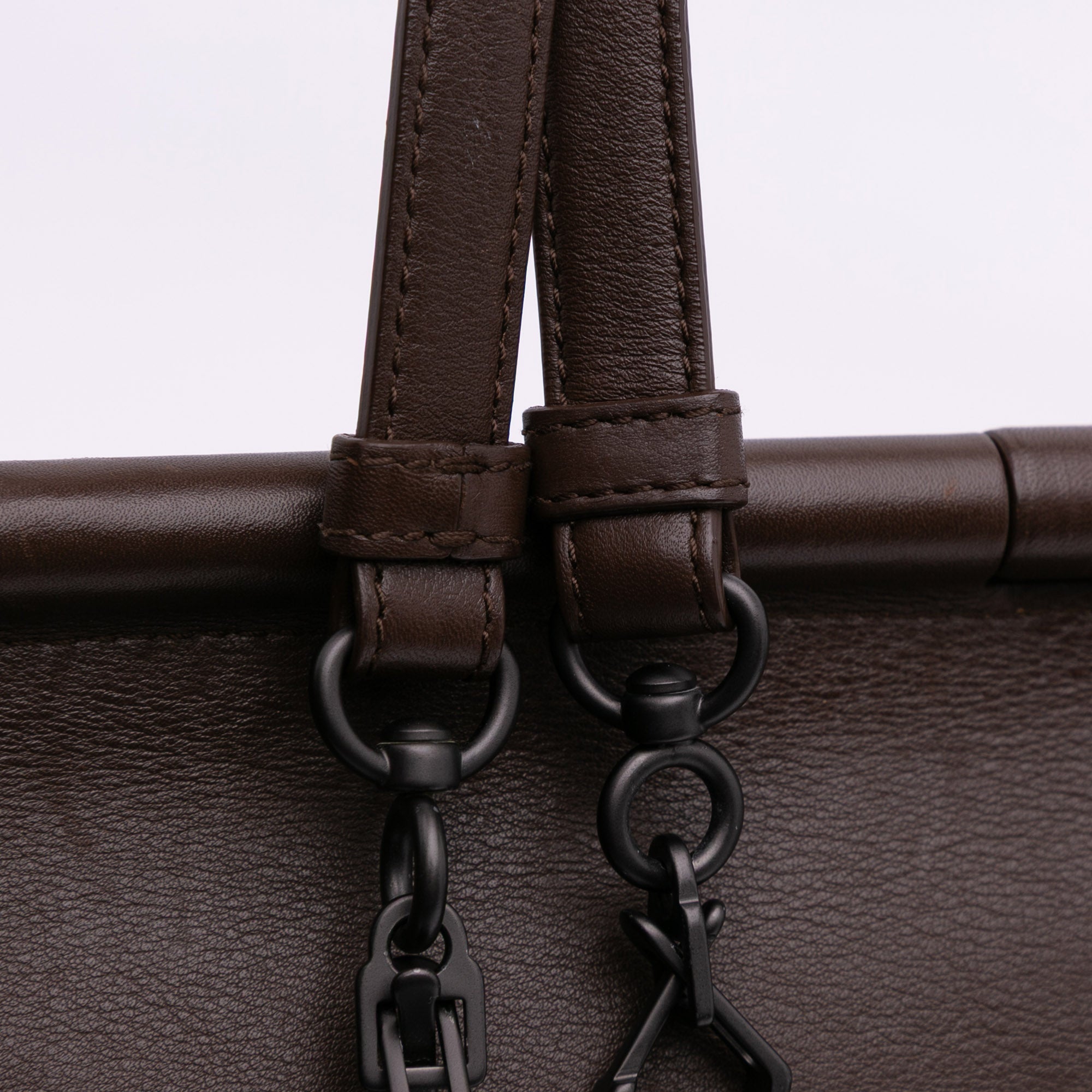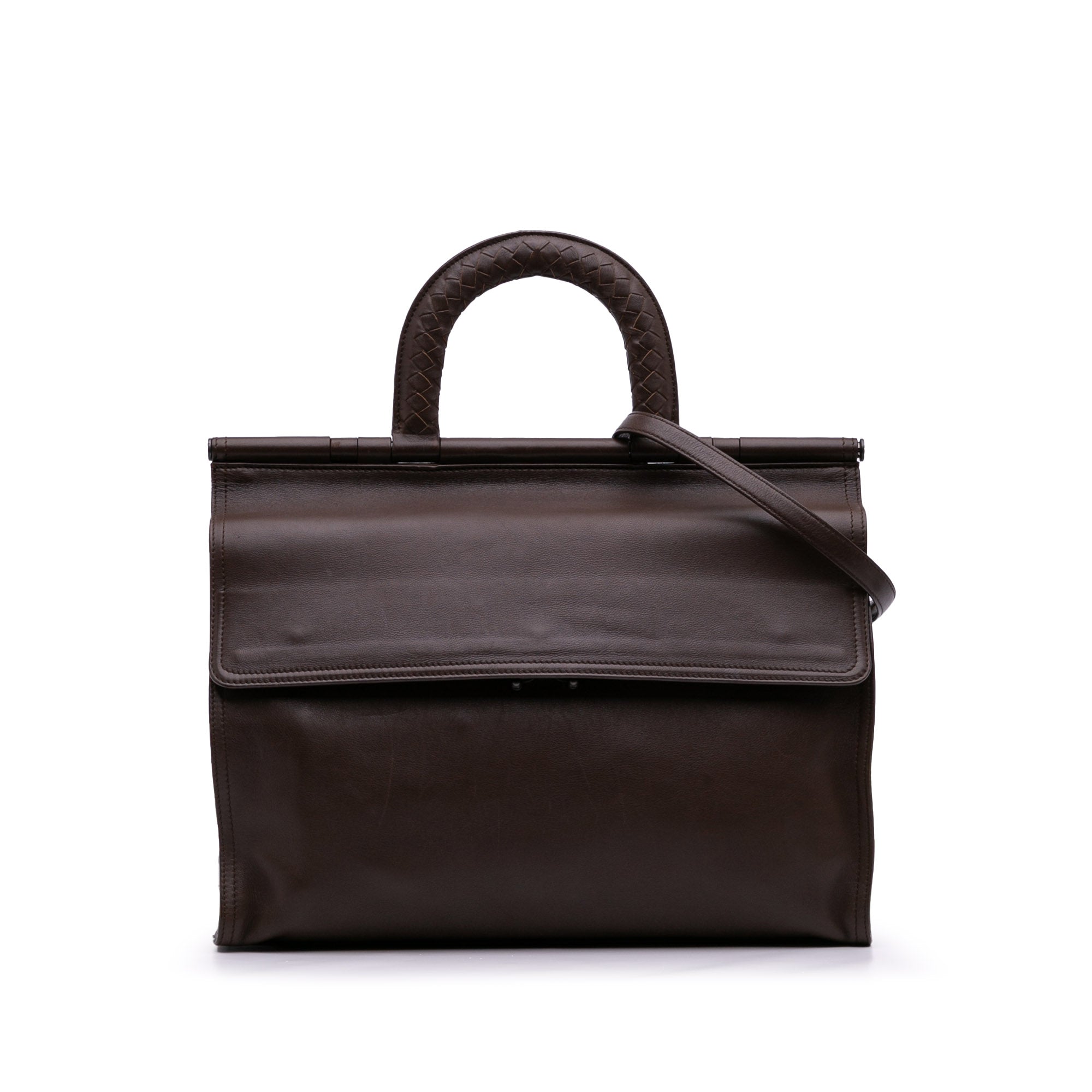 This satchel features a leather body, flat woven leather top handles, a detachable flat leather strap, a front flap with snap buttons closures, and interior zip and slip pockets. Retail Price: 1420.00