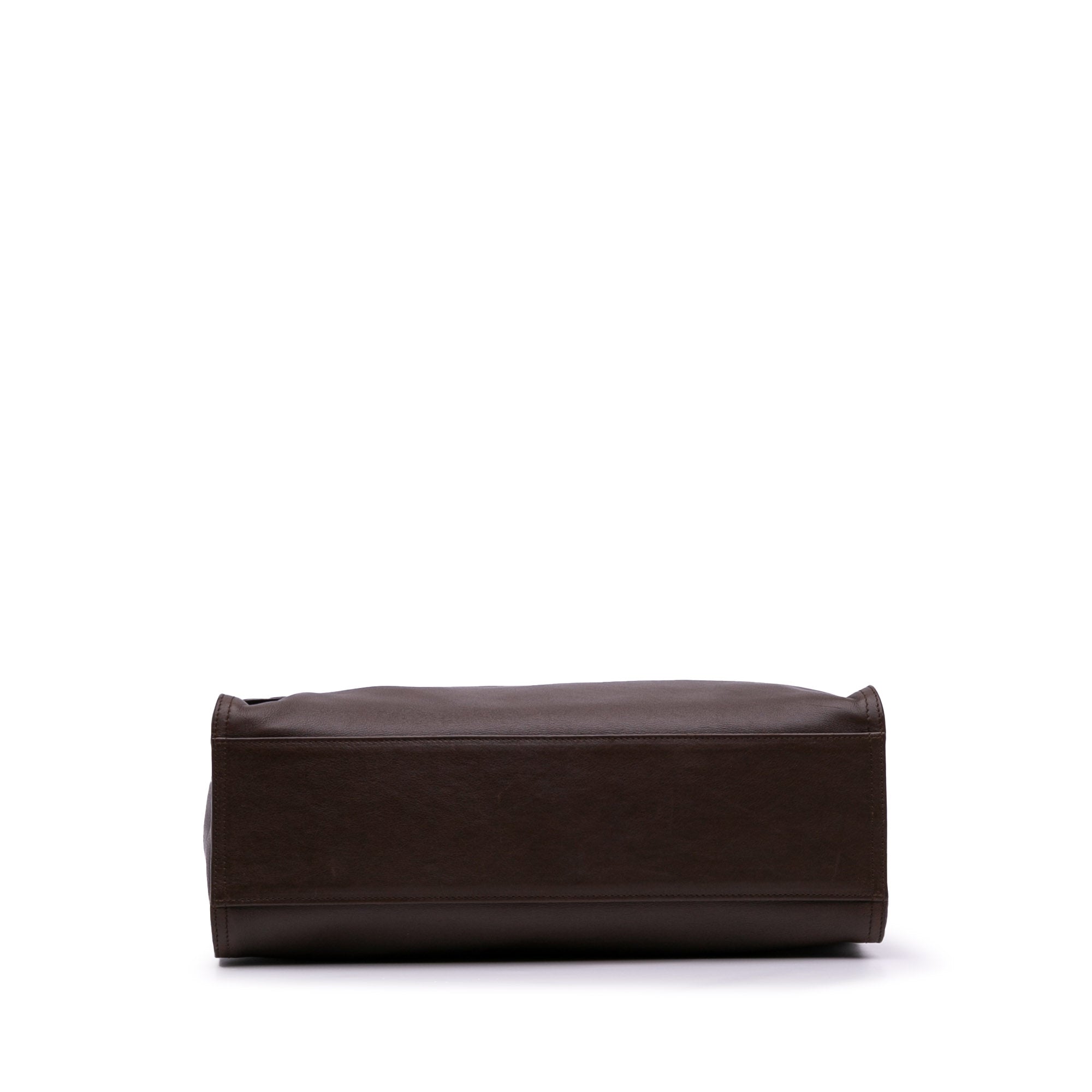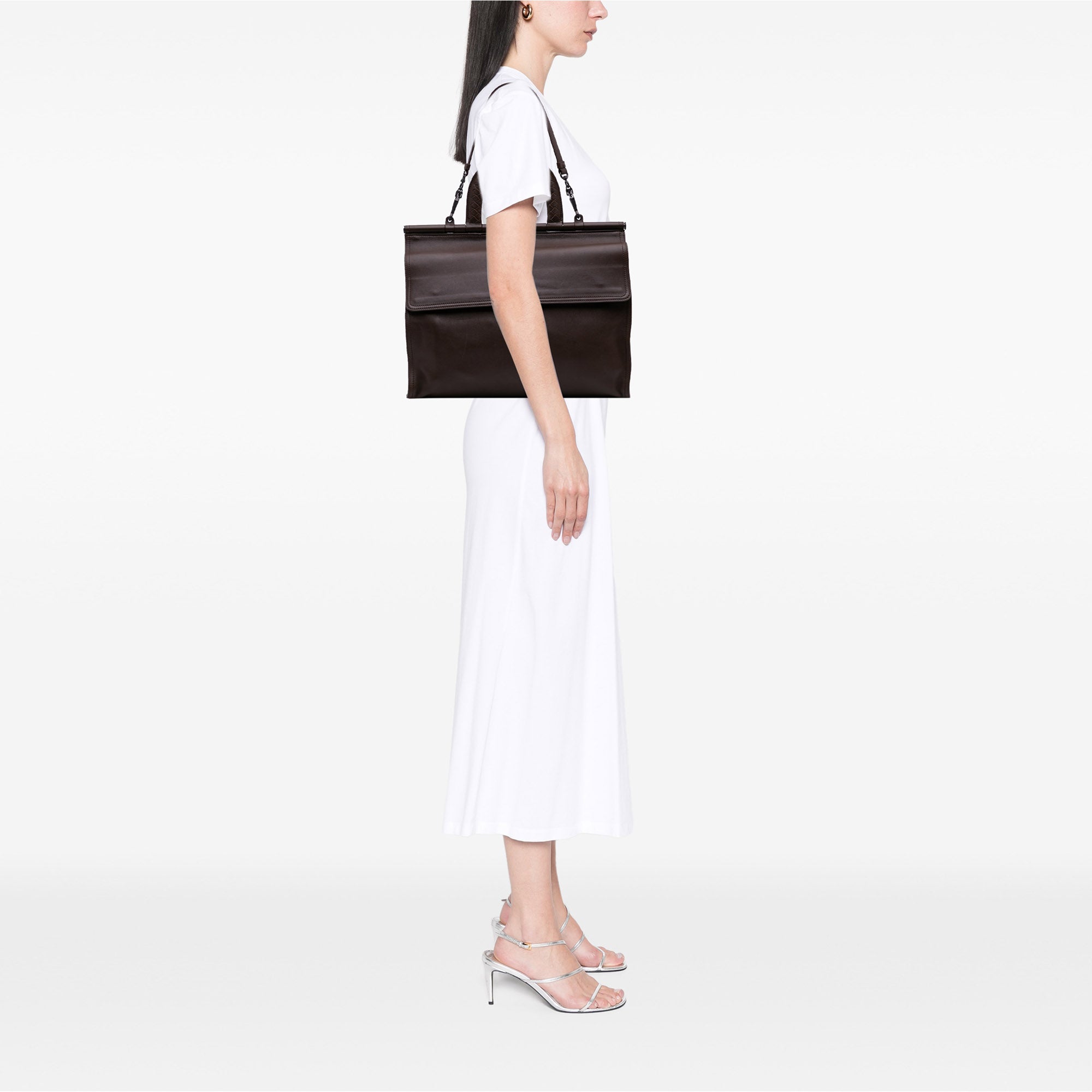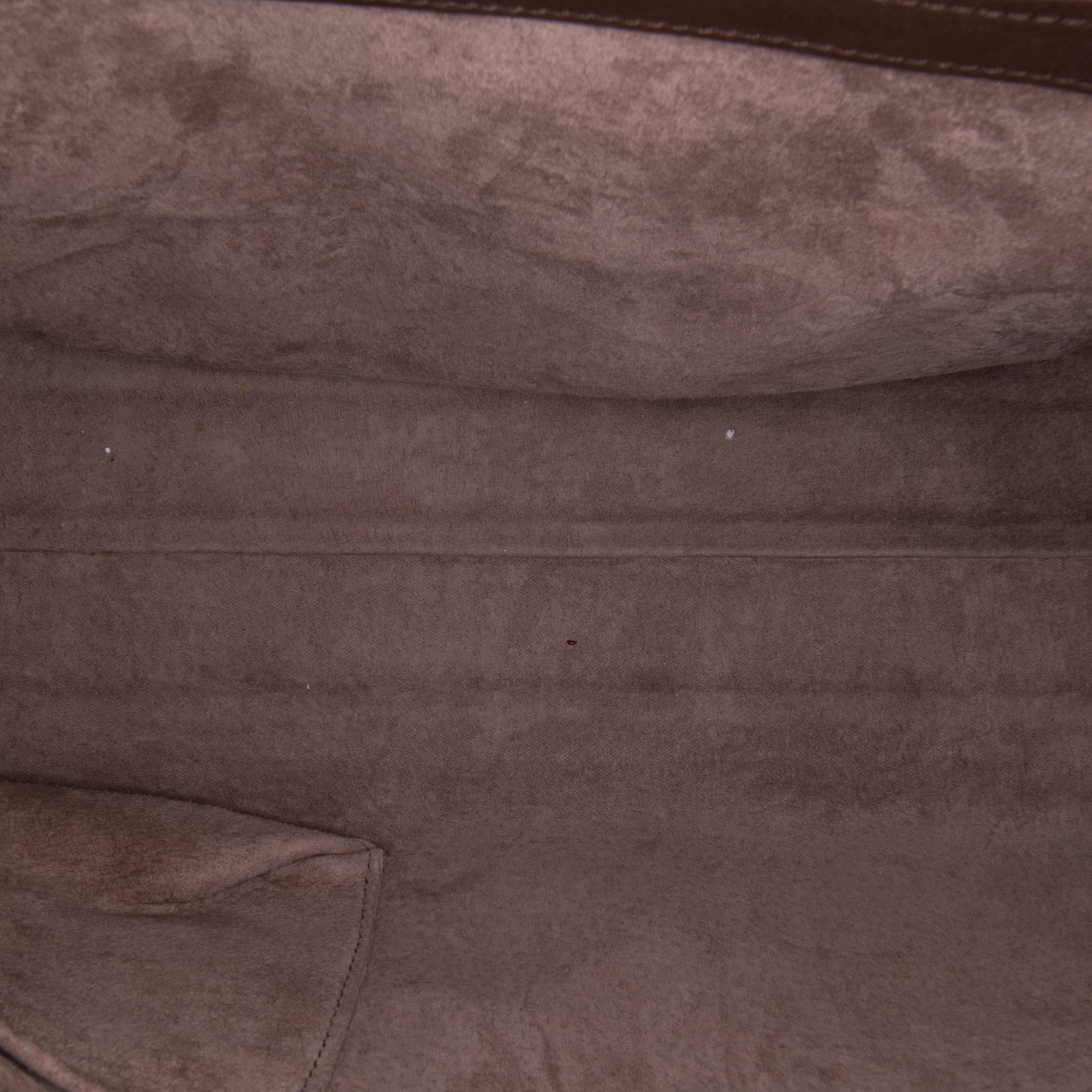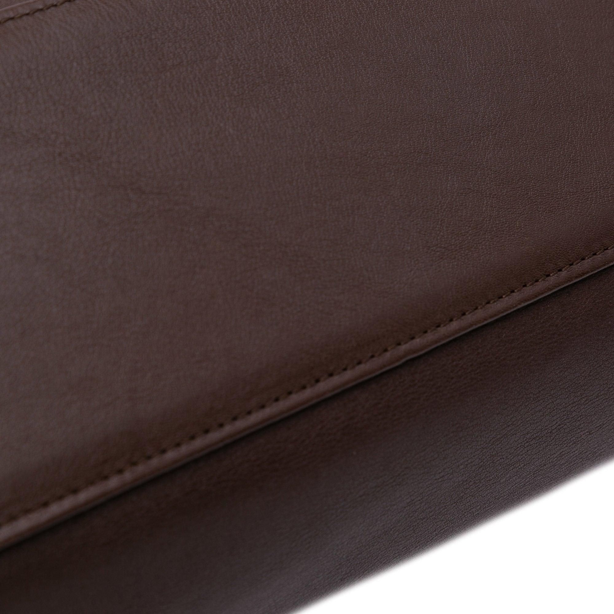 This satchel features a leather body, flat woven leather top handles, a detachable flat leather strap, a front flap with snap buttons closures, and interior zip and slip pockets. Retail Price: 1420.00