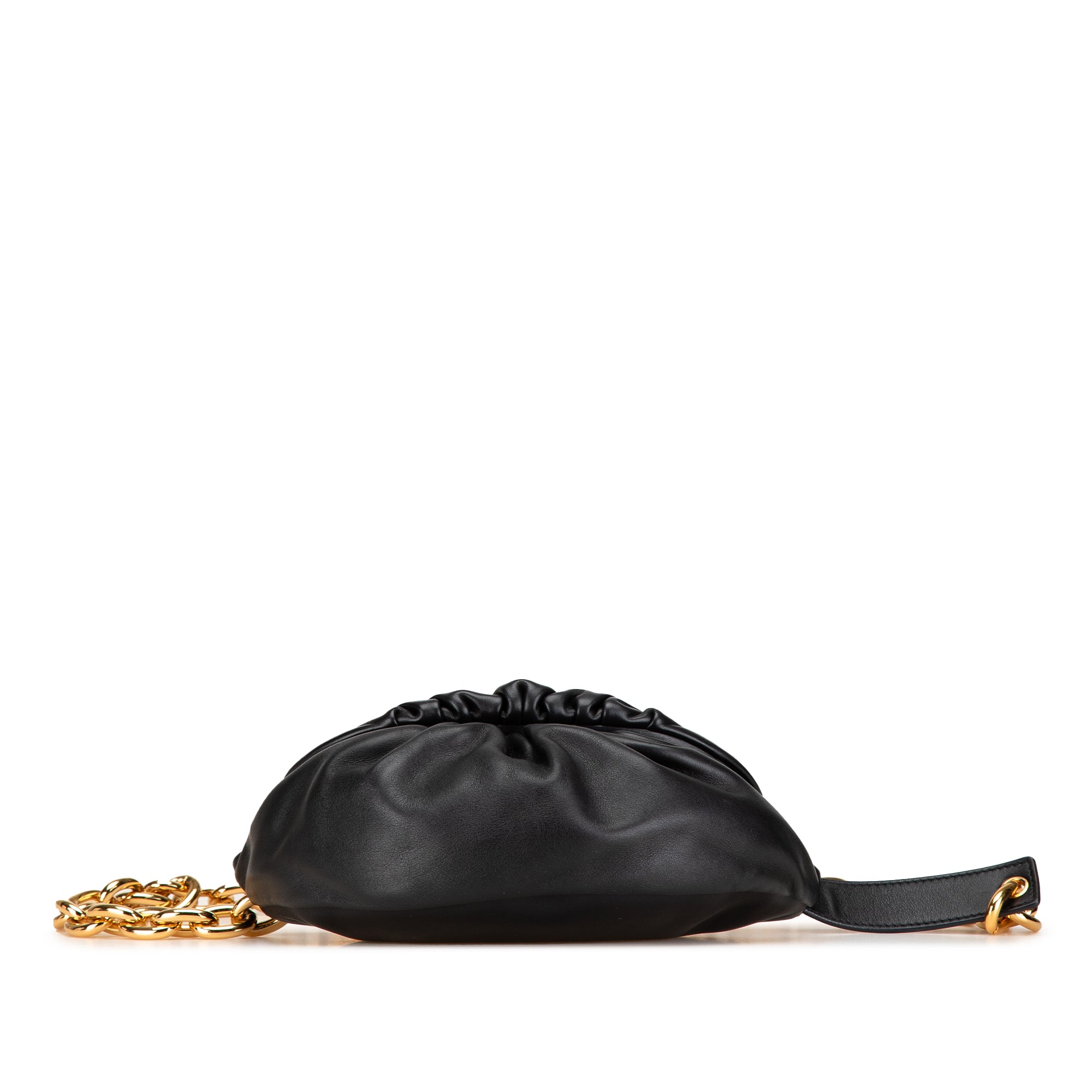 The Belt Chain Pouch belt bag features a leather body, a gold-tone chain strap, and a top snap closure. Retail Price: 1980.00