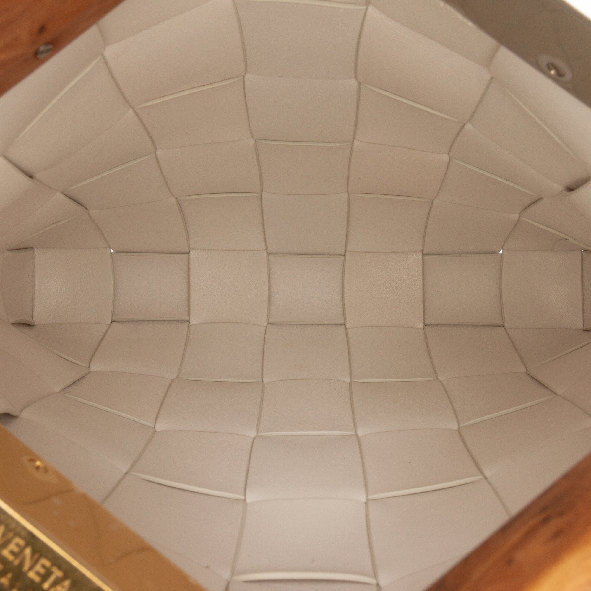 The Snap clutch features a woven leather body, and a gold-tone and wood accent top snap closure. Retail Price: 3400.00