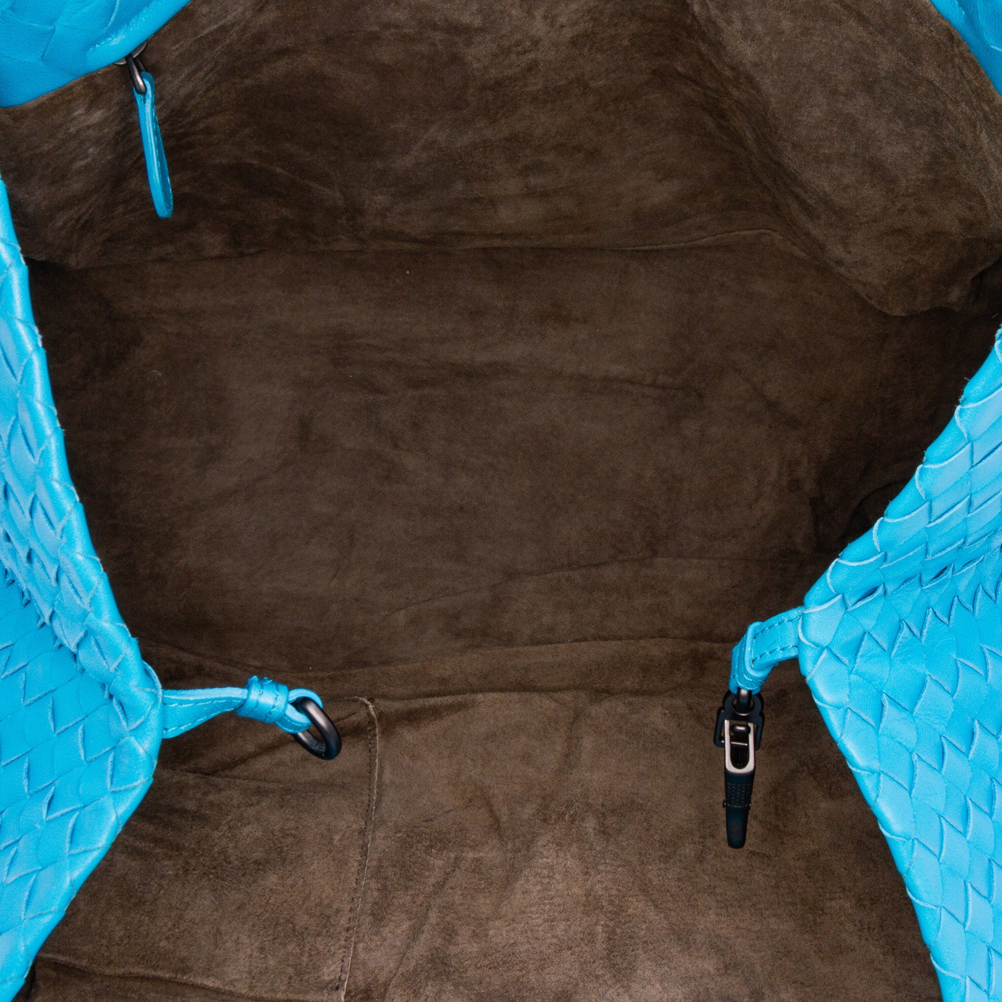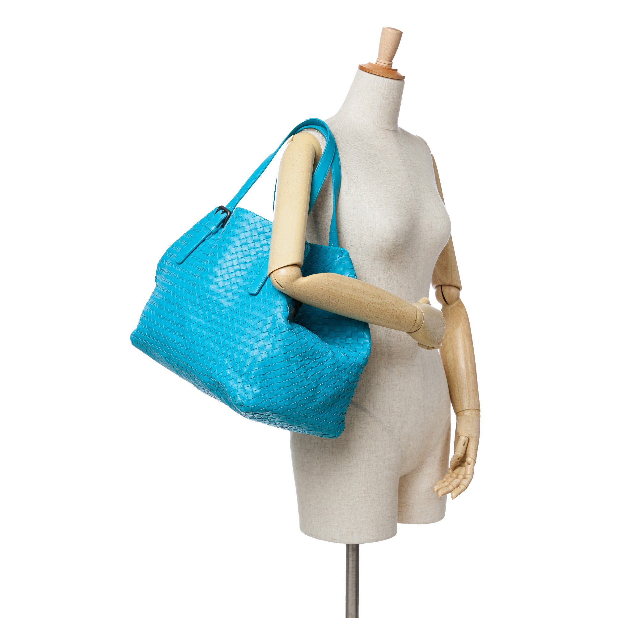 The Cesta tote bag features a woven leather body, adjustable flat leather straps, an open top with a lobster clasp closure, and interior zip and slip pockets. Retail Price: 3650.00