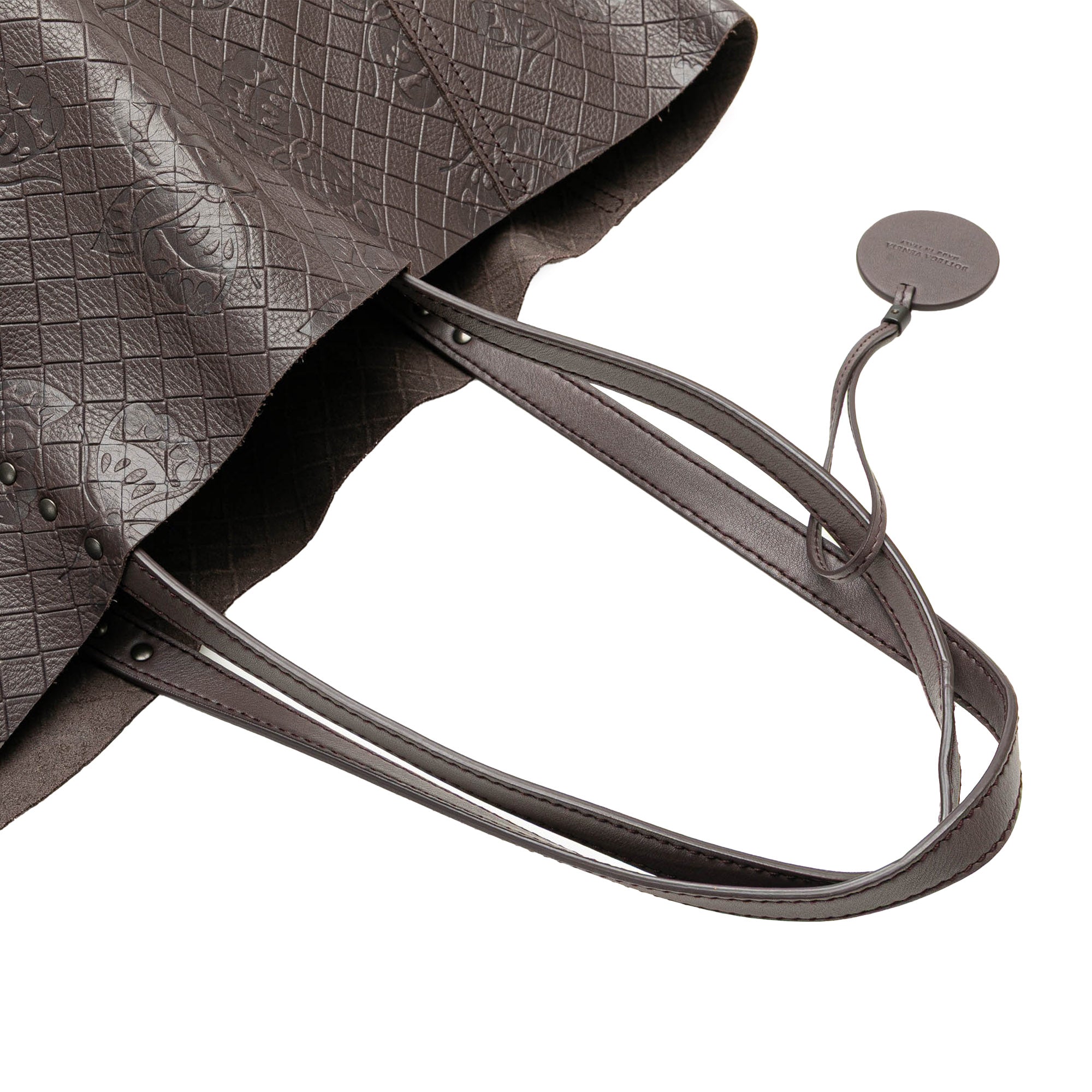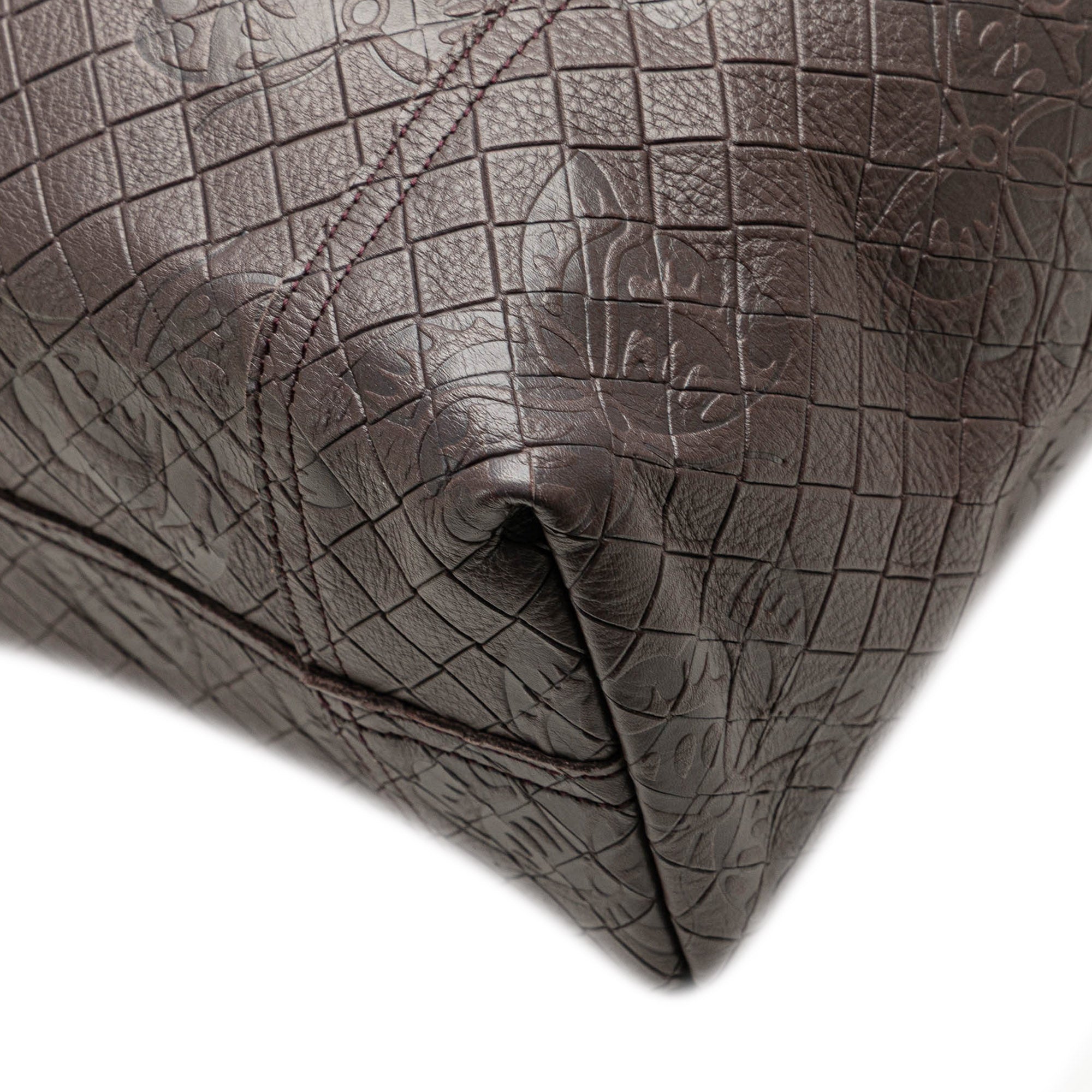 This tote bag features an embossed leather body, flat leather handles, and an open top. Retail Price: 850.00