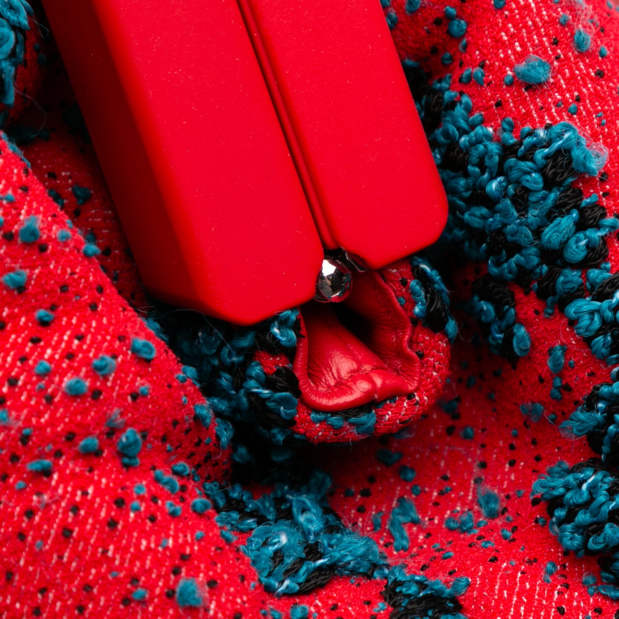 The Point Triangle features a tweed body, a triangle-shaped handle, an adjustable flat leather strap, and a top magnetic snap closure. Inclusion: Dust bag. Retail Price: 2990.00