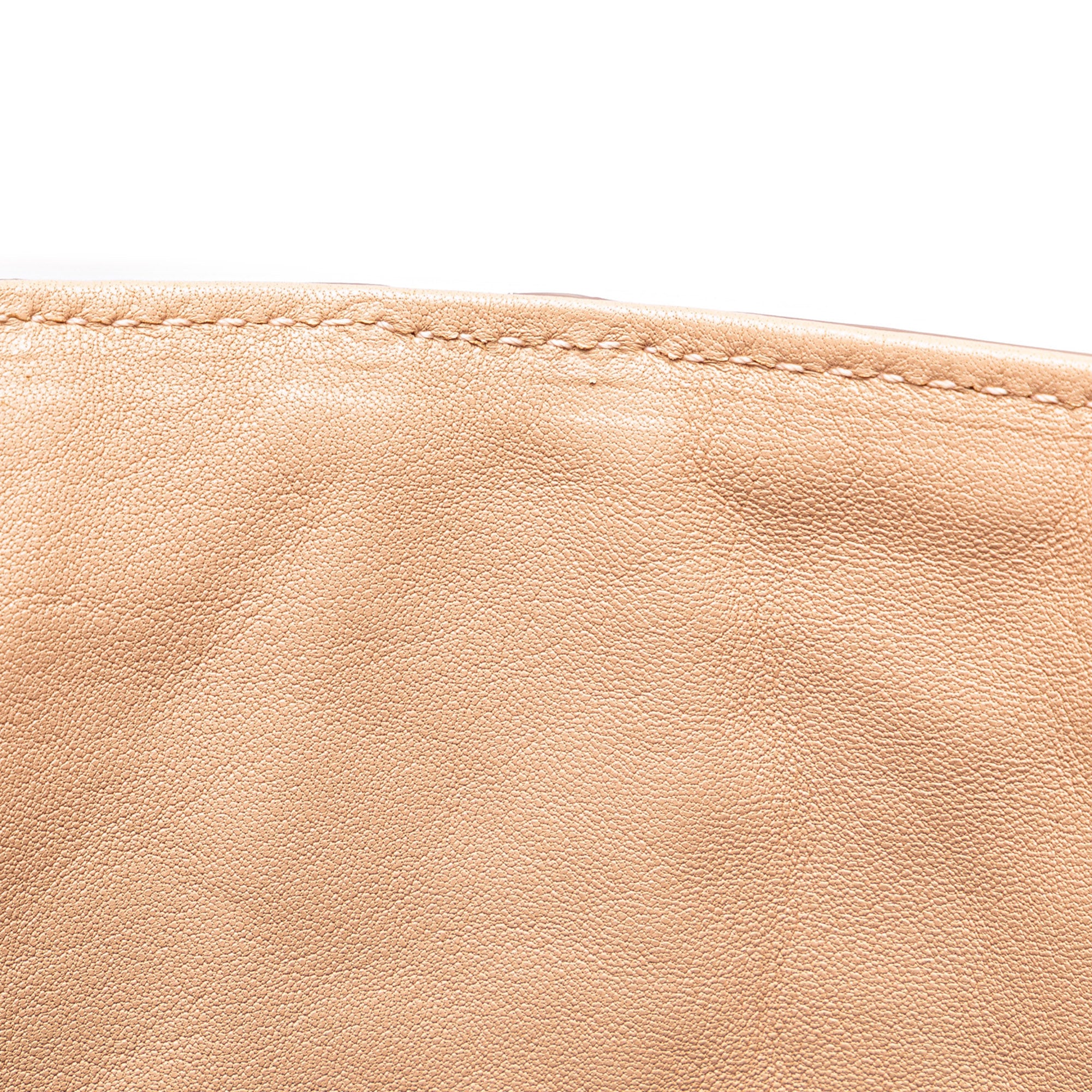 This tote bag features a woven leather body, flat leather straps, an open top with a lobster clasp closure, and interior zip and slip pockets. Inclusion: Dust bag. Retail Price: 1250.00