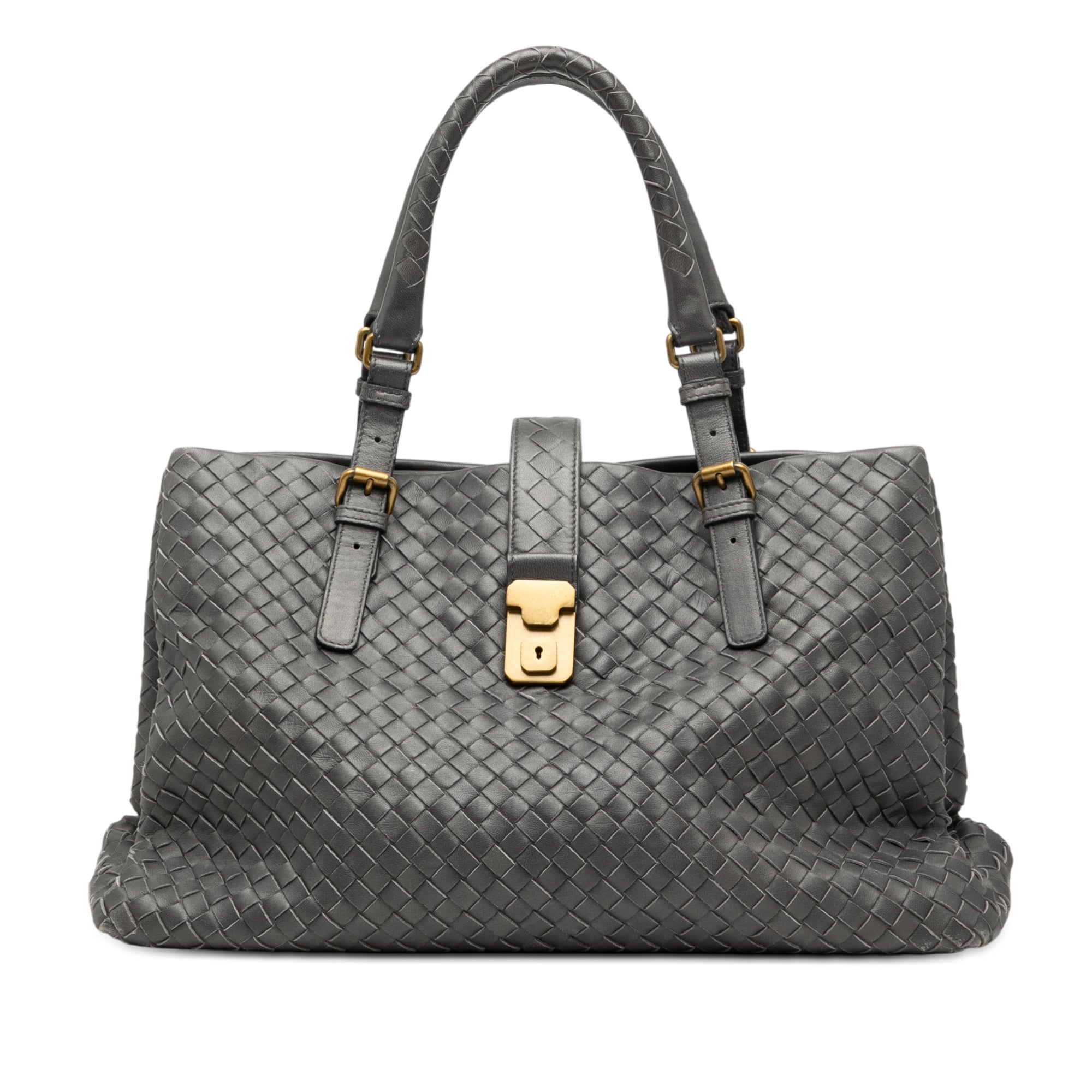 The Roma features a woven nappa leather body, rolled handles, a top strap with a push lock and magnetic closure, interior compartments, and interior zip and slip pockets. Retail Price: 2000.00