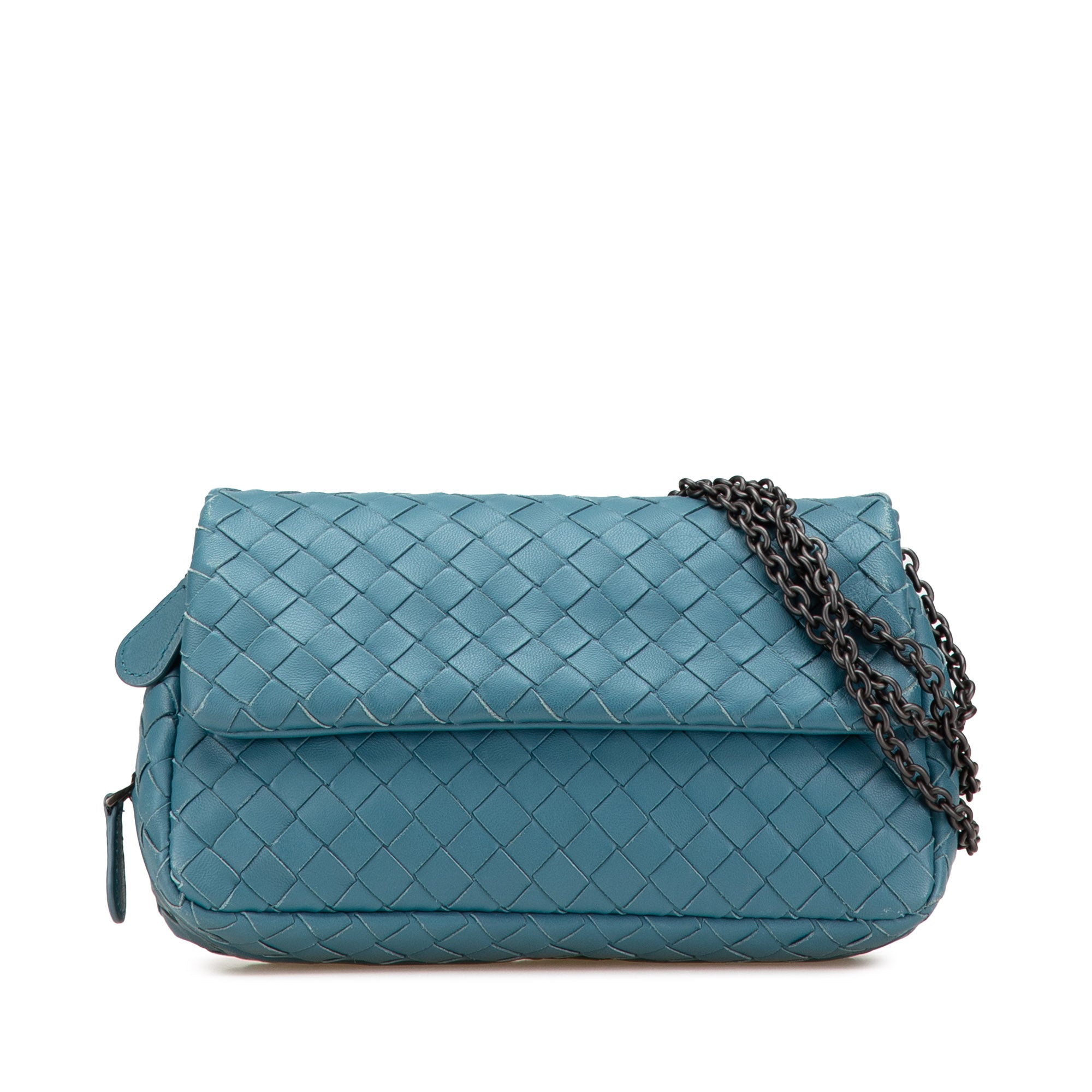 This crossbody bag features a woven leather body, a chain link strap, a flap with snap closure, a base expansion zip, and interior slip pockets. Retail Price: 1380.00