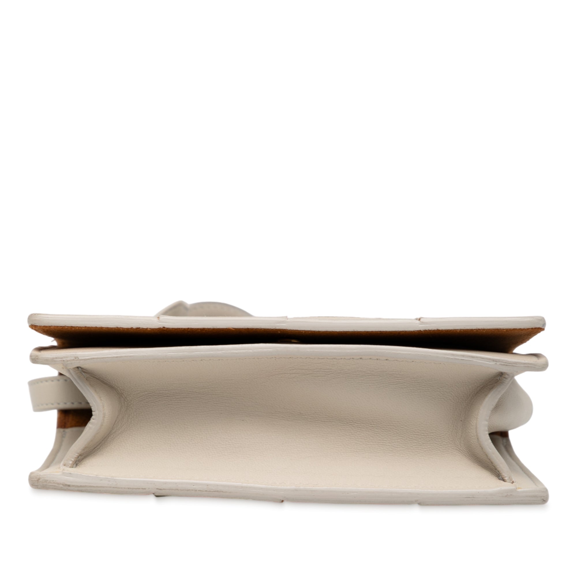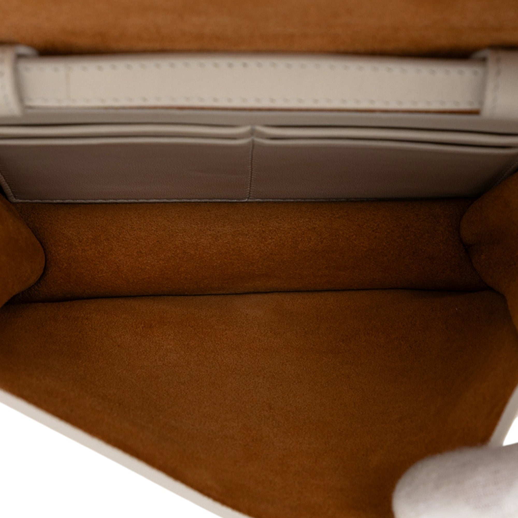 The Cassette features a woven nappa leather body, a flat leather strap, a front flap with magnetic snap button closure, and interior slip pockets. Inclusion: Dust bag. Retail Price: 2500.00