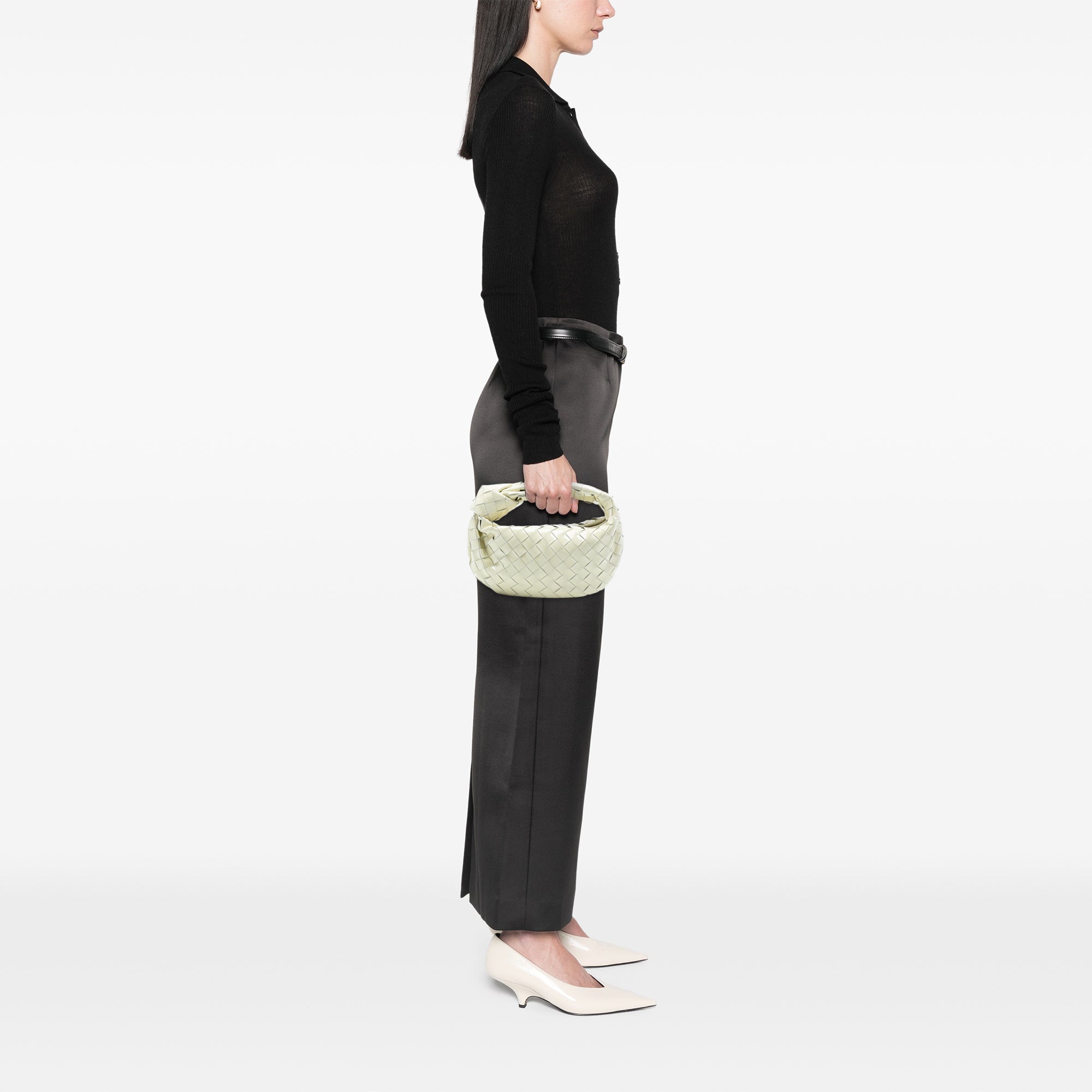 The Mini Jodie features a woven patent leather body, a knotted woven leather handle, and a top zip closure. Retail Price: 2620.00
