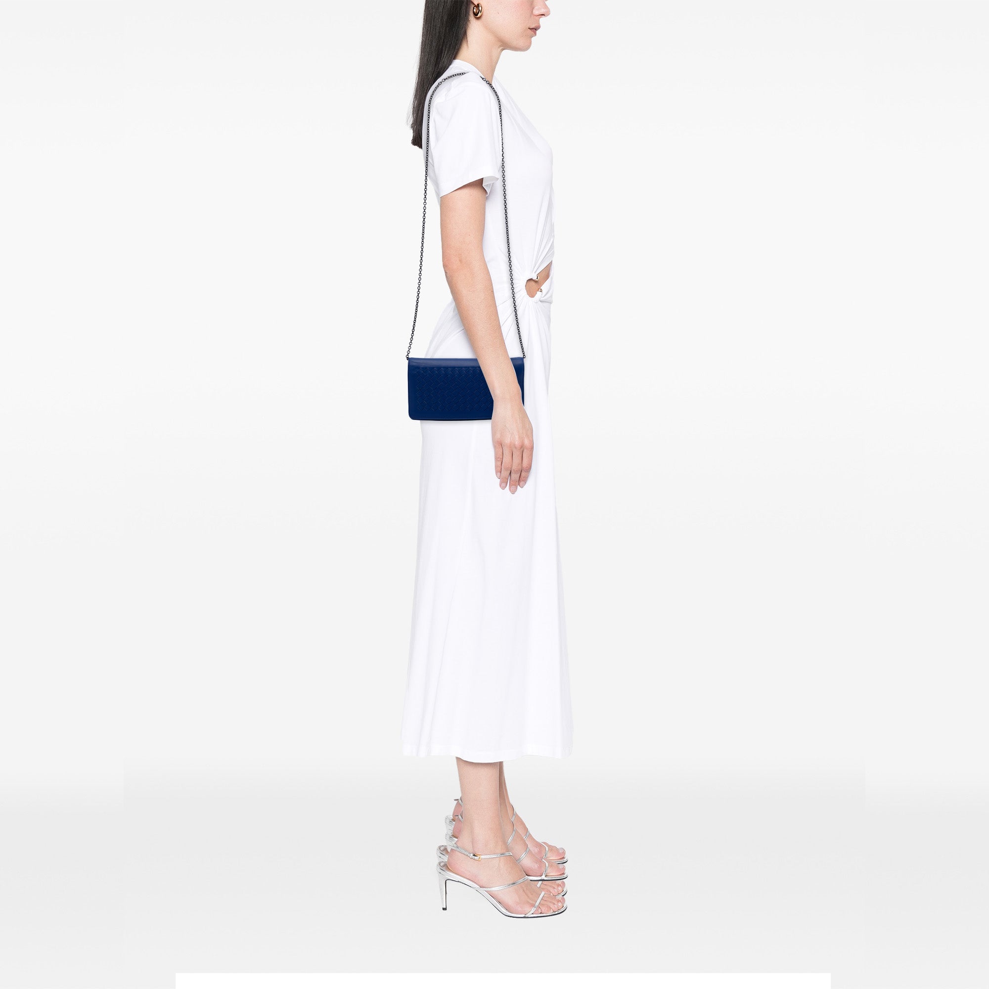 This crossbody bag features a woven nappa leather body, a chain link shoulder strap, a front flap with magnetic snap closure, and interior zip and slip compartments. Inclusion: Dust bag, box. Retail Price: 1075.00