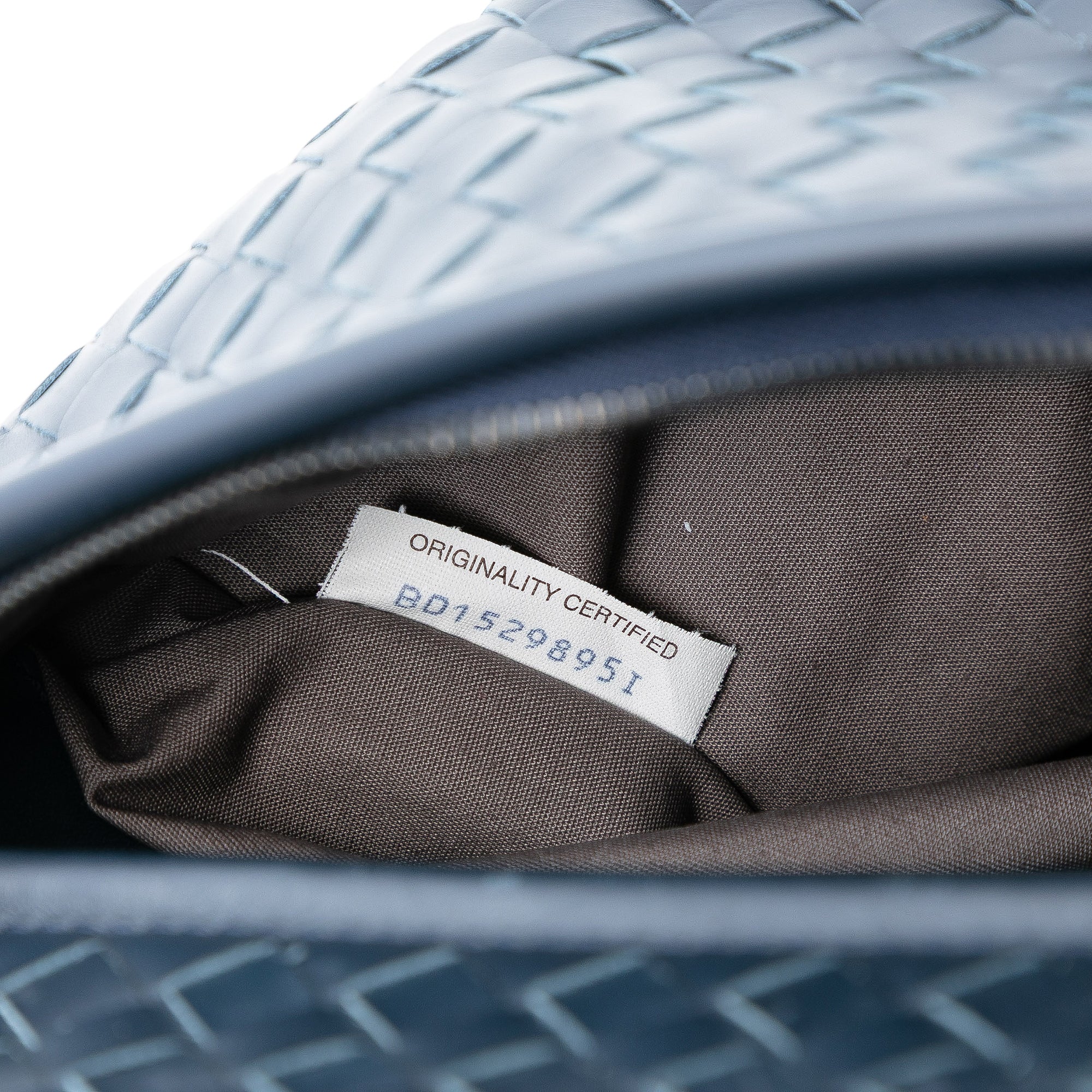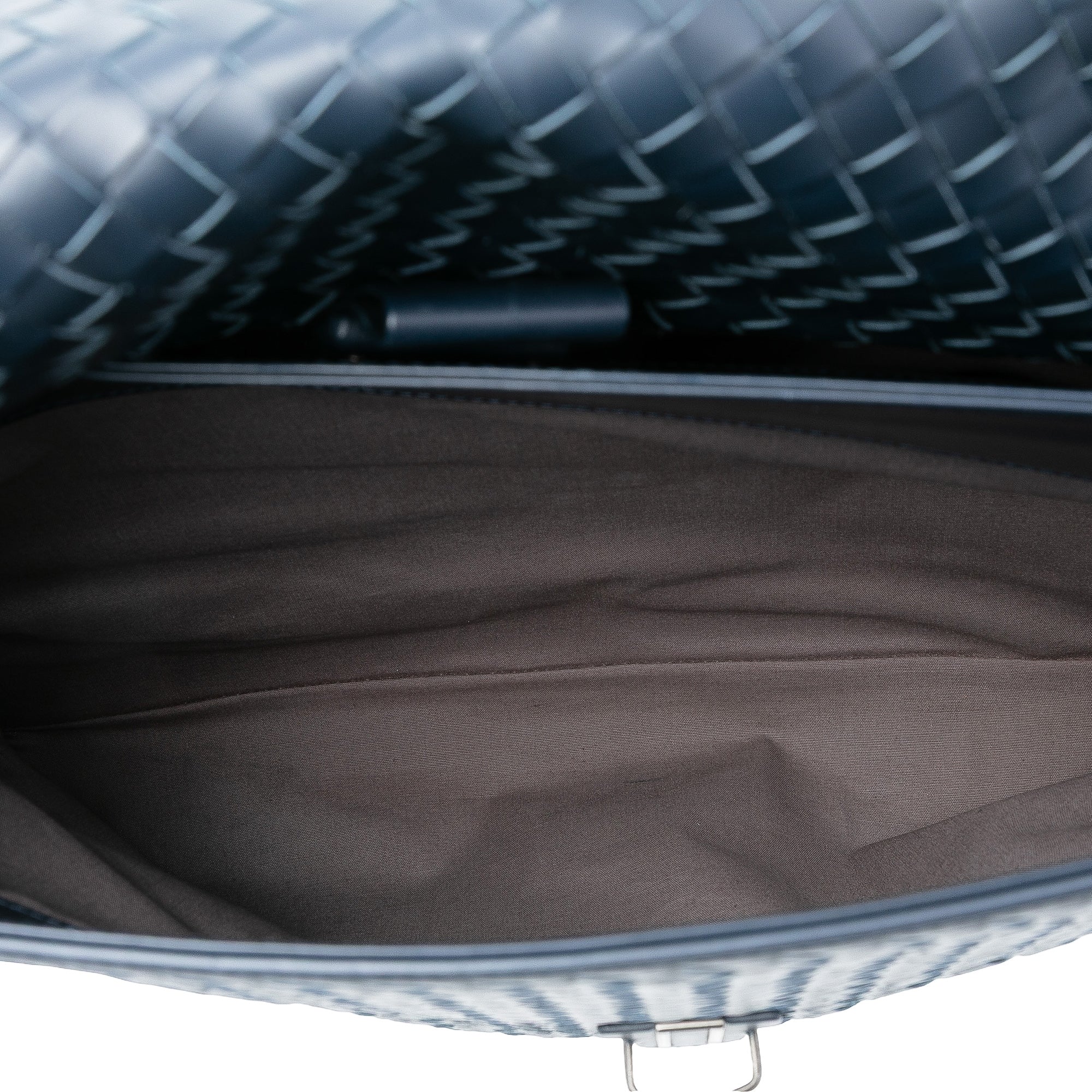 This business bag features a woven nappa leather body, a flat leather top handle, a front flap with a push lock closure, and an exterior back zip pocket. Retail Price: 2700.00