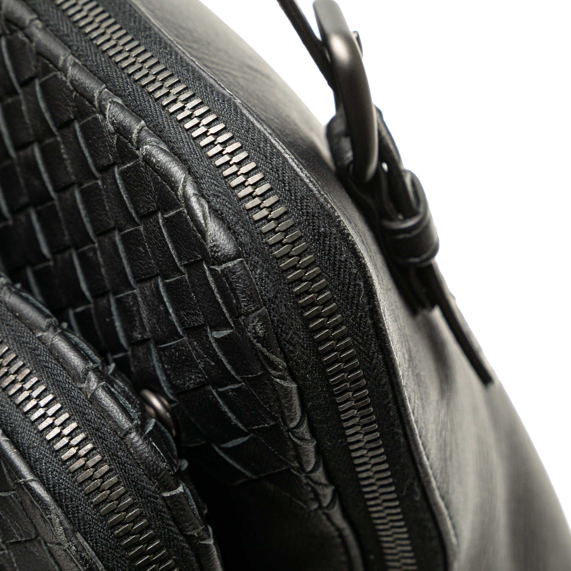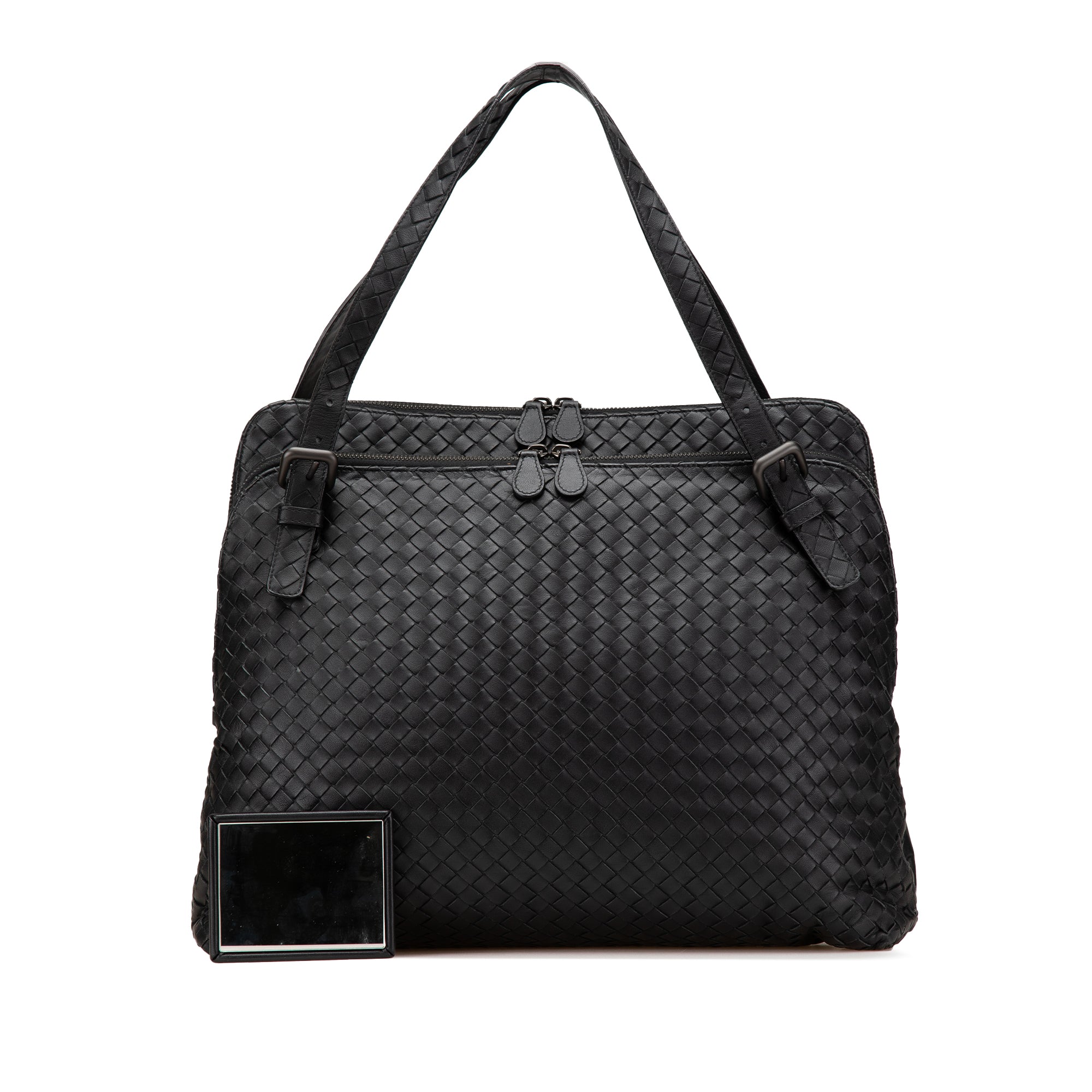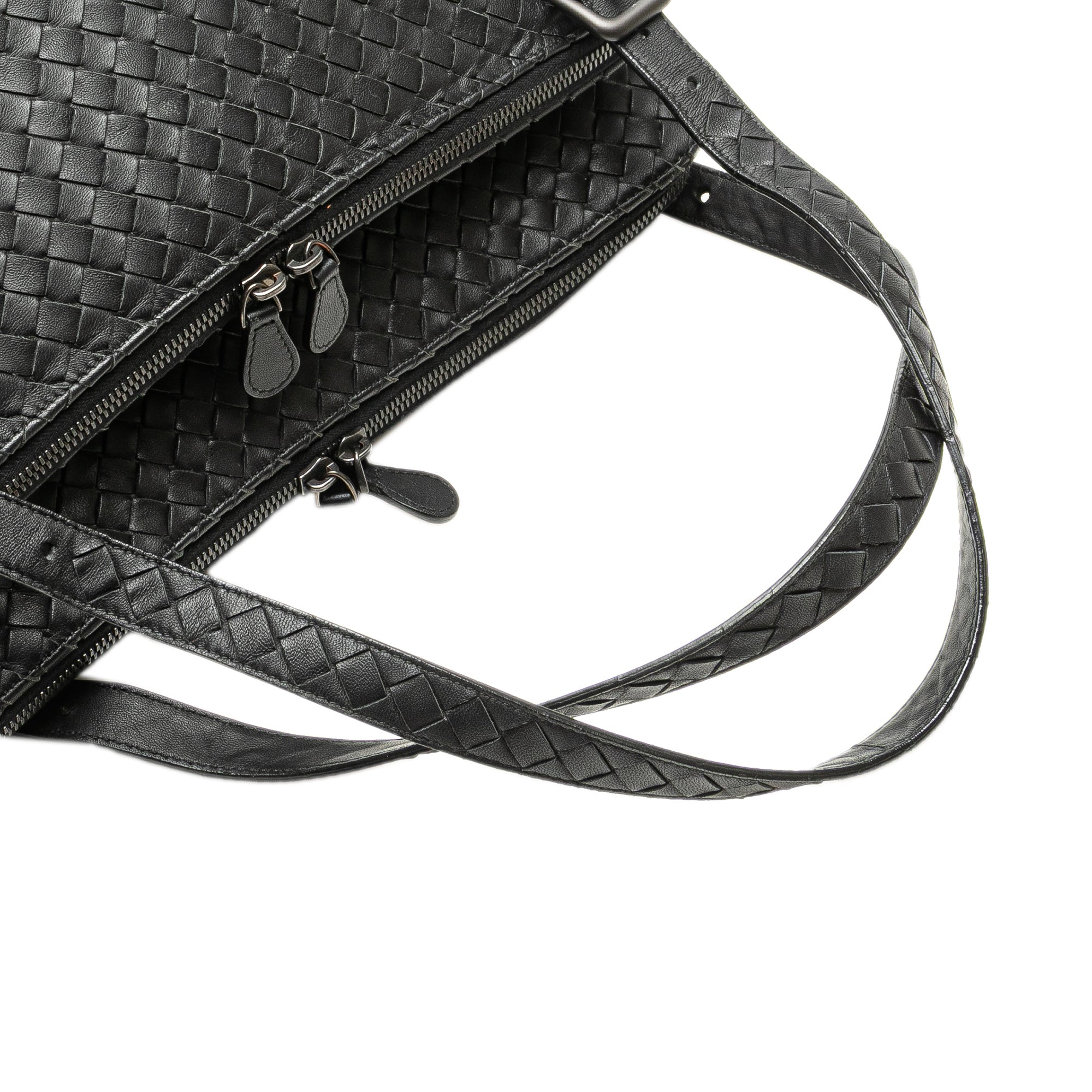 This business bag features a woven leather body, flat leather handles, a top zip closure, an exterior front zip pocket, and an interior slip pocket. Retail Price: 1045.00