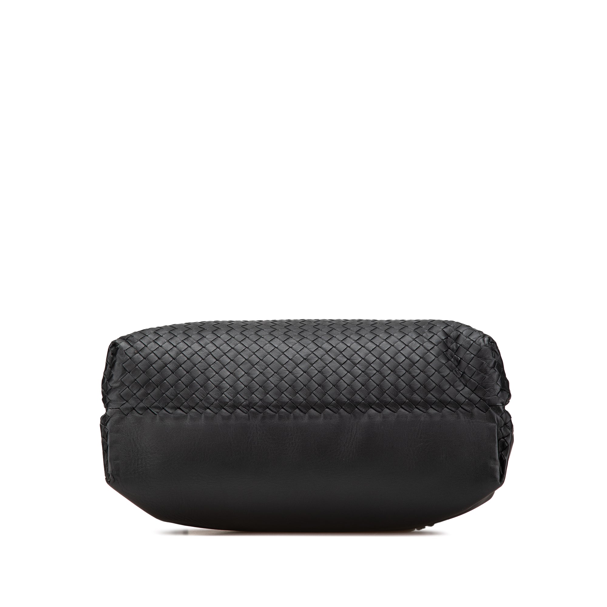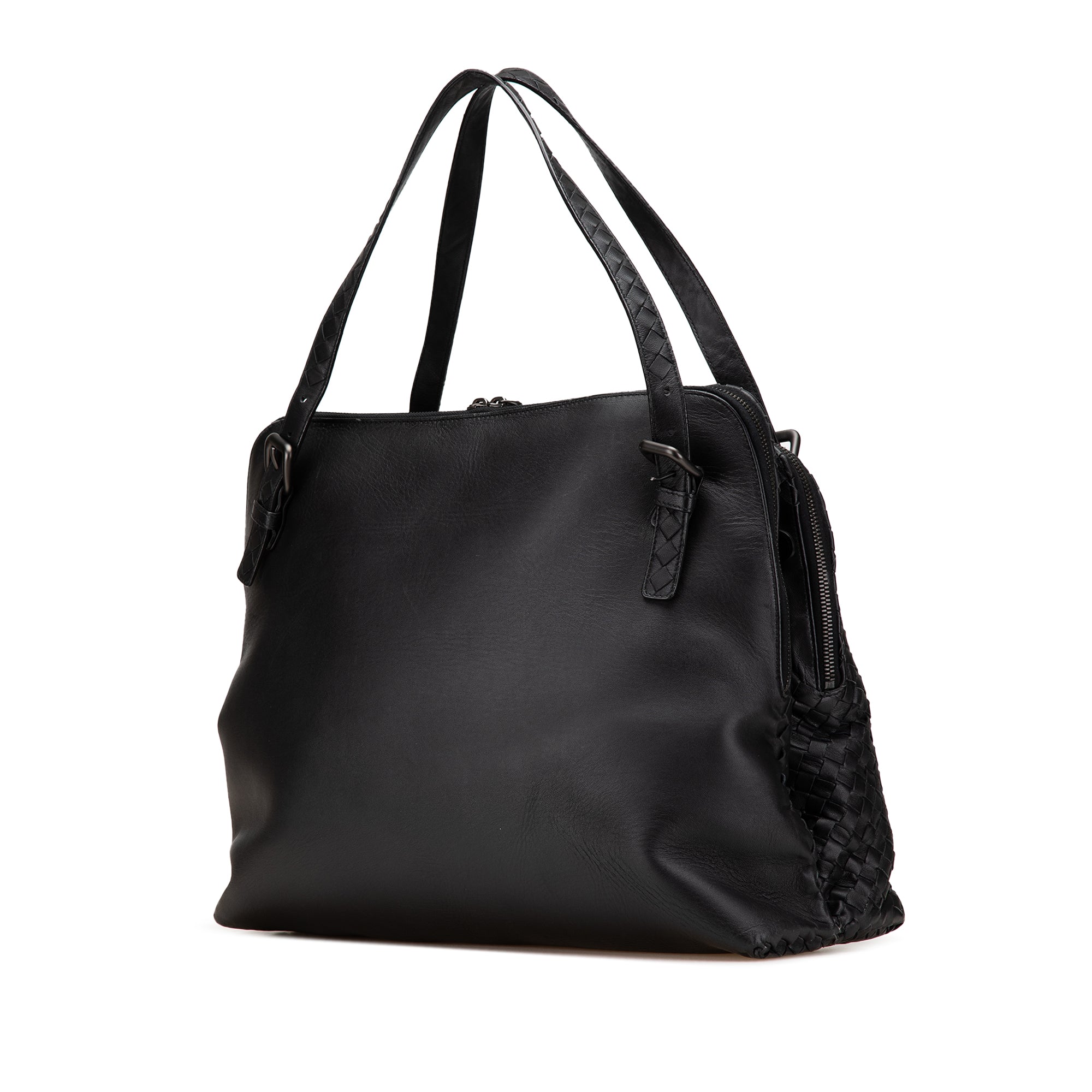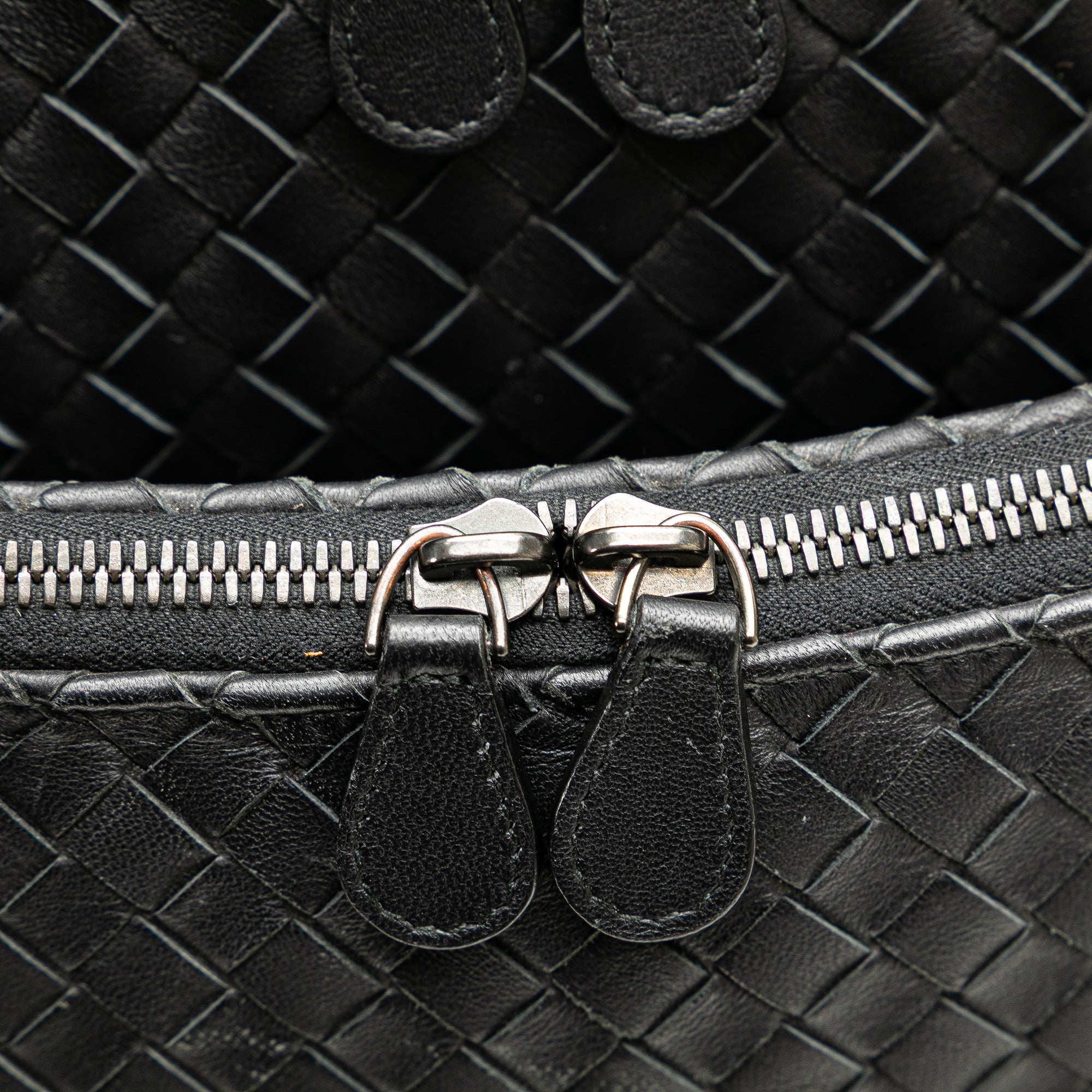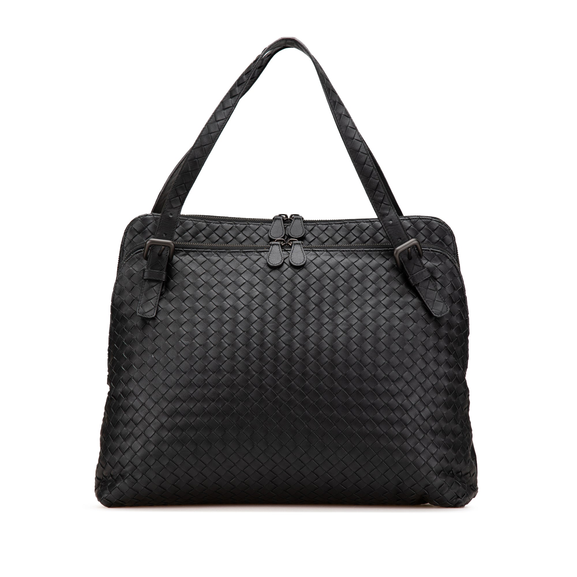This business bag features a woven leather body, flat leather handles, a top zip closure, an exterior front zip pocket, and an interior slip pocket. Retail Price: 1045.00