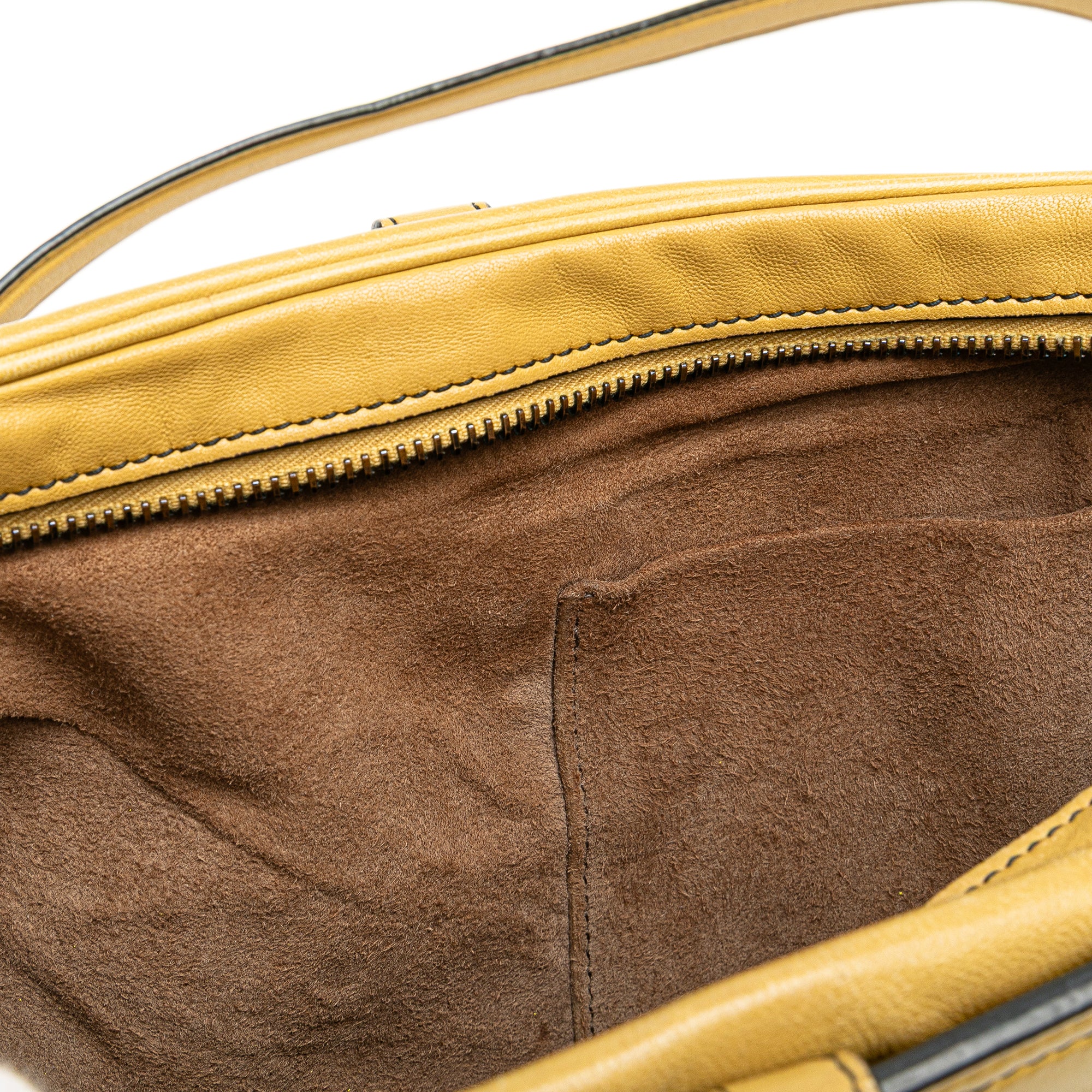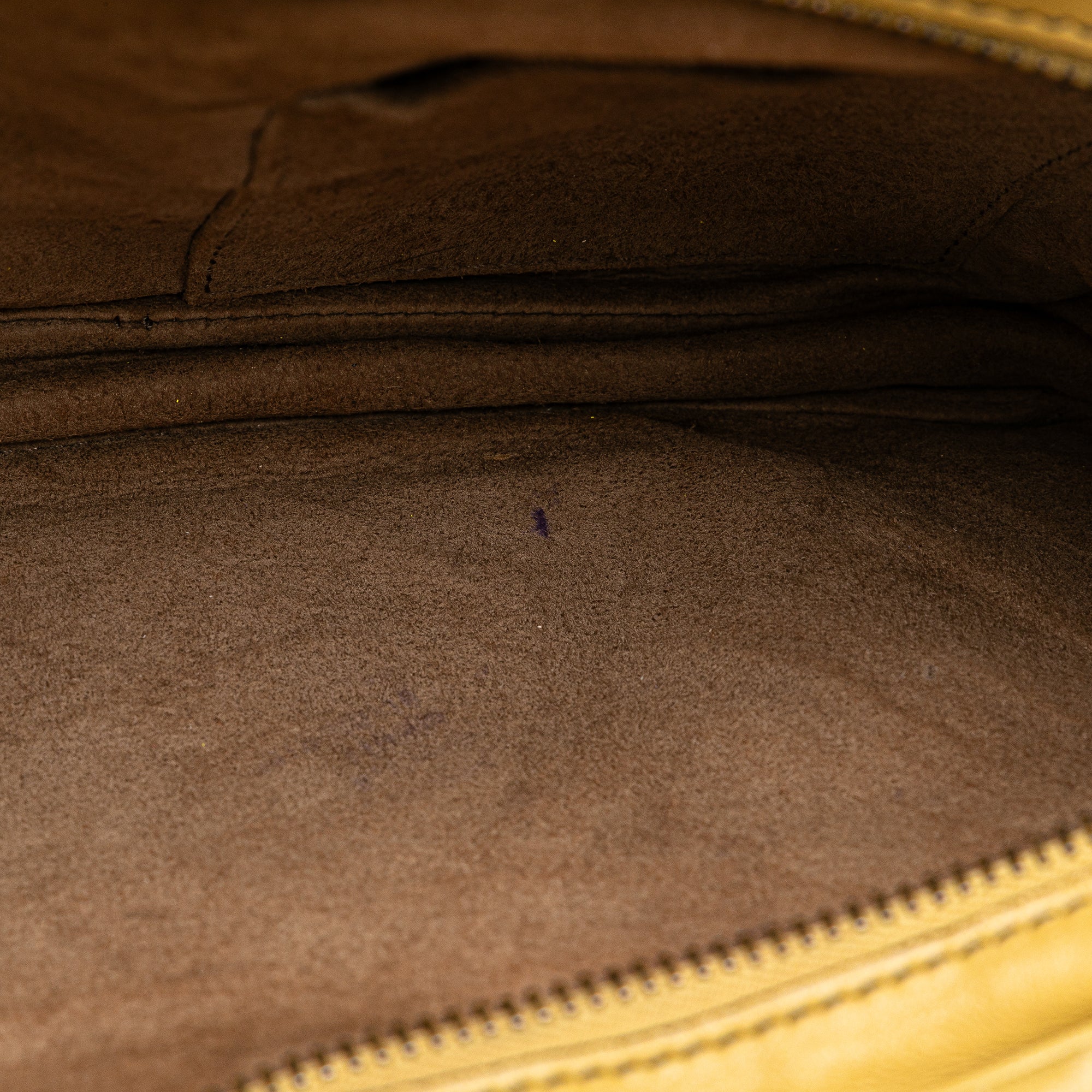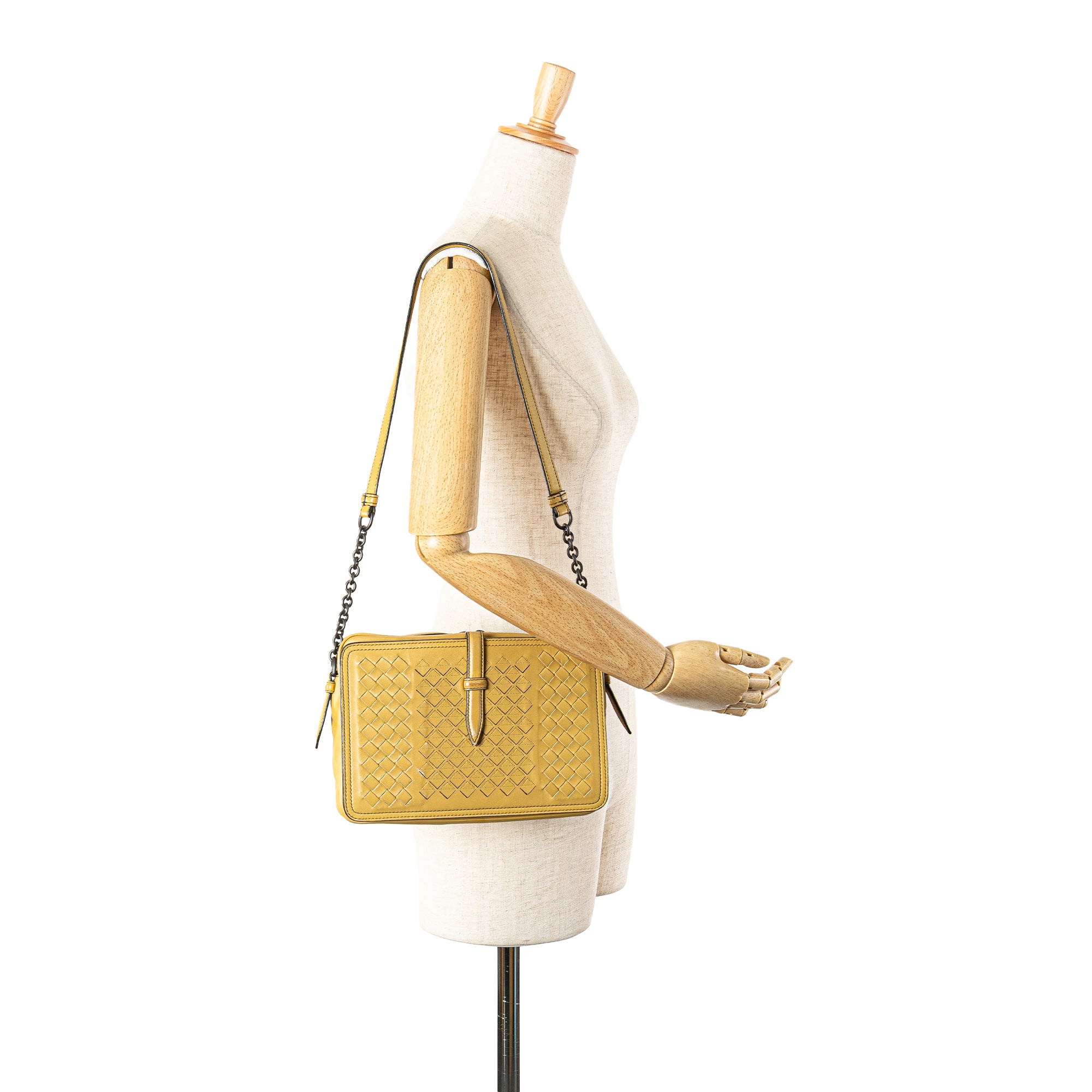 This shoulder bag features a woven nappa leather body, a chain and leather shoulder strap, exterior front and back compartments with top strap closures, a top zip closure, and an interior slip pocket. Retail Price: 2400.00