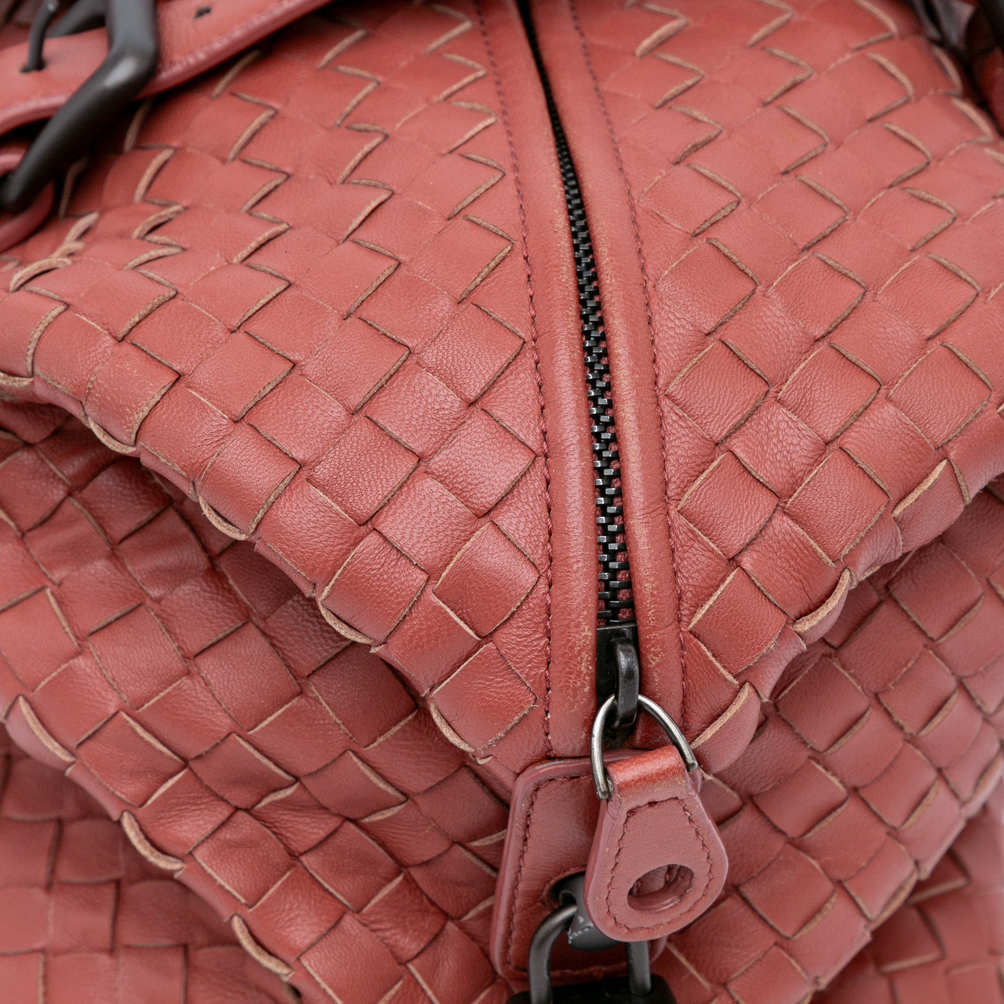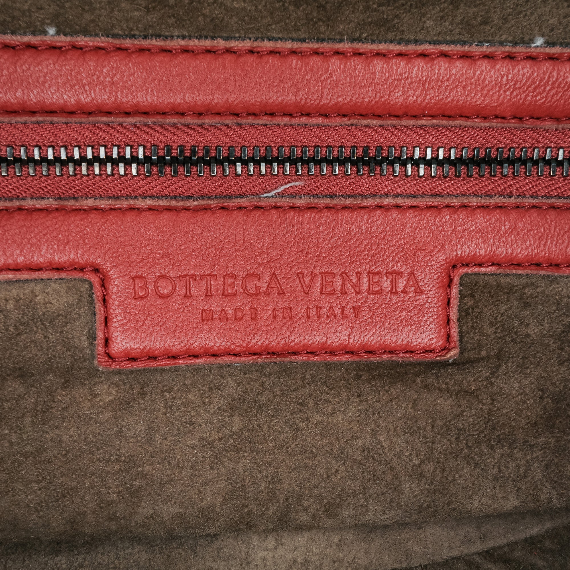 This shoulder bag features a woven leather body, flat leather straps, a top zip closure, and interior zip and slip pockets. Retail Price: 2400.00