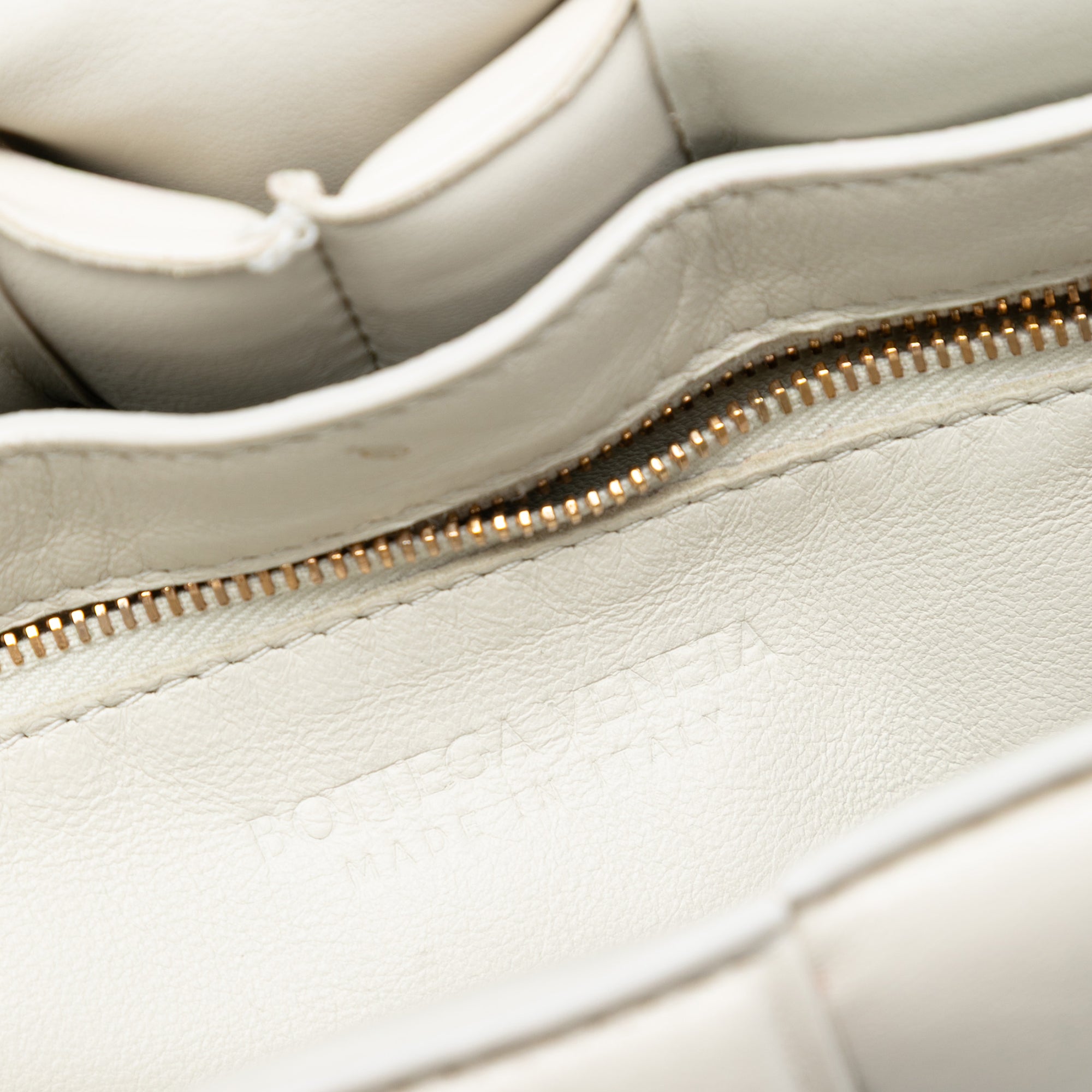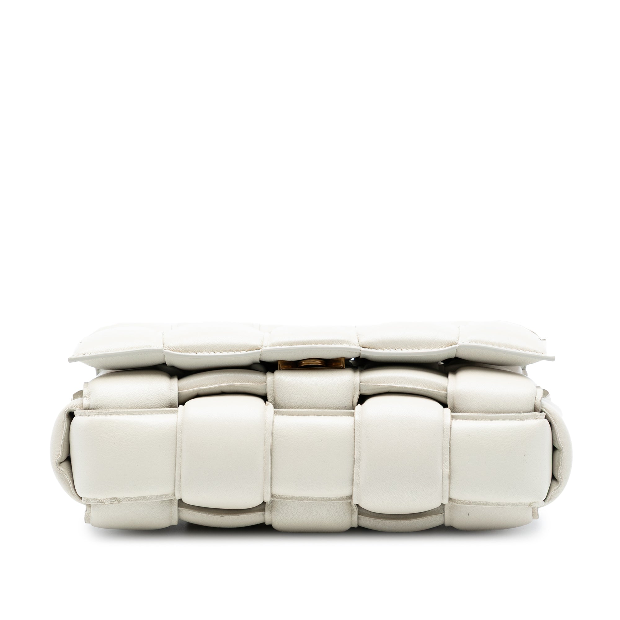 The Padded Cassette features a woven nappa leather body, a flat leather strap, a front flap with a clasp closure, and an interior zip pocket. Retail Price: 4500.00