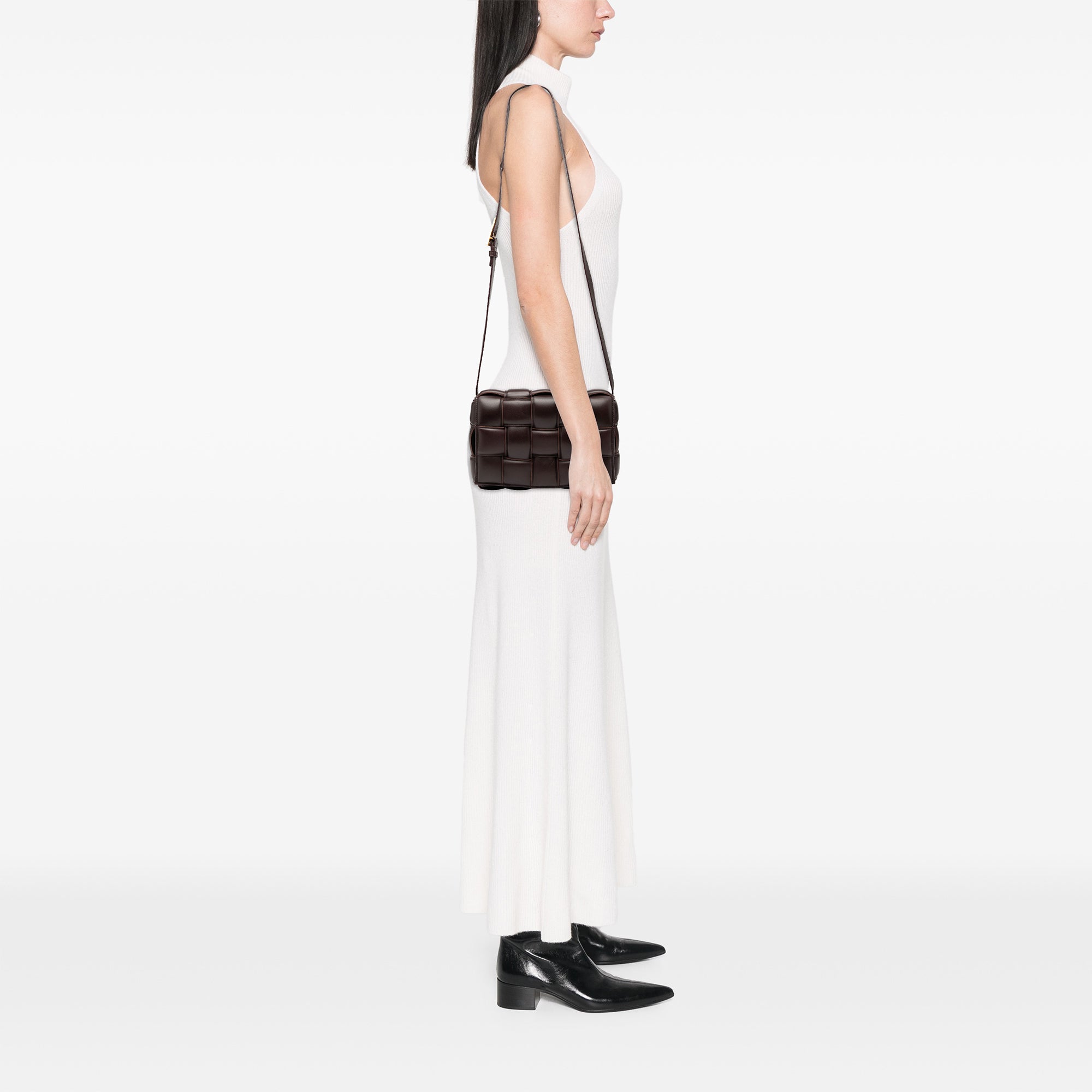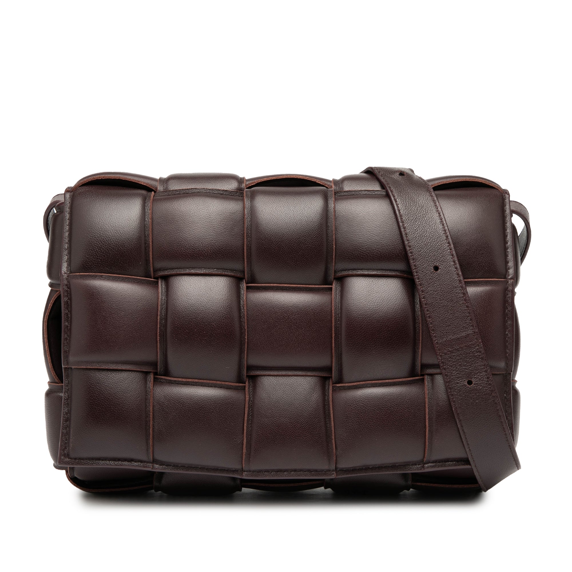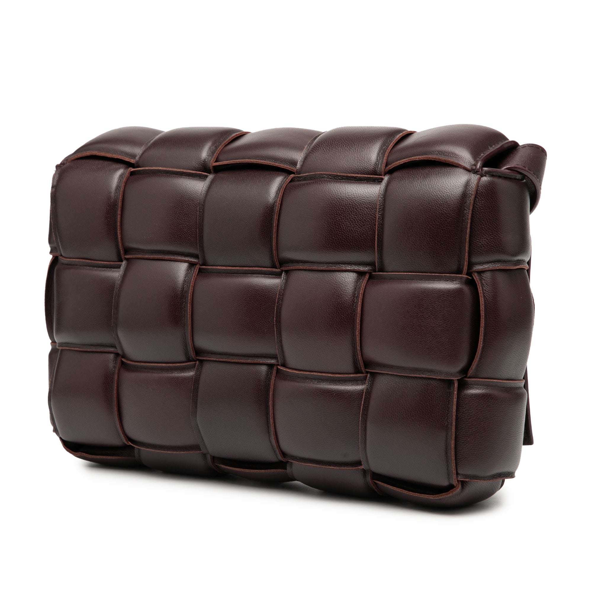 The Padded Cassette features a woven nappa leather body, an adjustable flat leather shoulder strap, a flap with push lock closure, and an interior zip pocket. Retail Price: 4075.00