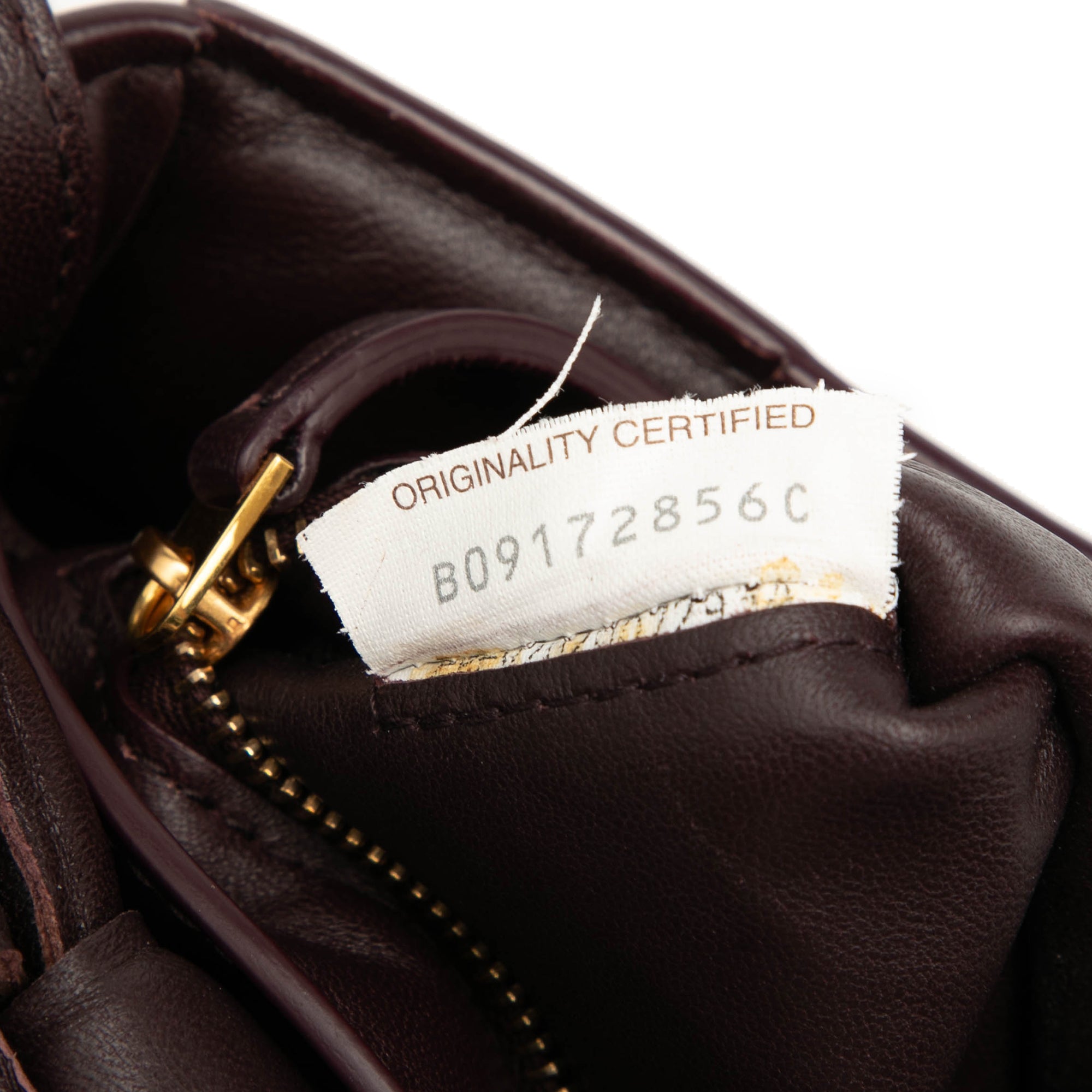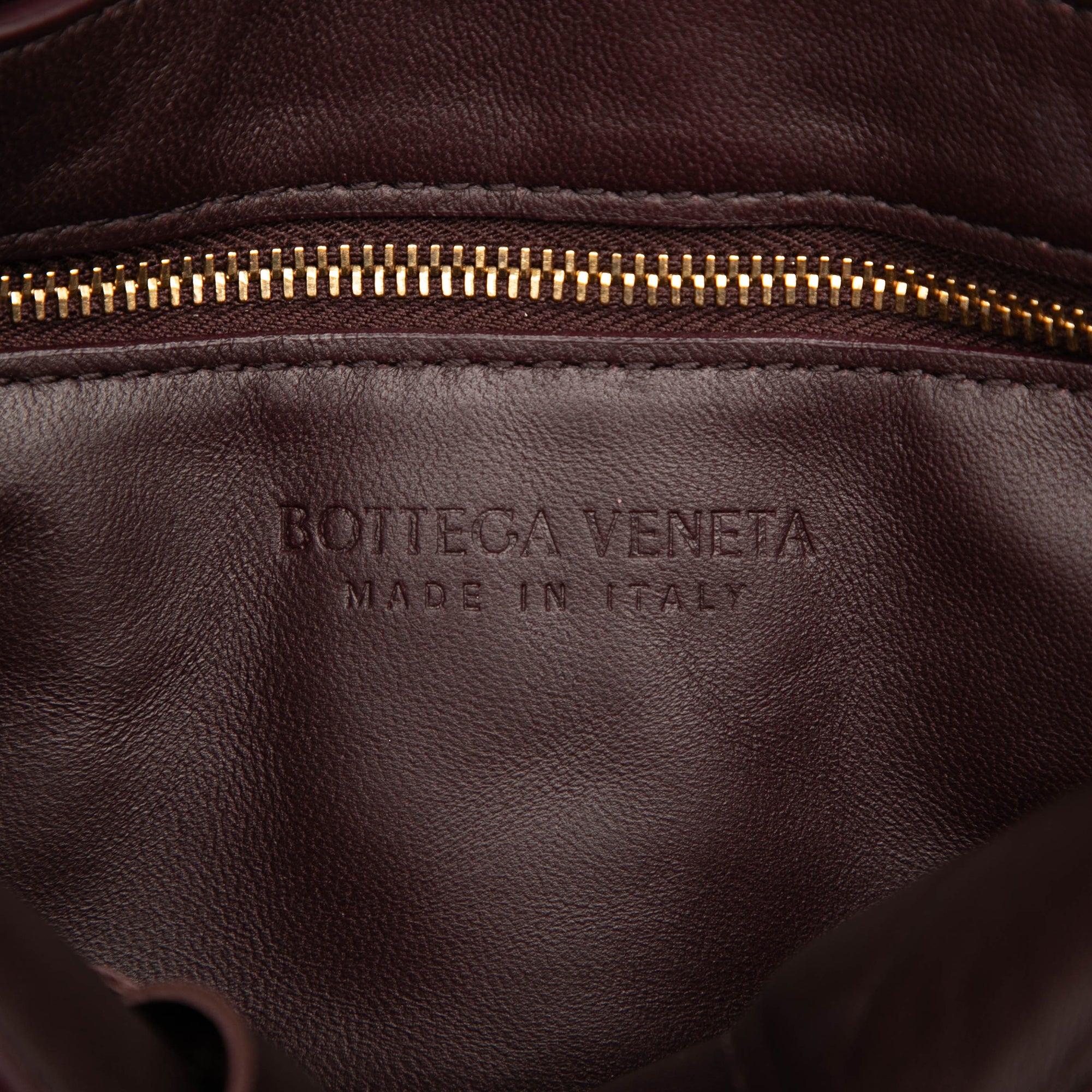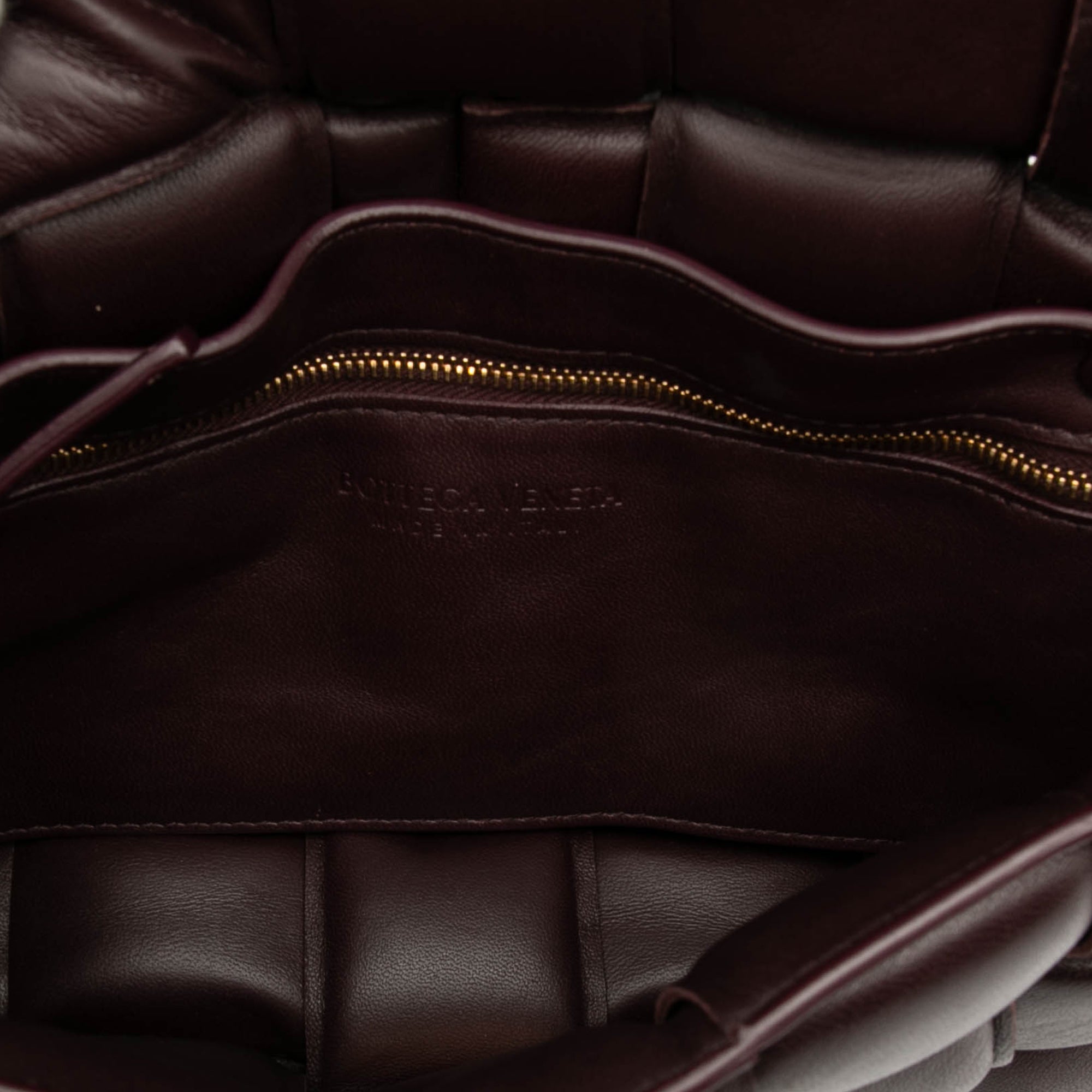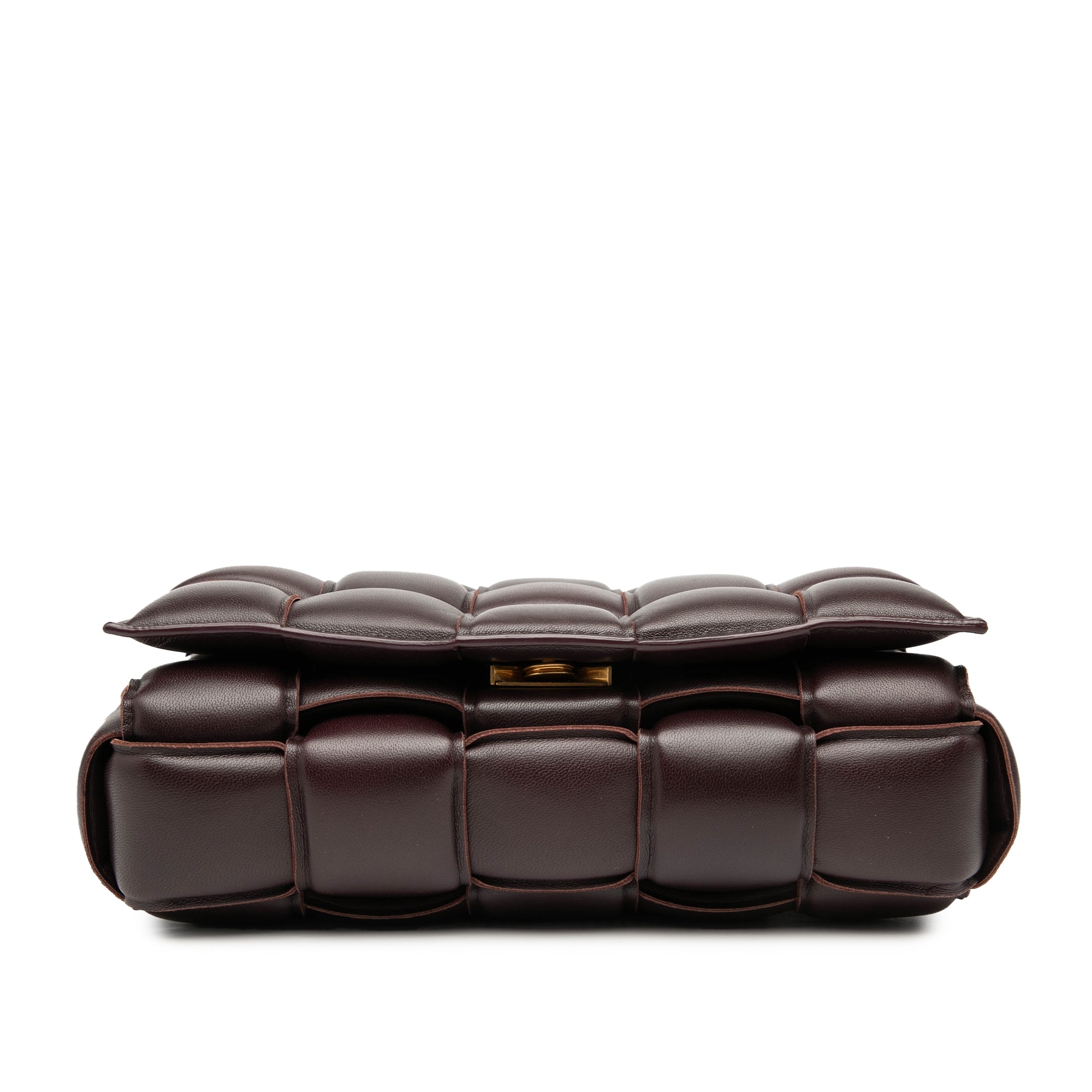 The Padded Cassette features a woven nappa leather body, an adjustable flat leather shoulder strap, a flap with push lock closure, and an interior zip pocket. Retail Price: 4075.00