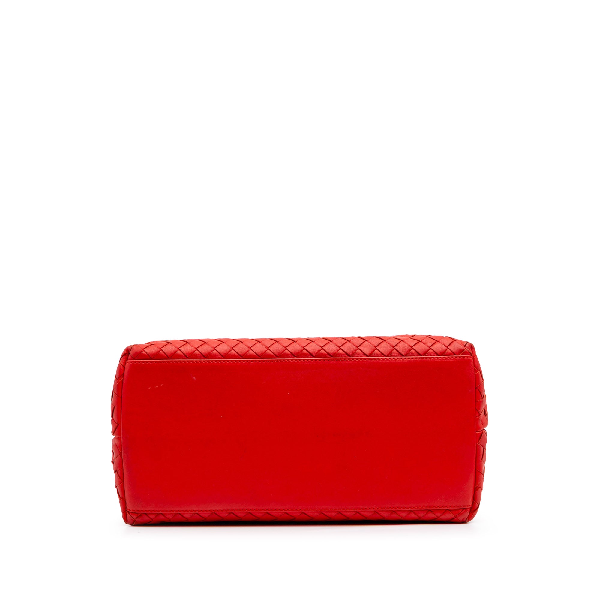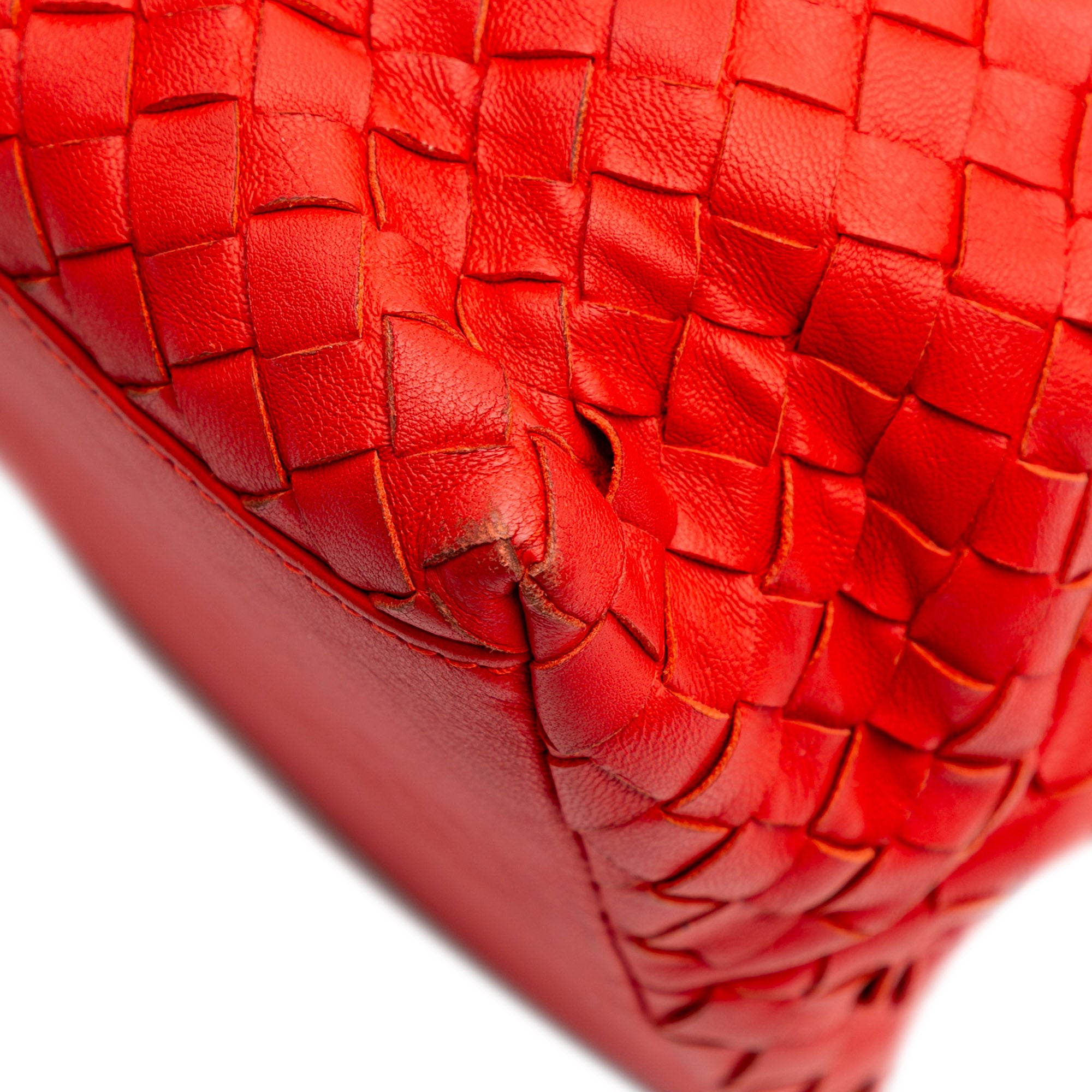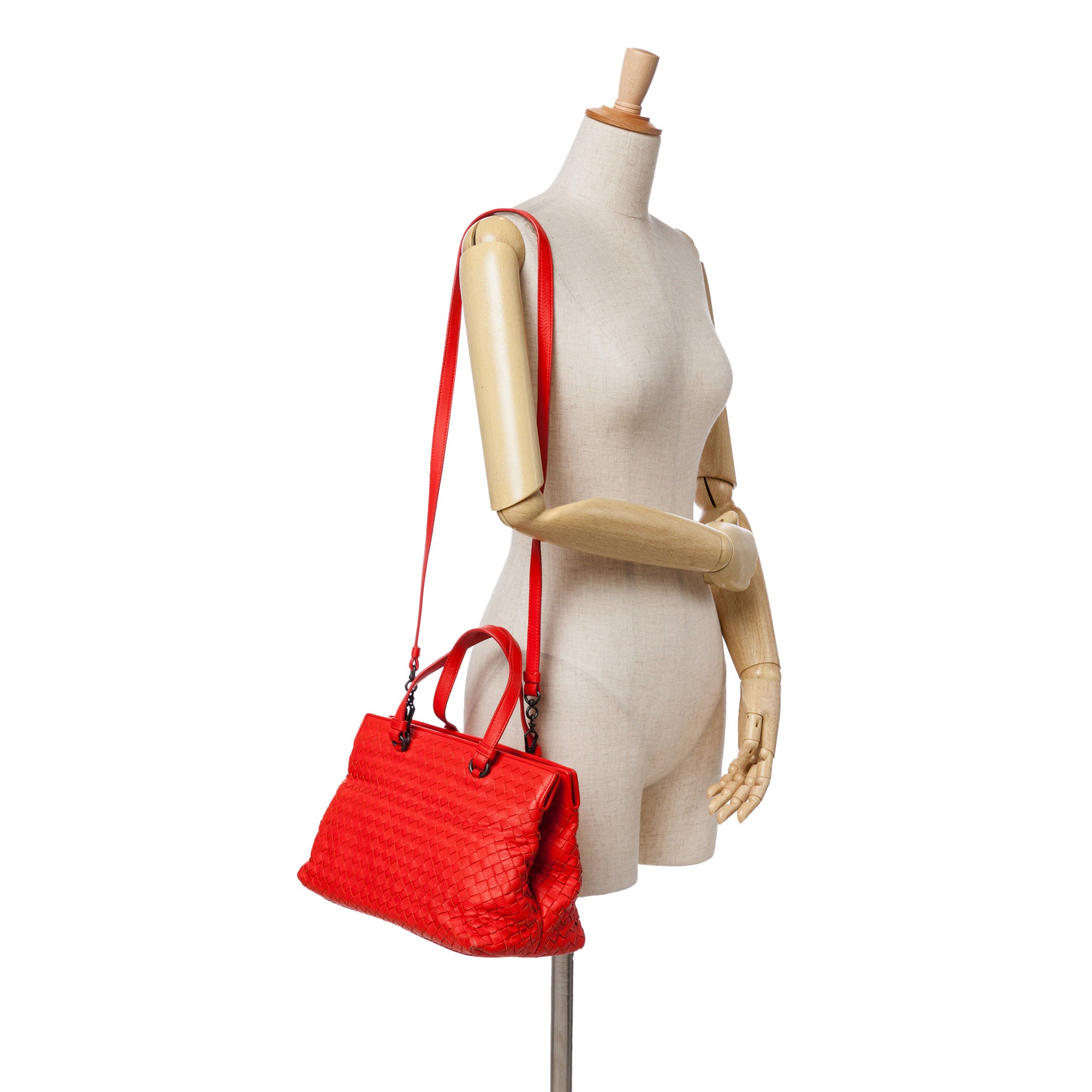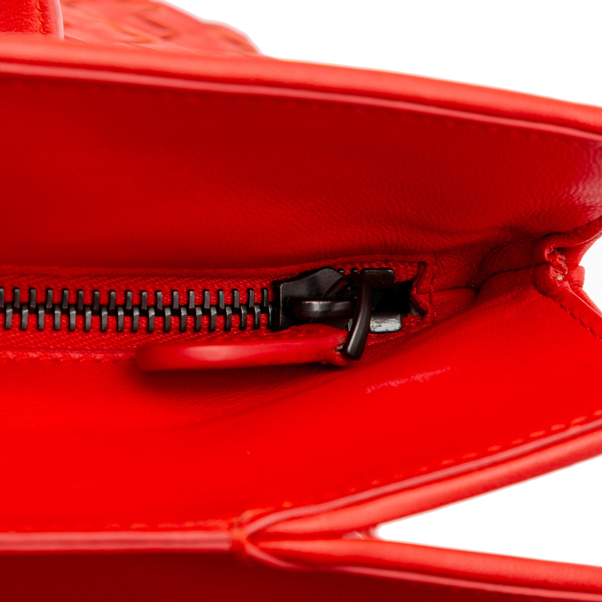 This satchel features a woven nappa leather body, flat leather handles, a detachable flat strap, a top zip closure, and an interior zip pocket. Retail Price: 1805.00